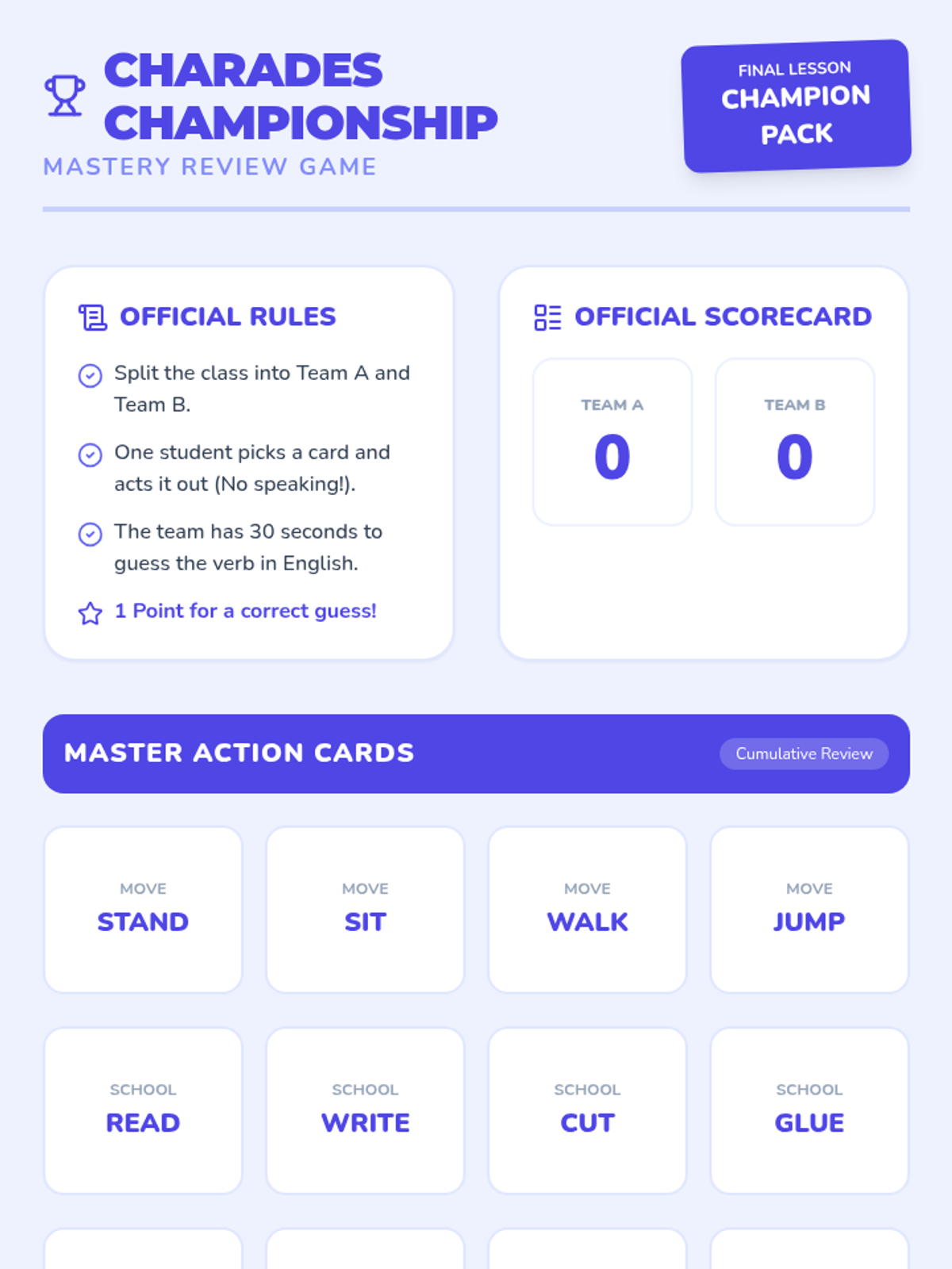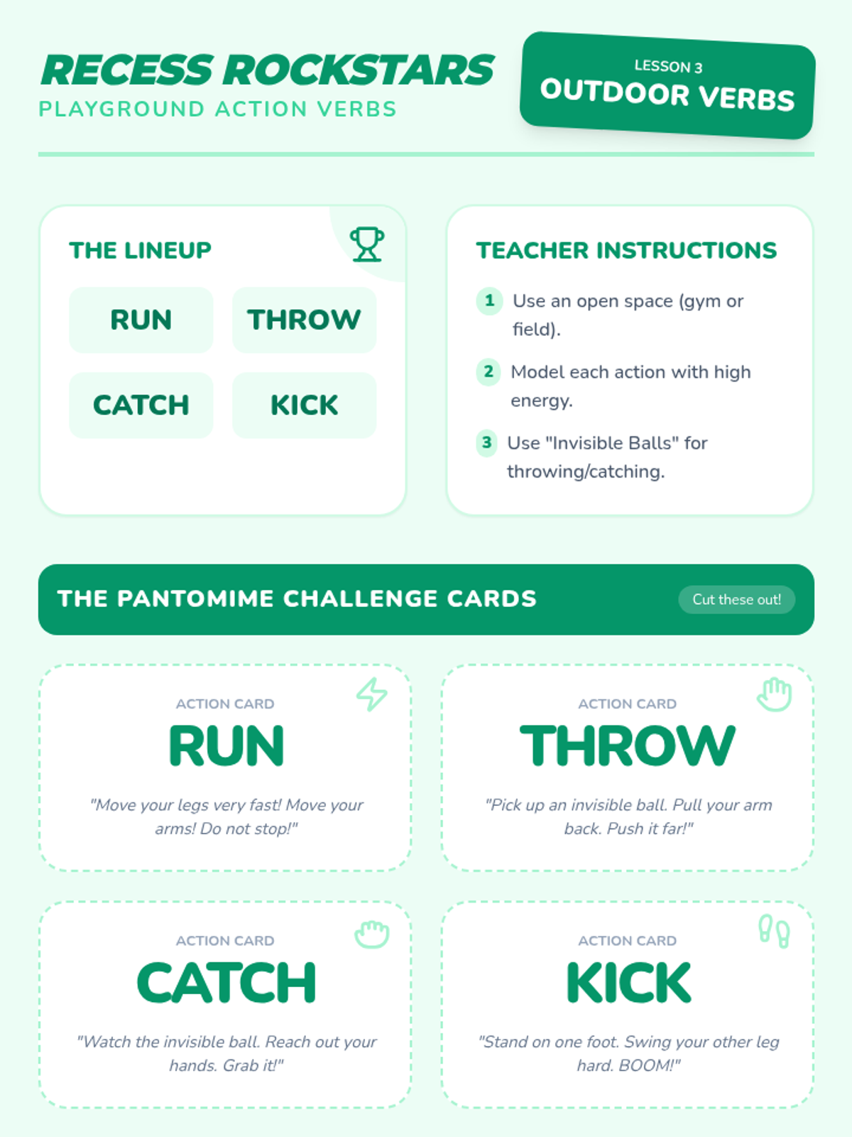 A high-energy ESL sequence for 2nd graders that uses Total Physical Response (TPR) and games to teach common action verbs, connecting movement directly to English vocabulary.