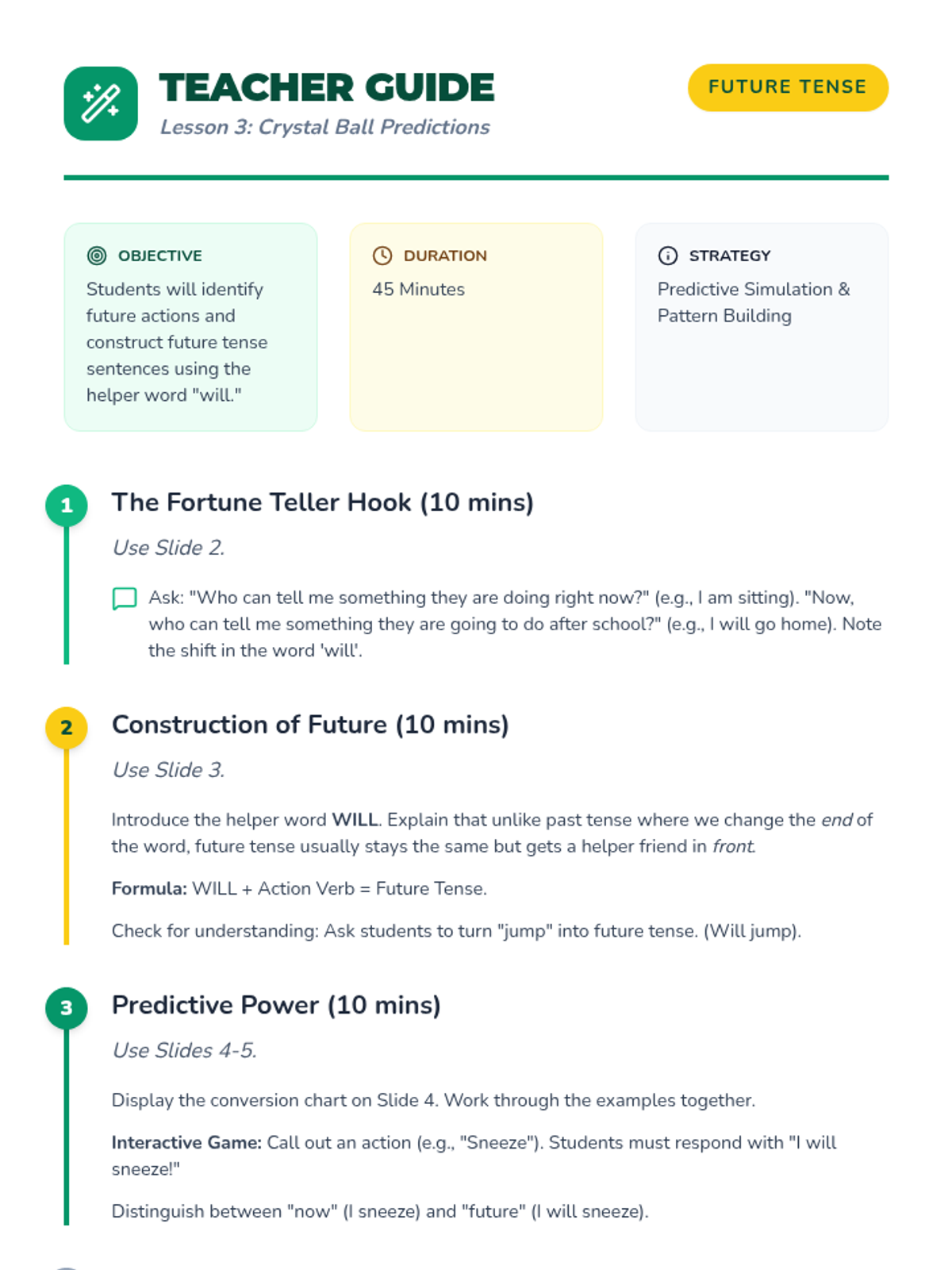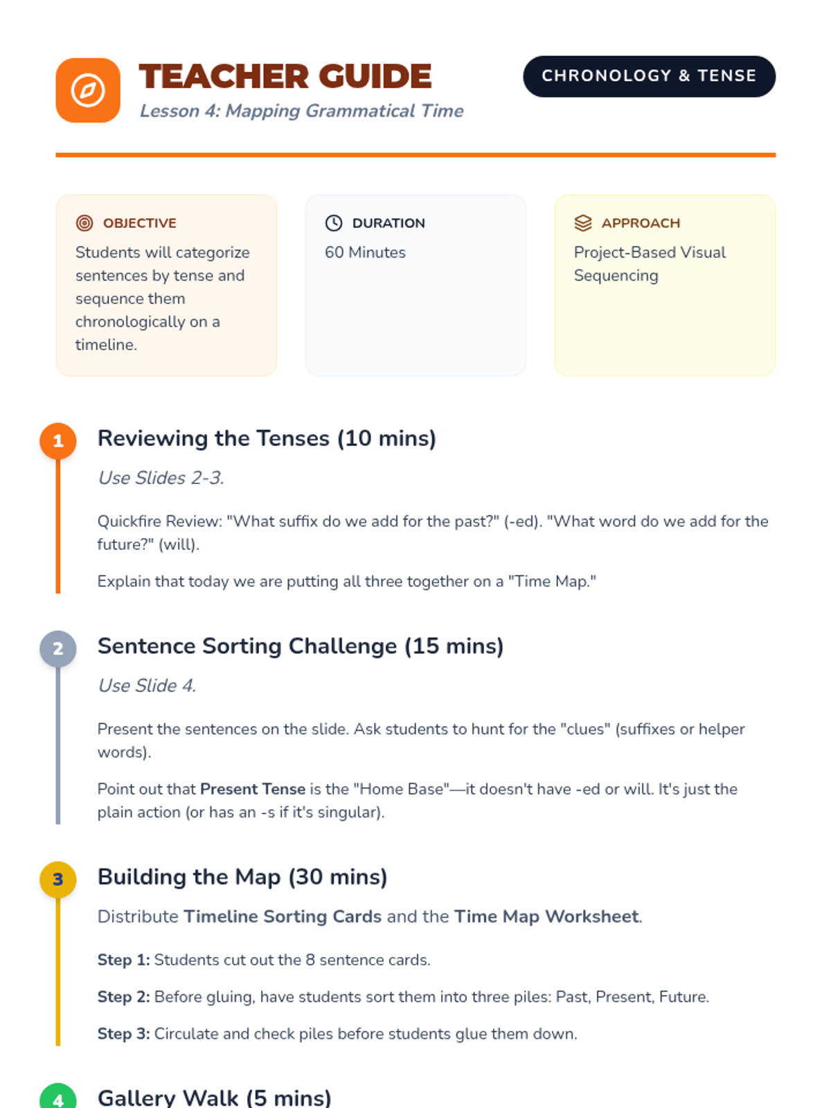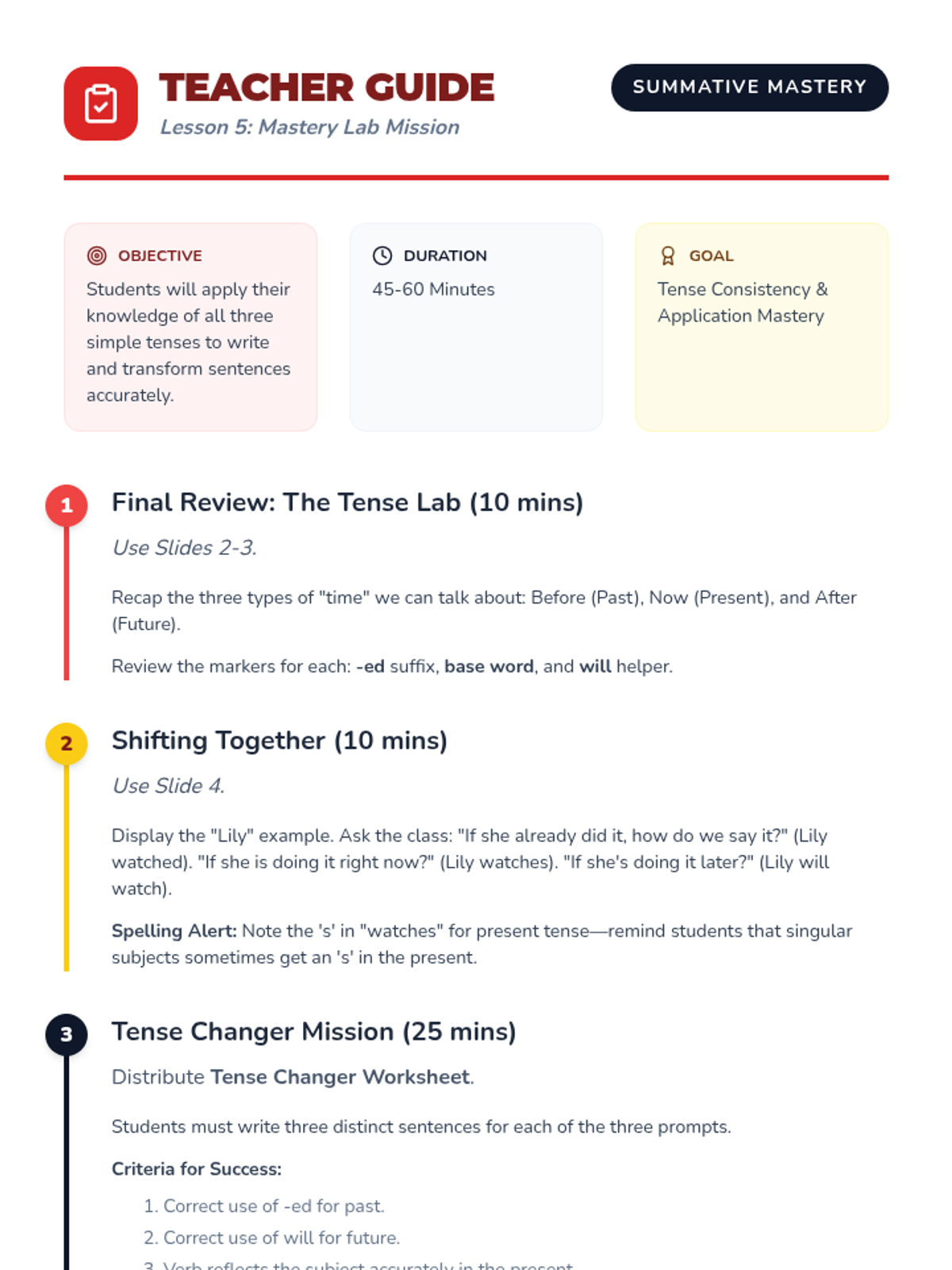 A 5-lesson 2nd Grade grammar sequence focusing on identifying action verbs and mastering past, present, and future tenses through interactive games, timeline creation, and sentence transformation.