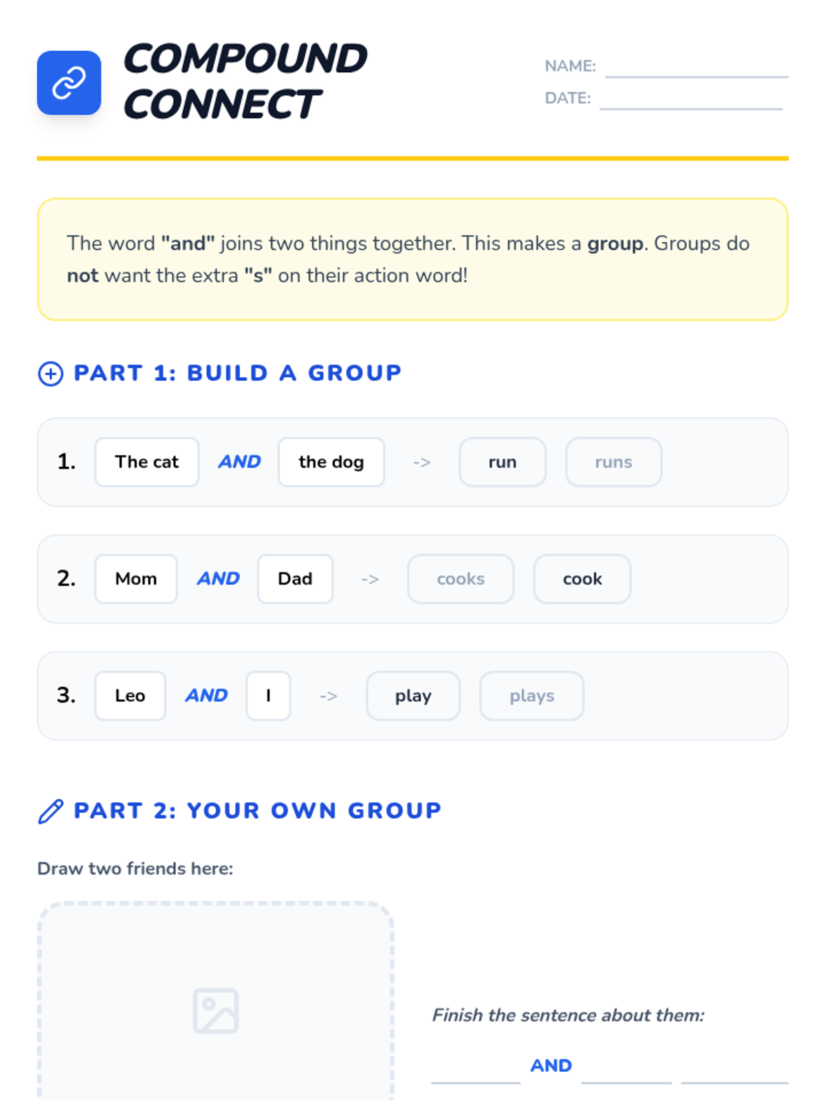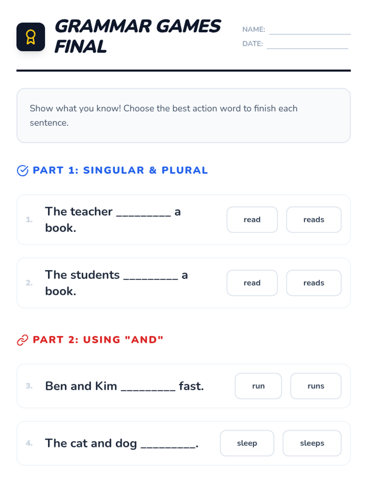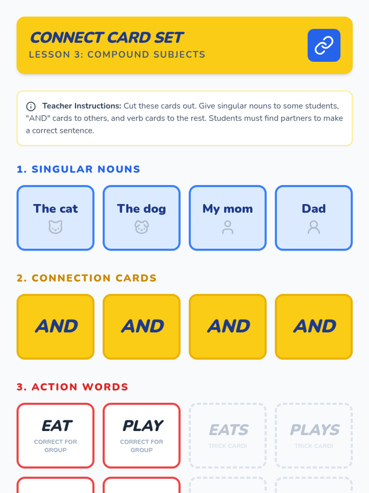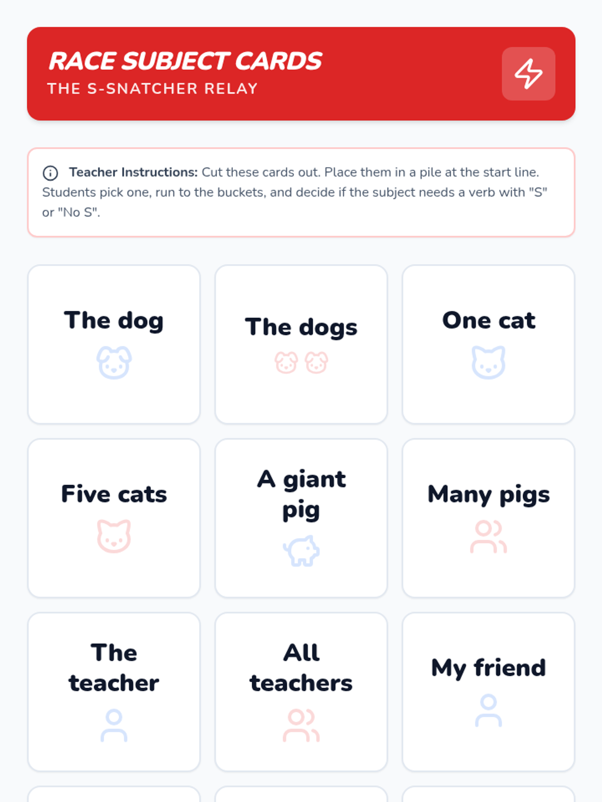 A high-energy, game-based sequence for 1st graders to master subject-verb agreement through movement, rapid-fire sorting, and collaborative play. Students learn to match singular, plural, and compound subjects with their correct verb forms in a series of 'Grammar Games'.