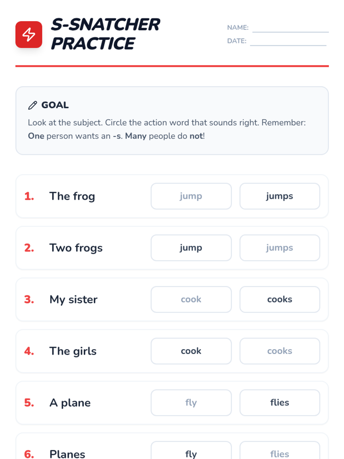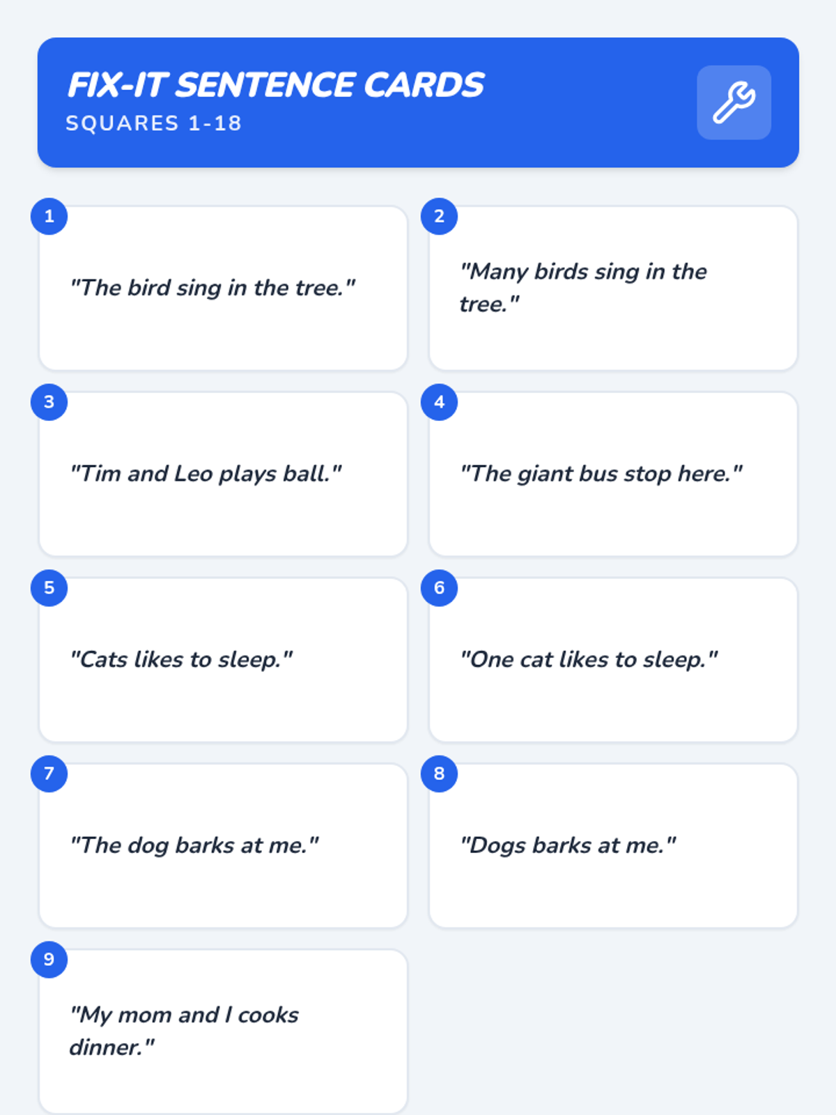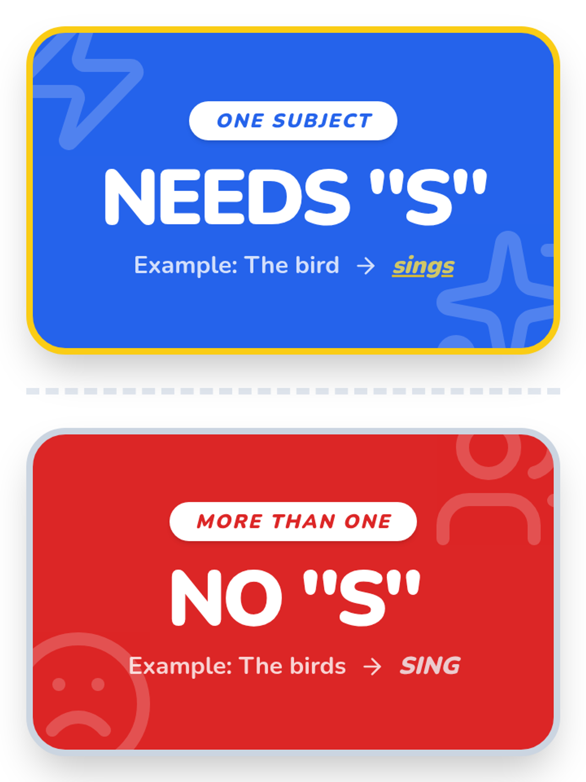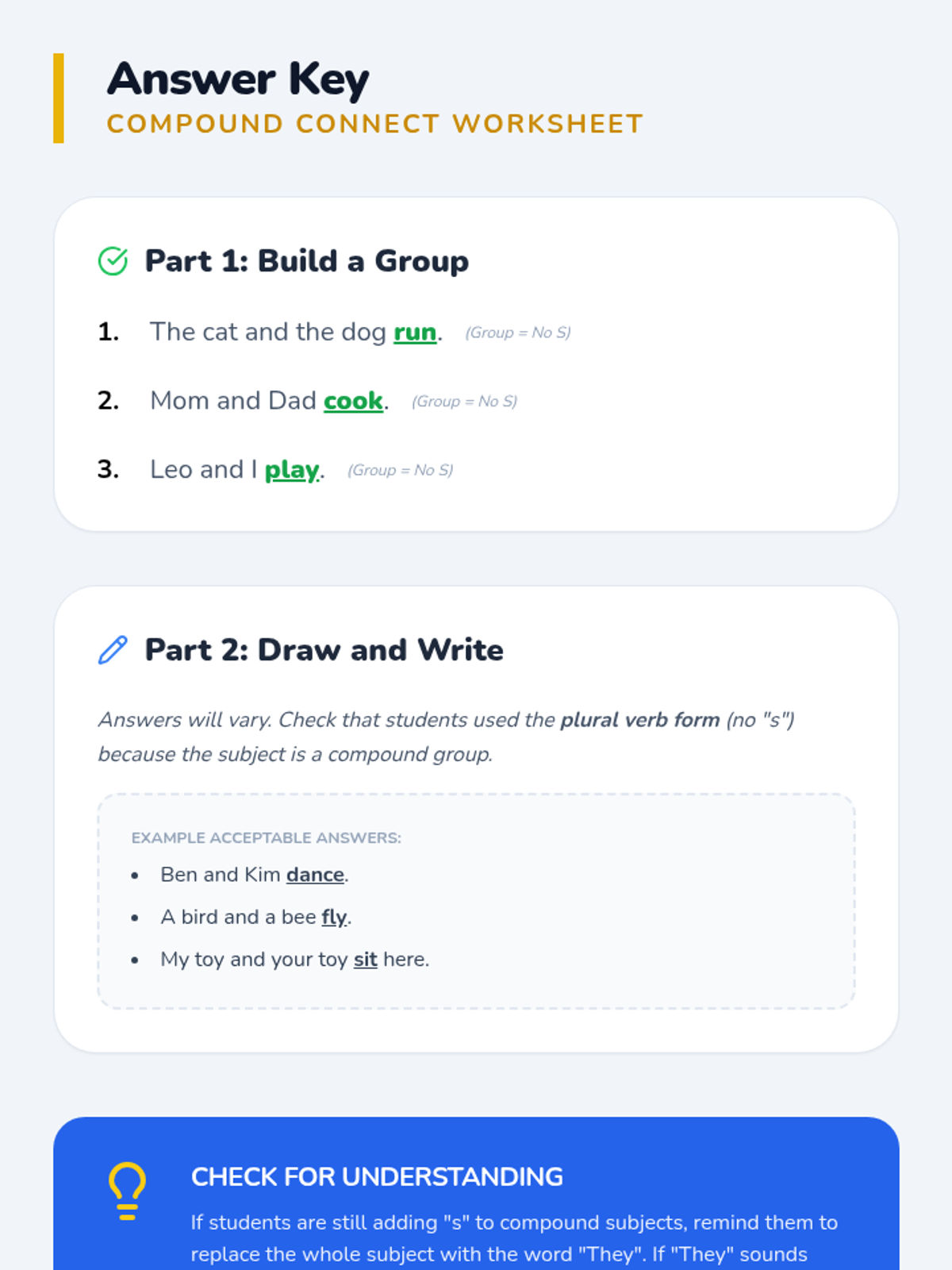 A high-energy, game-based sequence for 1st graders to master subject-verb agreement through movement, rapid-fire sorting, and collaborative play. Students learn to match singular, plural, and compound subjects with their correct verb forms in a series of 'Grammar Games'.