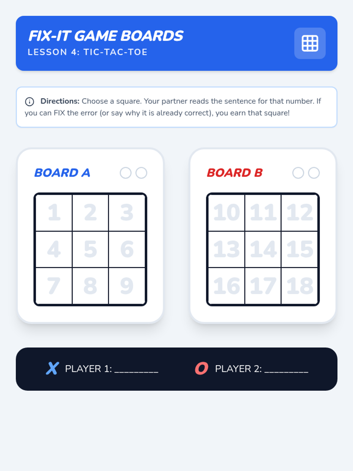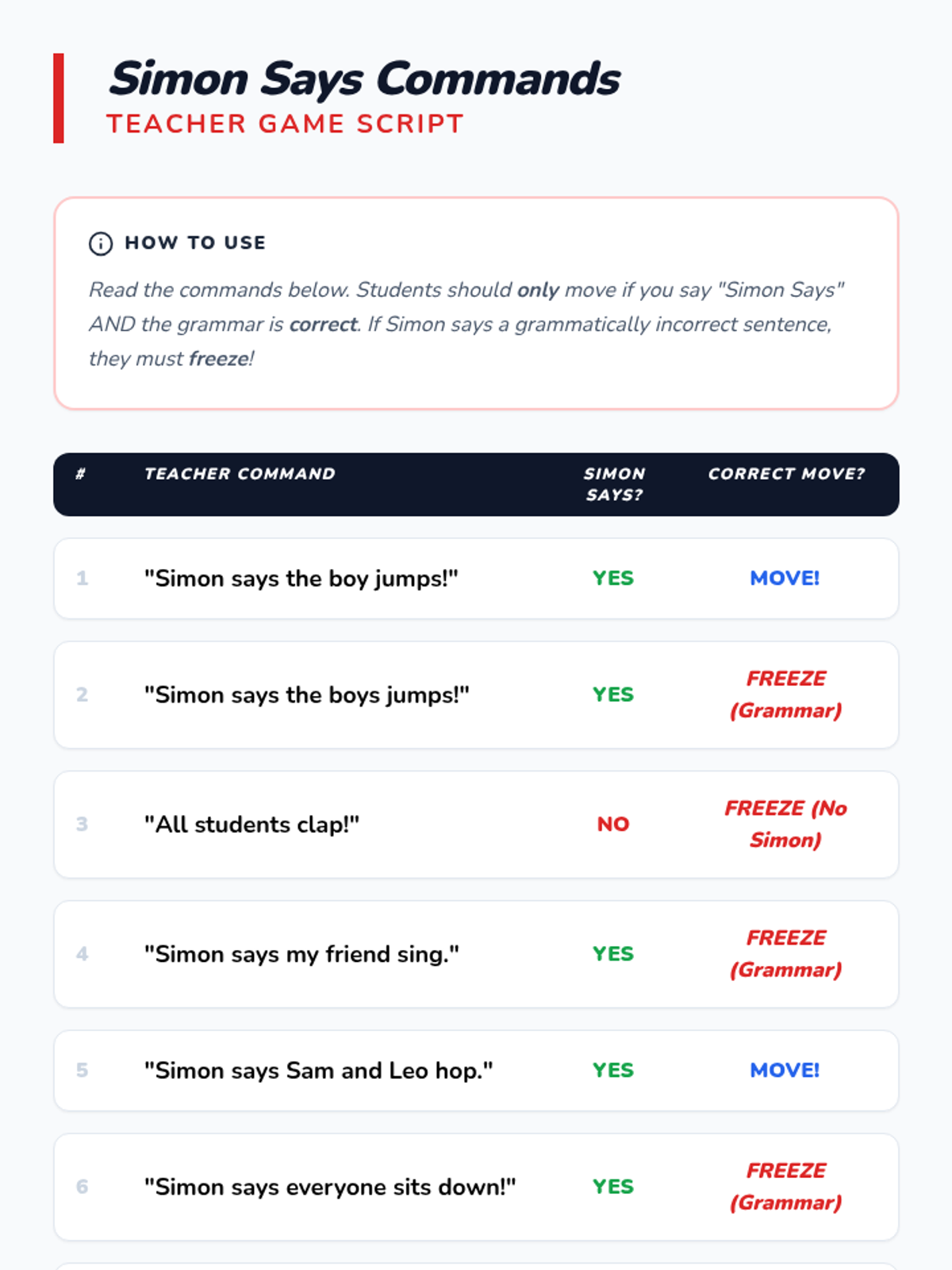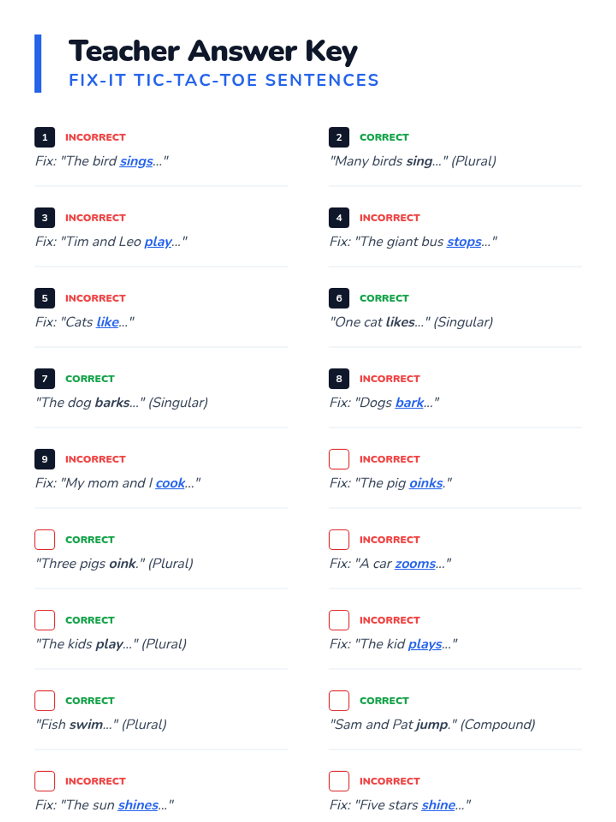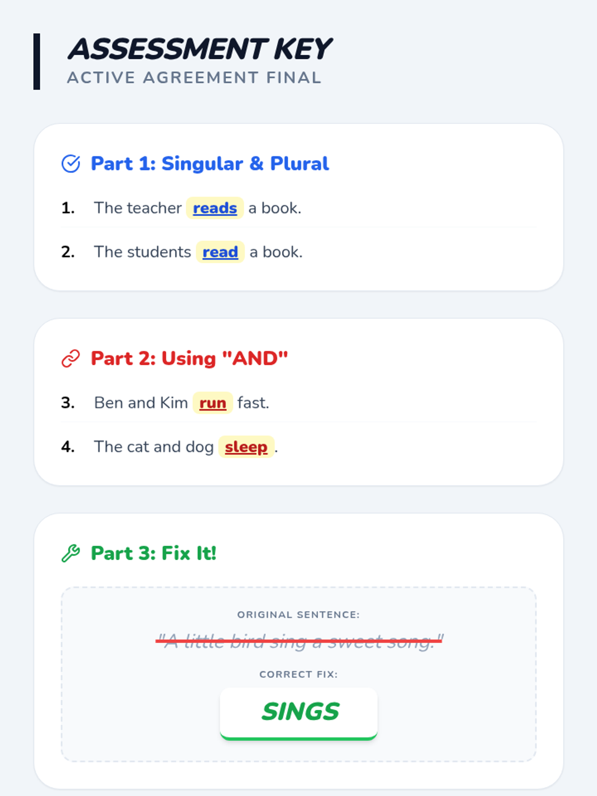 A high-energy, game-based sequence for 1st graders to master subject-verb agreement through movement, rapid-fire sorting, and collaborative play. Students learn to match singular, plural, and compound subjects with their correct verb forms in a series of 'Grammar Games'.