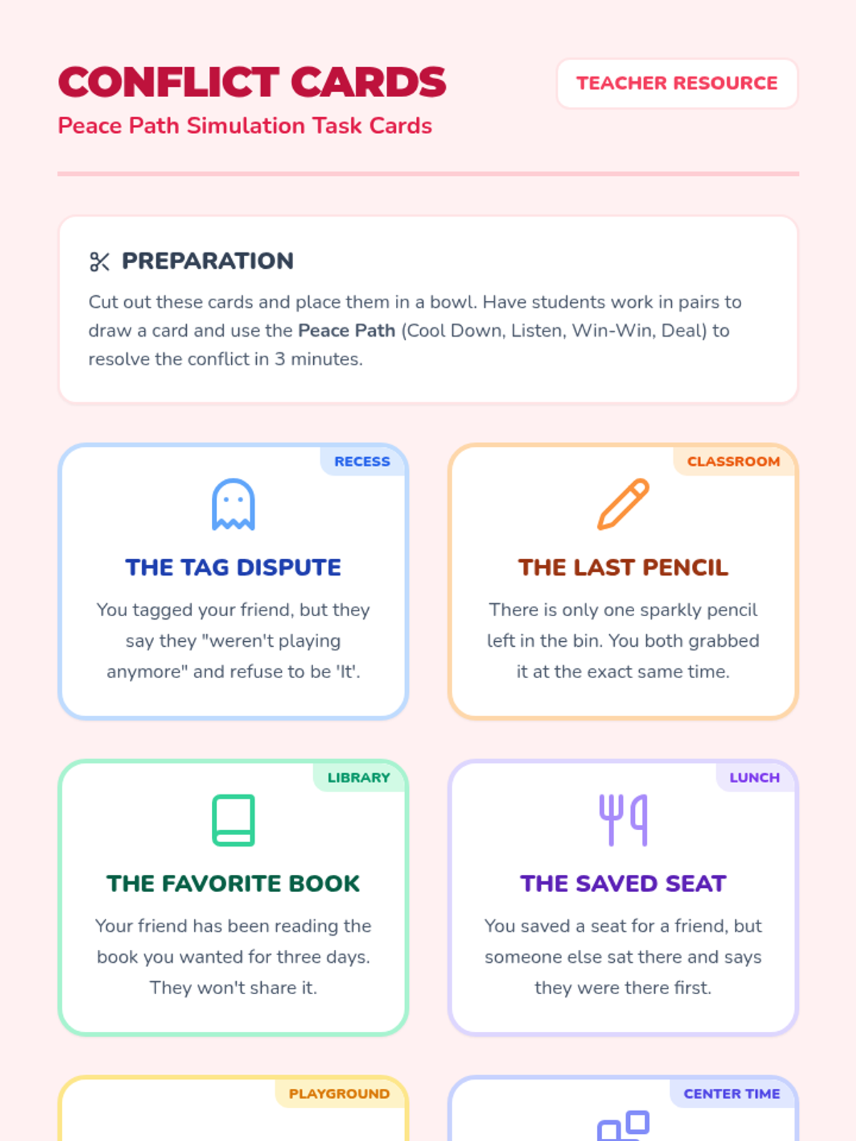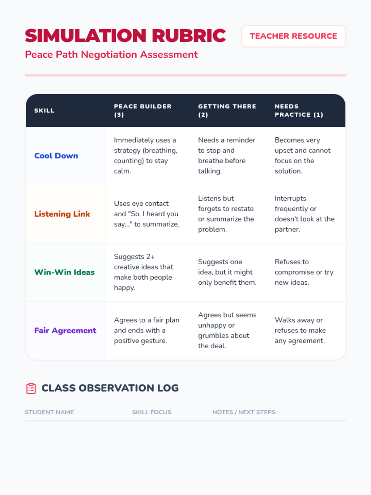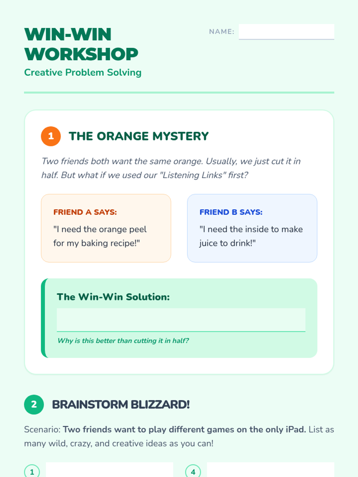 This sequence teaches 2nd-grade students how to manage conflict through active listening and collaborative negotiation. Students learn to de-escalate their emotions, listen with intent, brainstorm 'win-win' solutions, and use fair decision-making tools to resolve disputes independently.