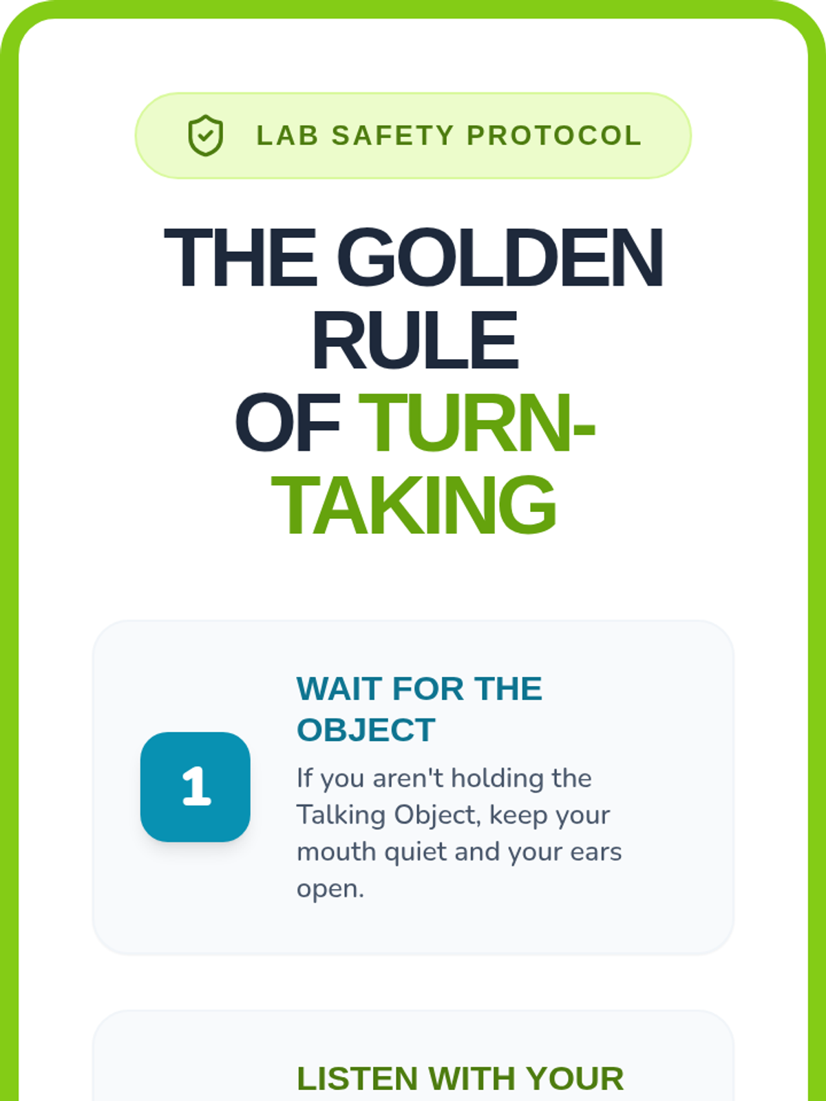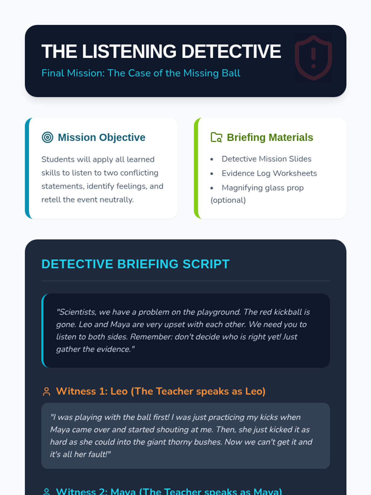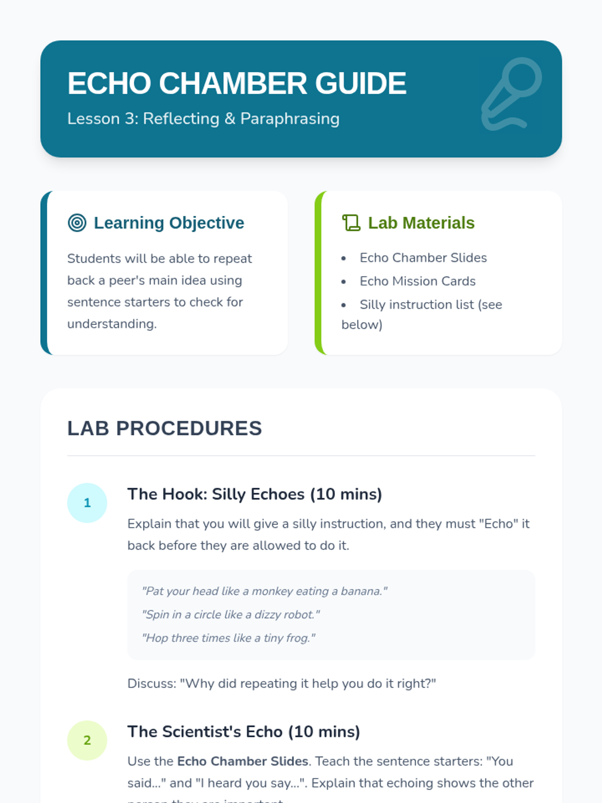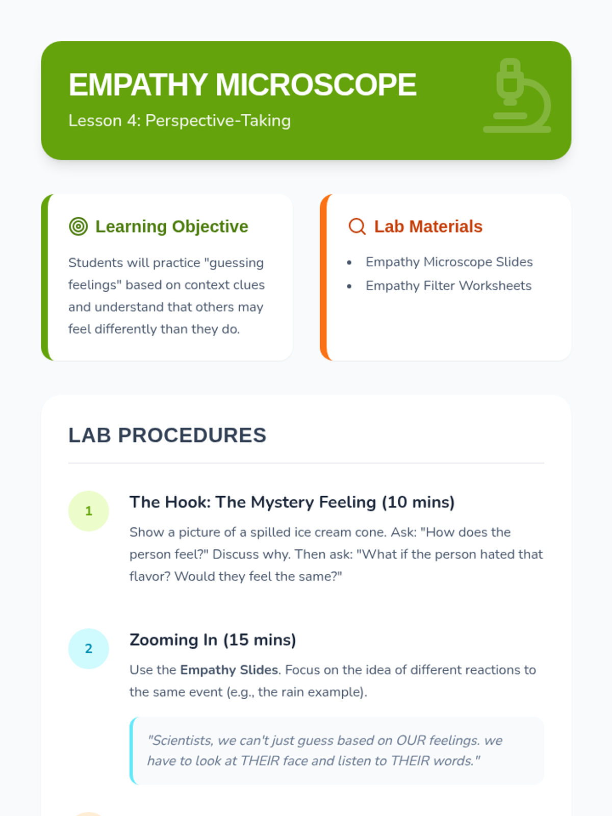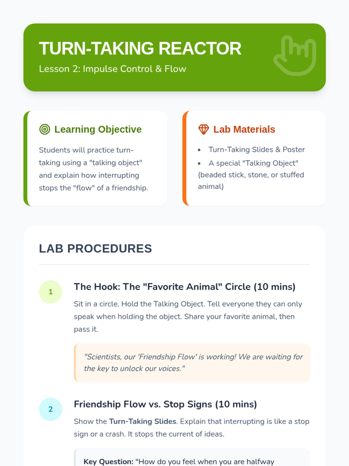 This sequence teaches 1st Grade students the foundational skills of active listening and empathy as tools for conflict resolution. Through the 'Friendship Lab' theme, students learn how to use their bodies to listen, wait for their turn to speak, reflect others' thoughts, and identify feelings to better understand their peers.