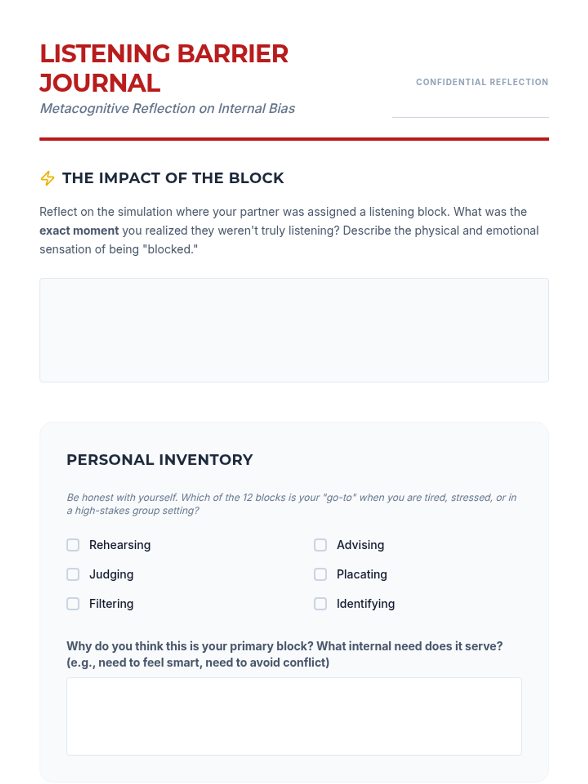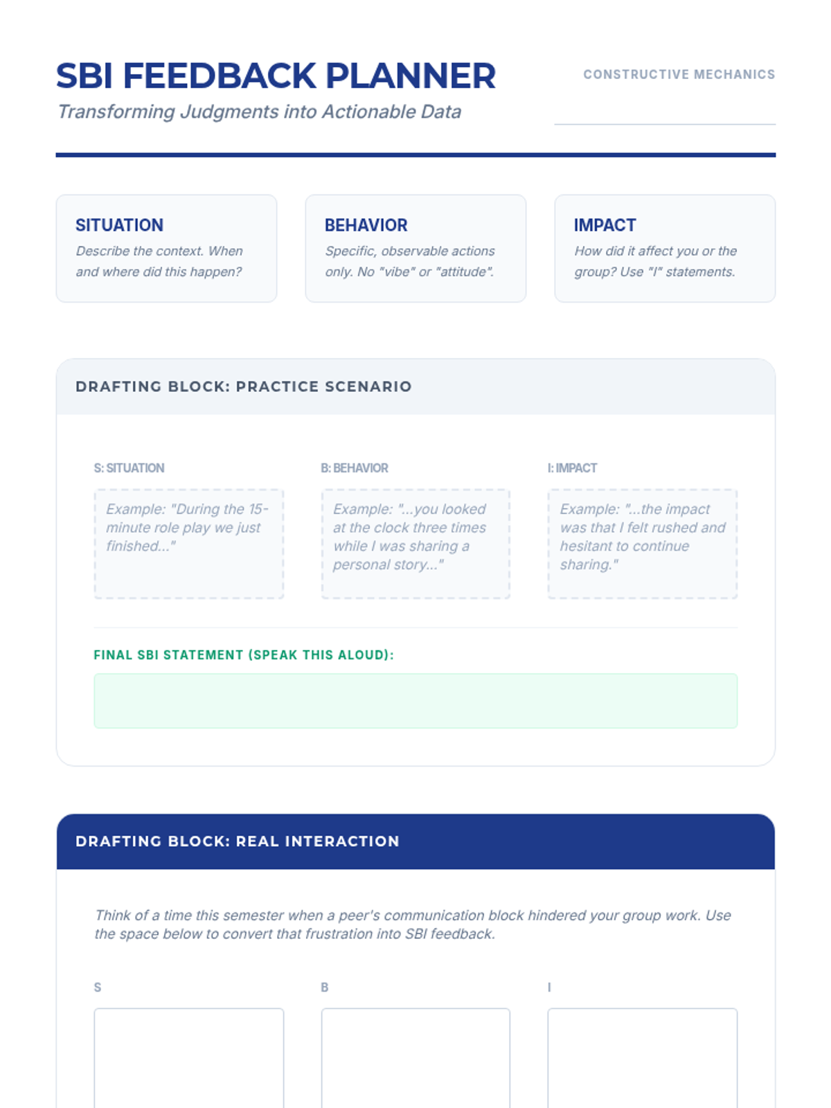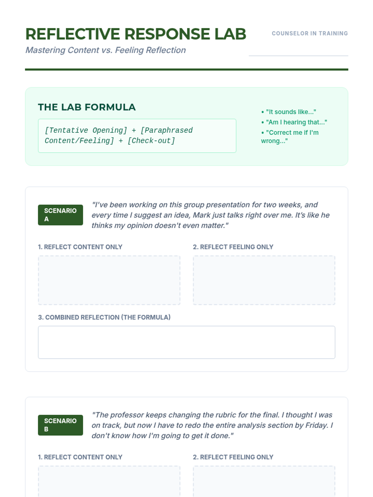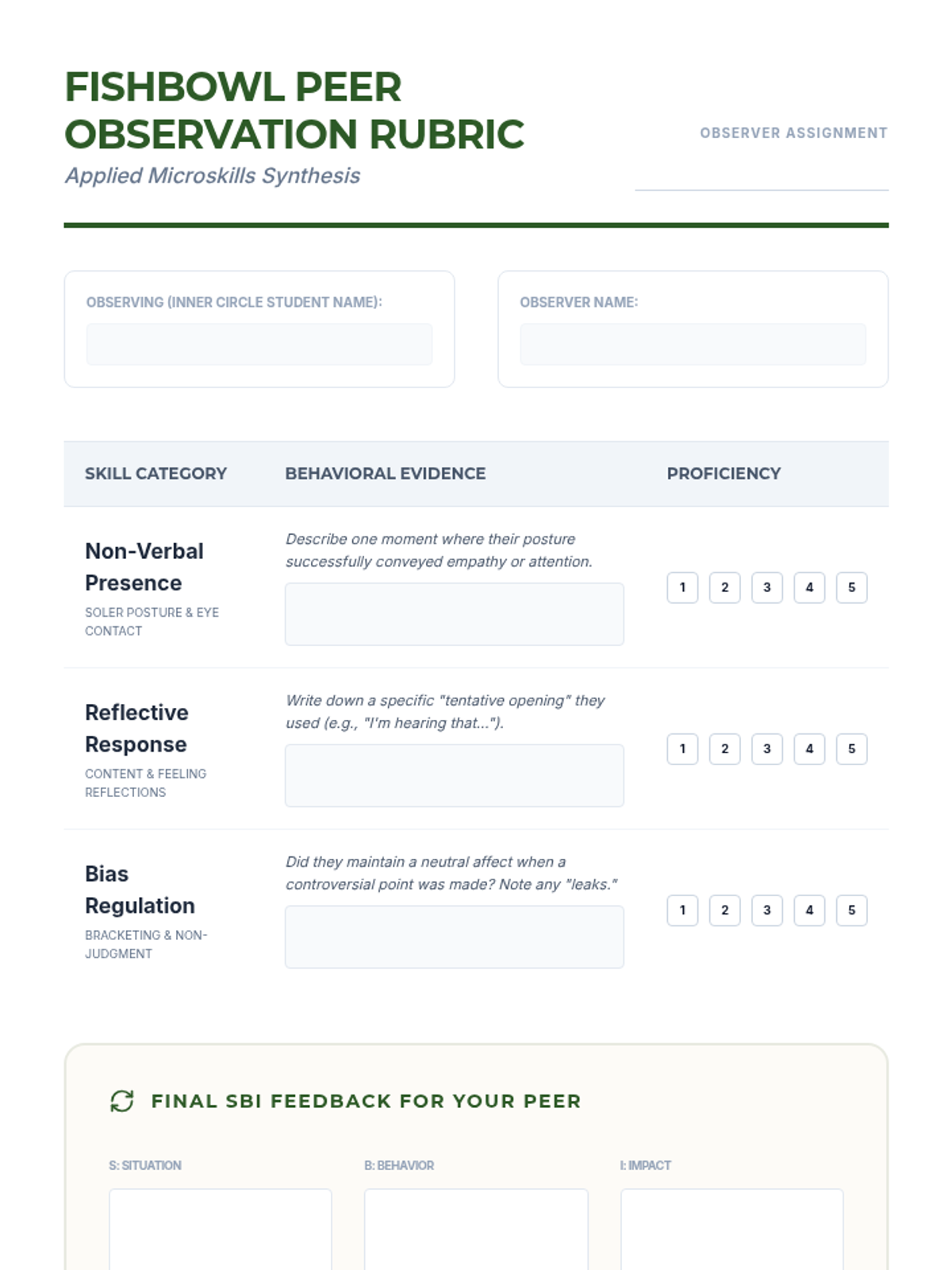 This sequence provides undergraduate counseling students with a structured progression from non-verbal presence to complex group facilitation. It emphasizes active listening, reflective responding, internal bias management, and constructive feedback loops using the SBI model.