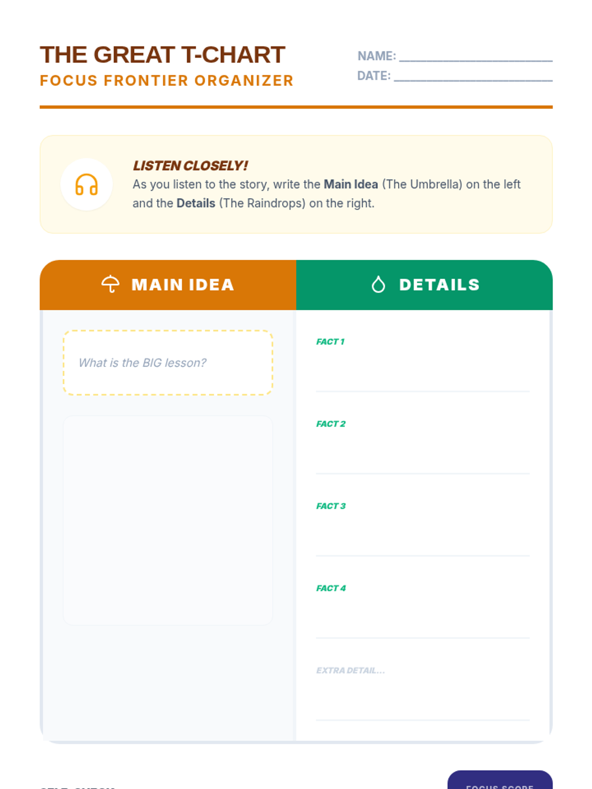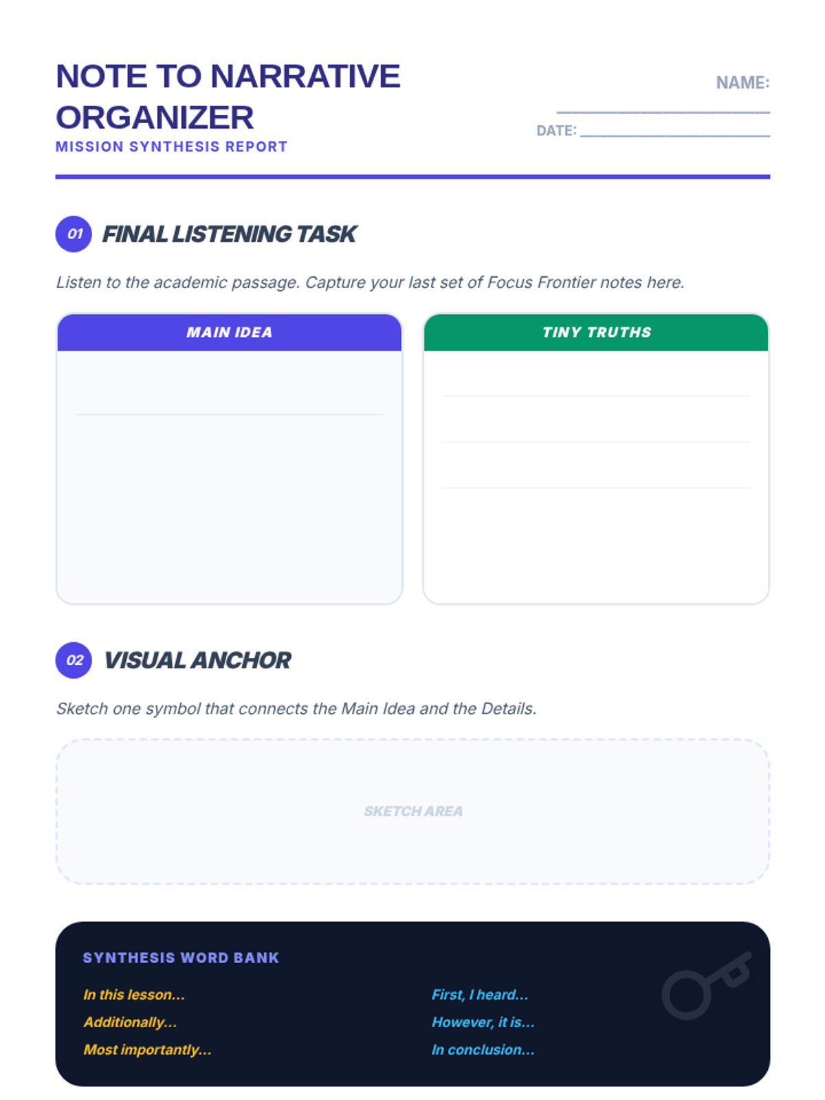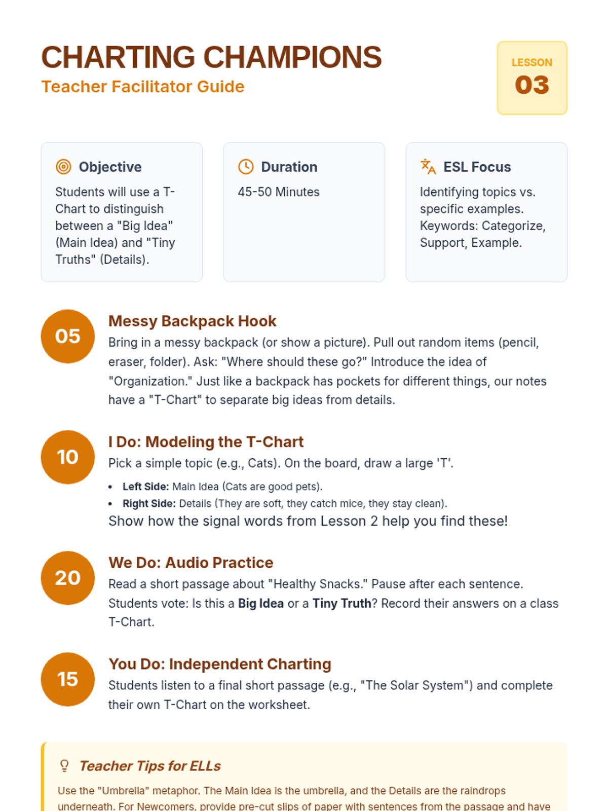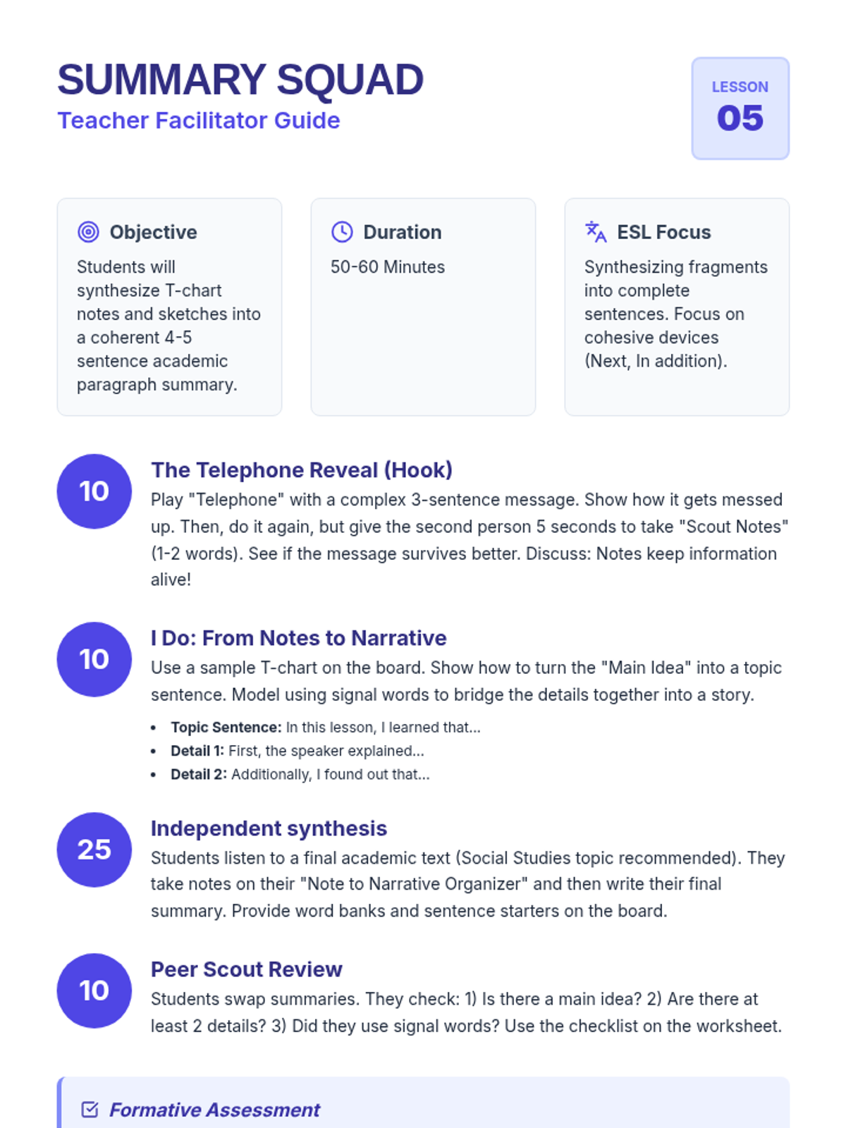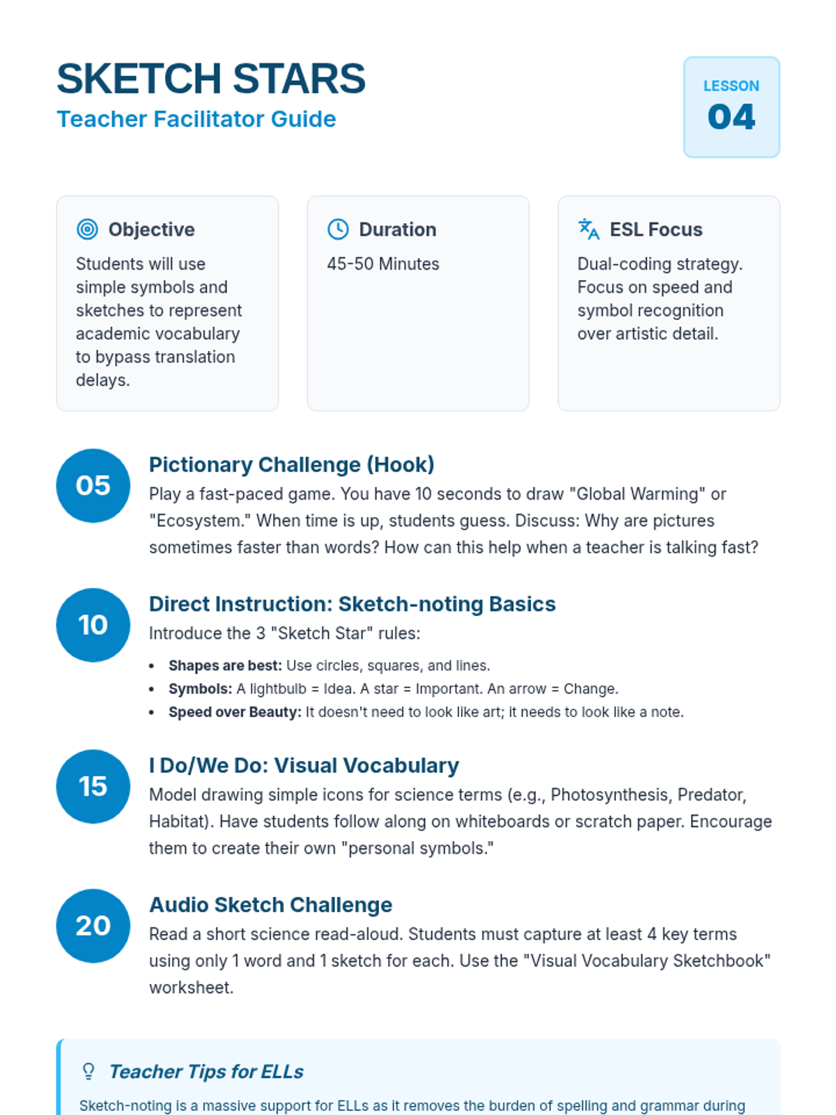 A comprehensive workshop-style unit for 4th Grade ELLs to develop active listening habits, recognize verbal signals, use T-charts, practice sketch-noting, and synthesize notes into academic summaries.