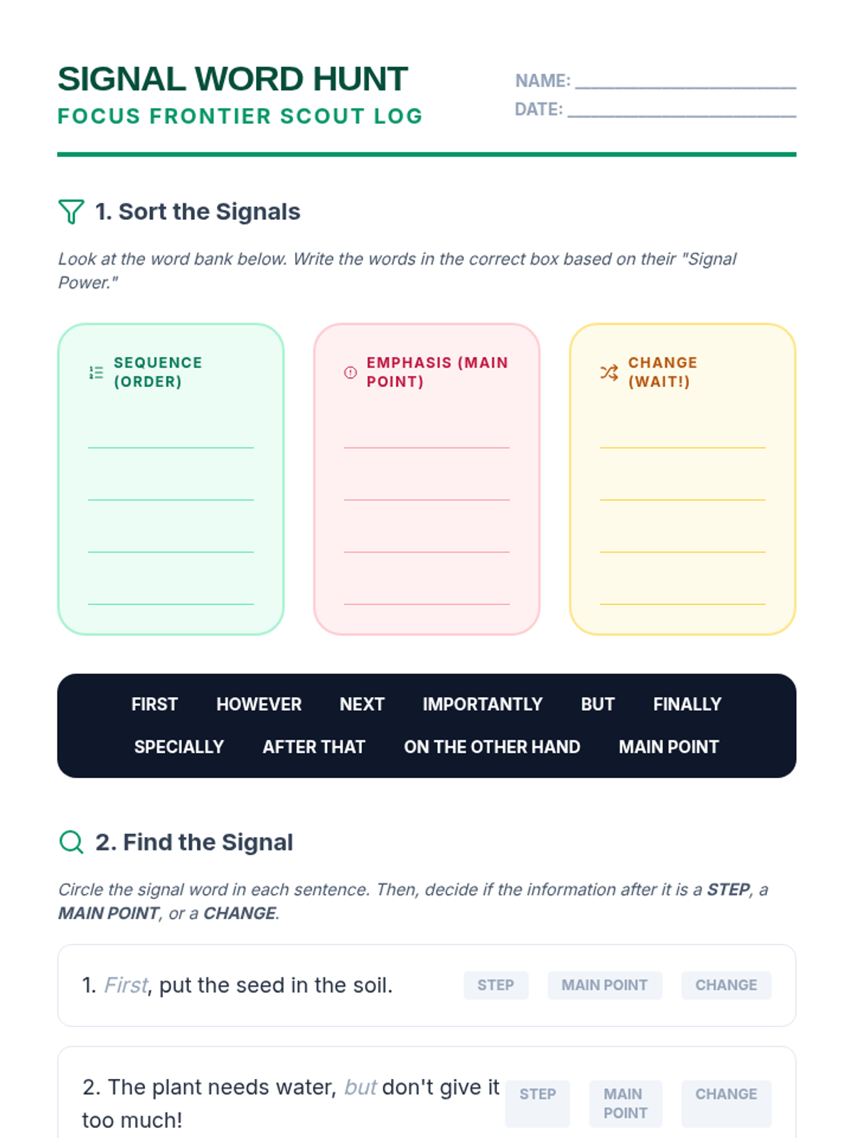 This sequence helps 4th Grade ESL students master listening skills by focusing on multi-step directions, sequence markers, spatial prepositions, and clarification strategies. Students progress from identifying simple transition words to navigating complex maps and completing an auditory scavenger hunt.