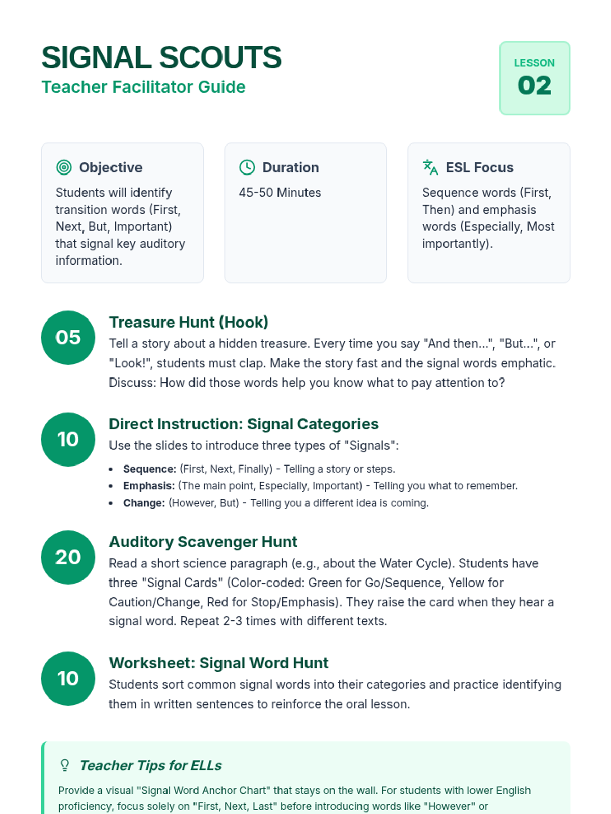 A comprehensive unit for 4th Grade ESL learners to master academic listening. Students transition from social conversation to processing informational texts by identifying signal words, capturing vocabulary definitions in context, using graphic organizers, and distinguishing fact from opinion to synthesize complex information.