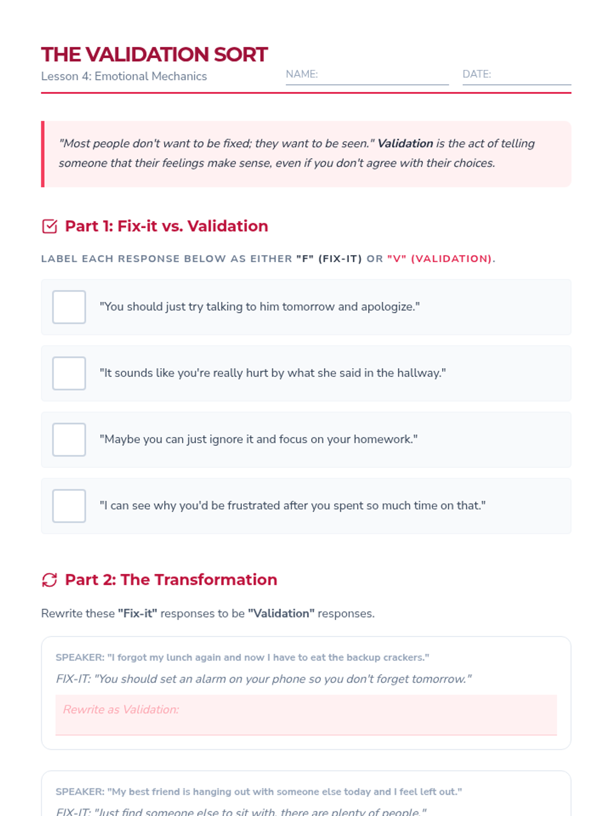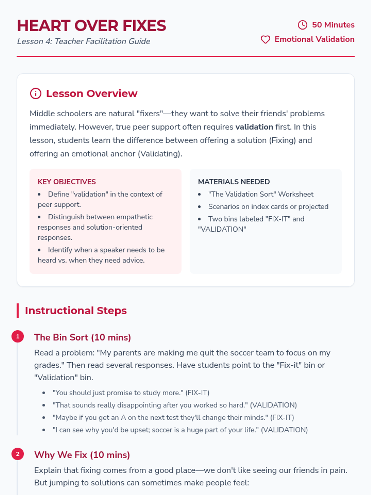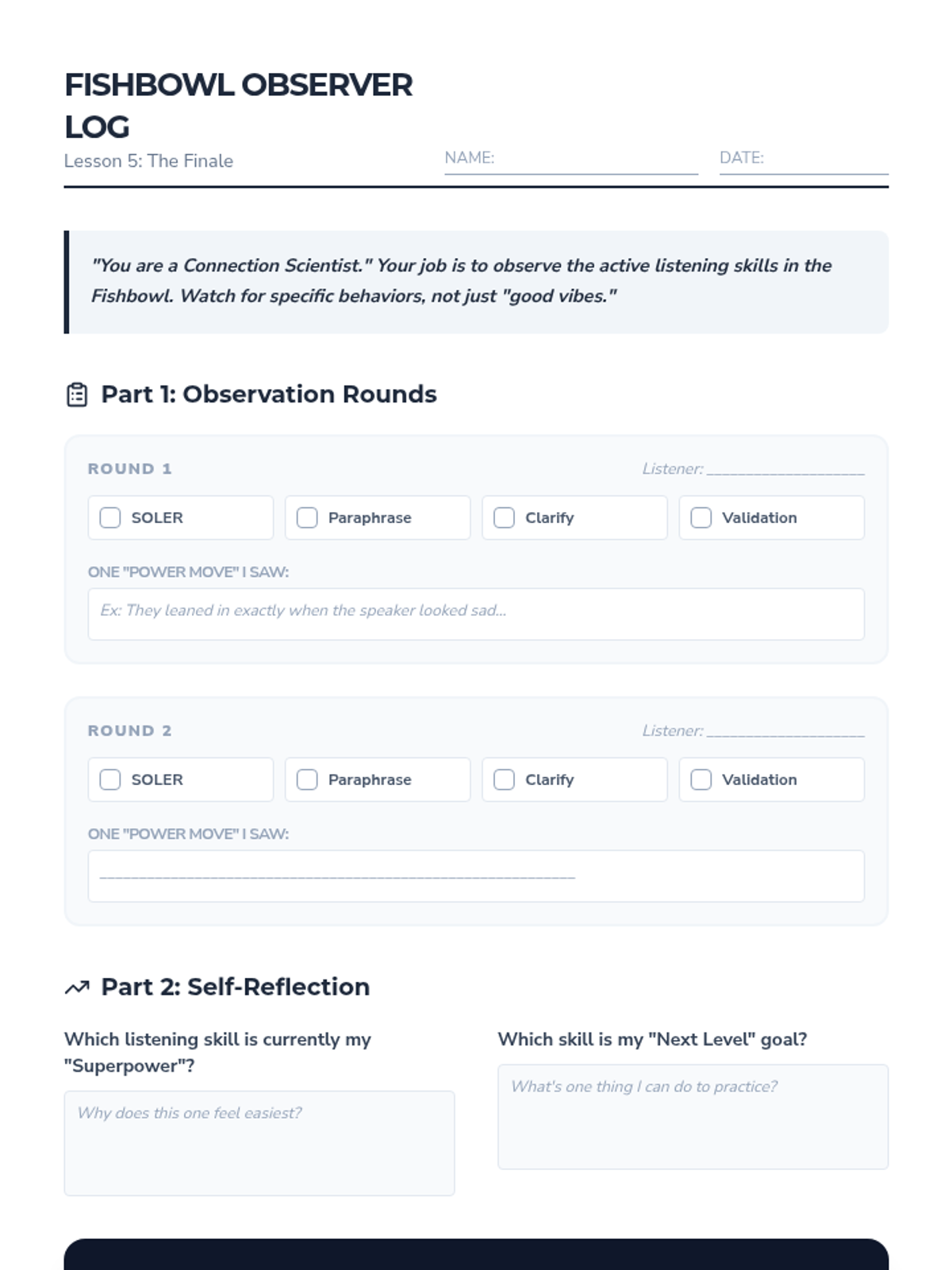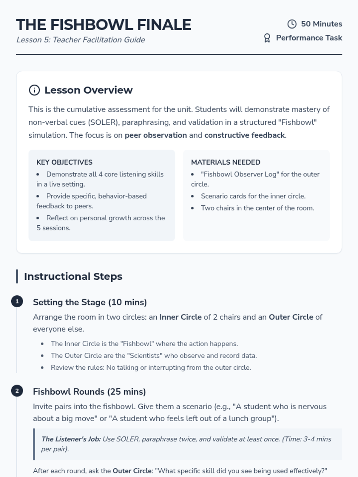 This sequence teaches 7th-grade students the fundamental mechanics of communication for peer support. It progresses from identifying barriers to listening to mastering non-verbal cues, paraphrasing, and emotional validation, culminating in a live 'fishbowl' practice.
