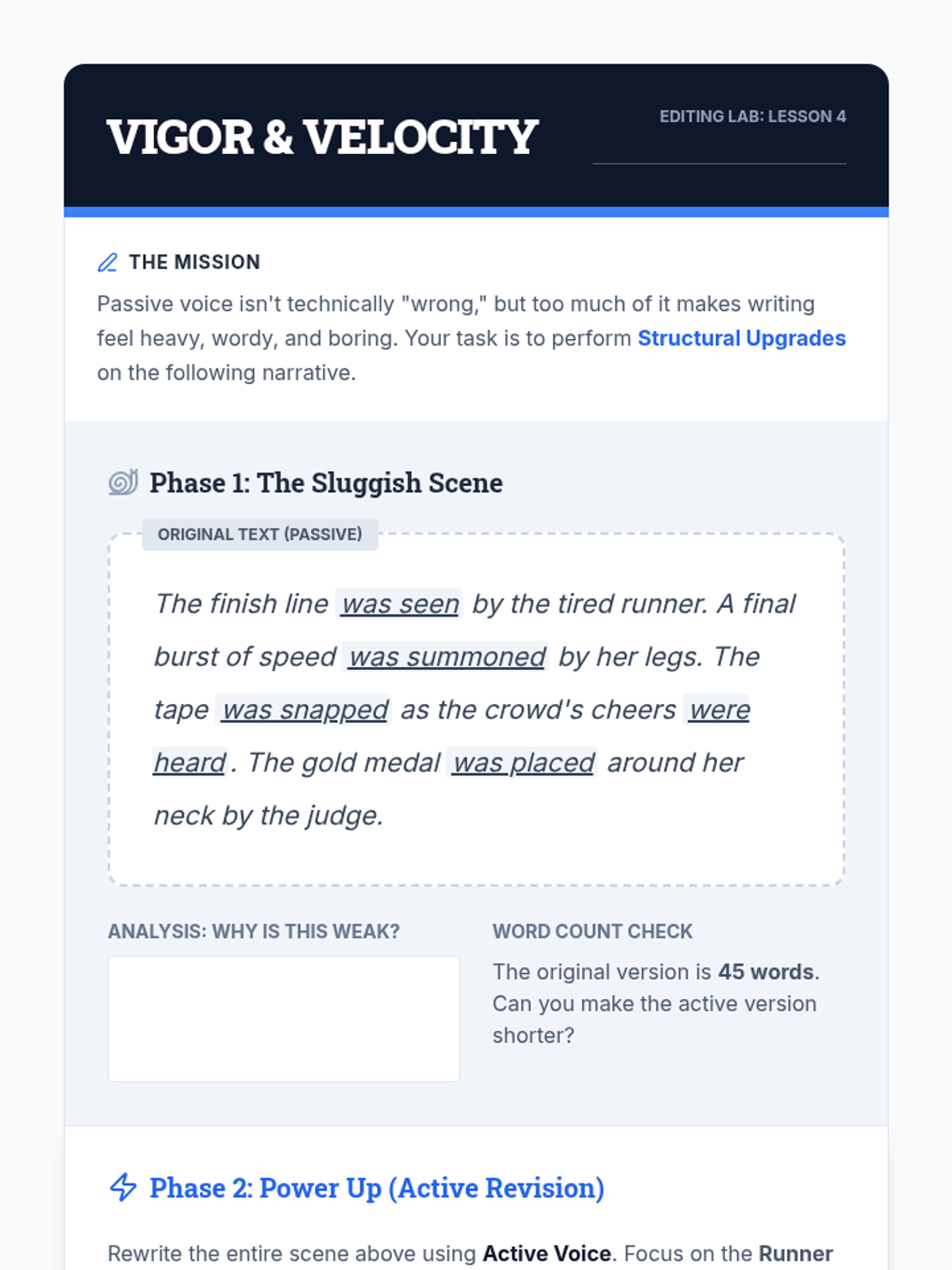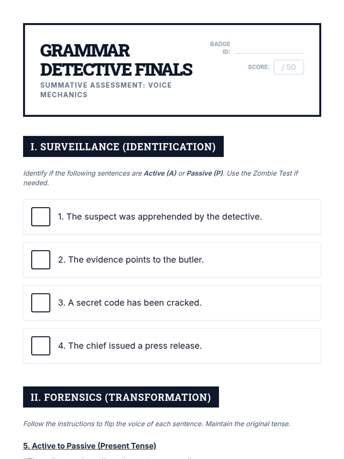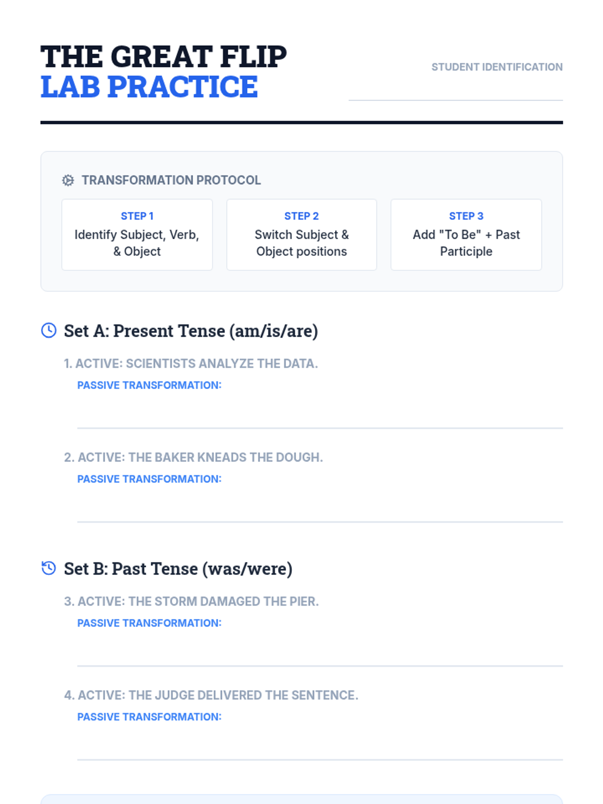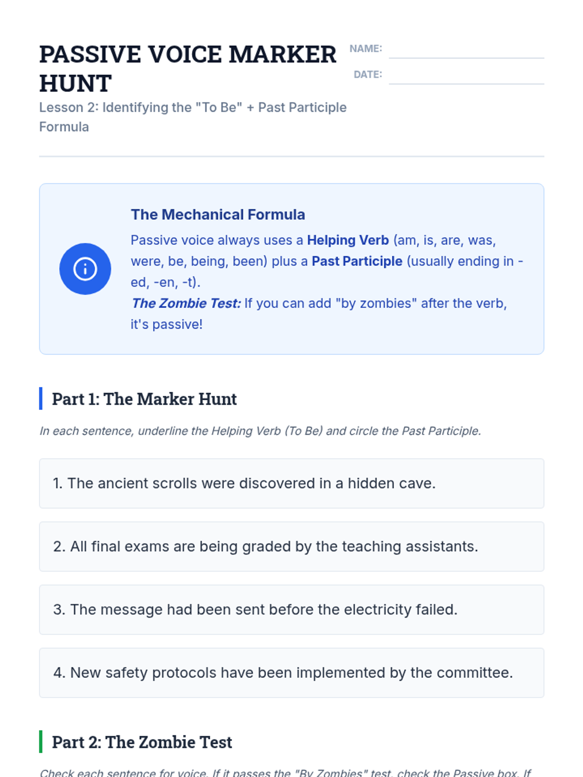 A comprehensive 8th-grade grammar unit focusing on the structural mechanics of active and passive voice. Students move from identifying agents of action to mastering the 'to be + past participle' formula and transforming sentences while maintaining tense consistency.