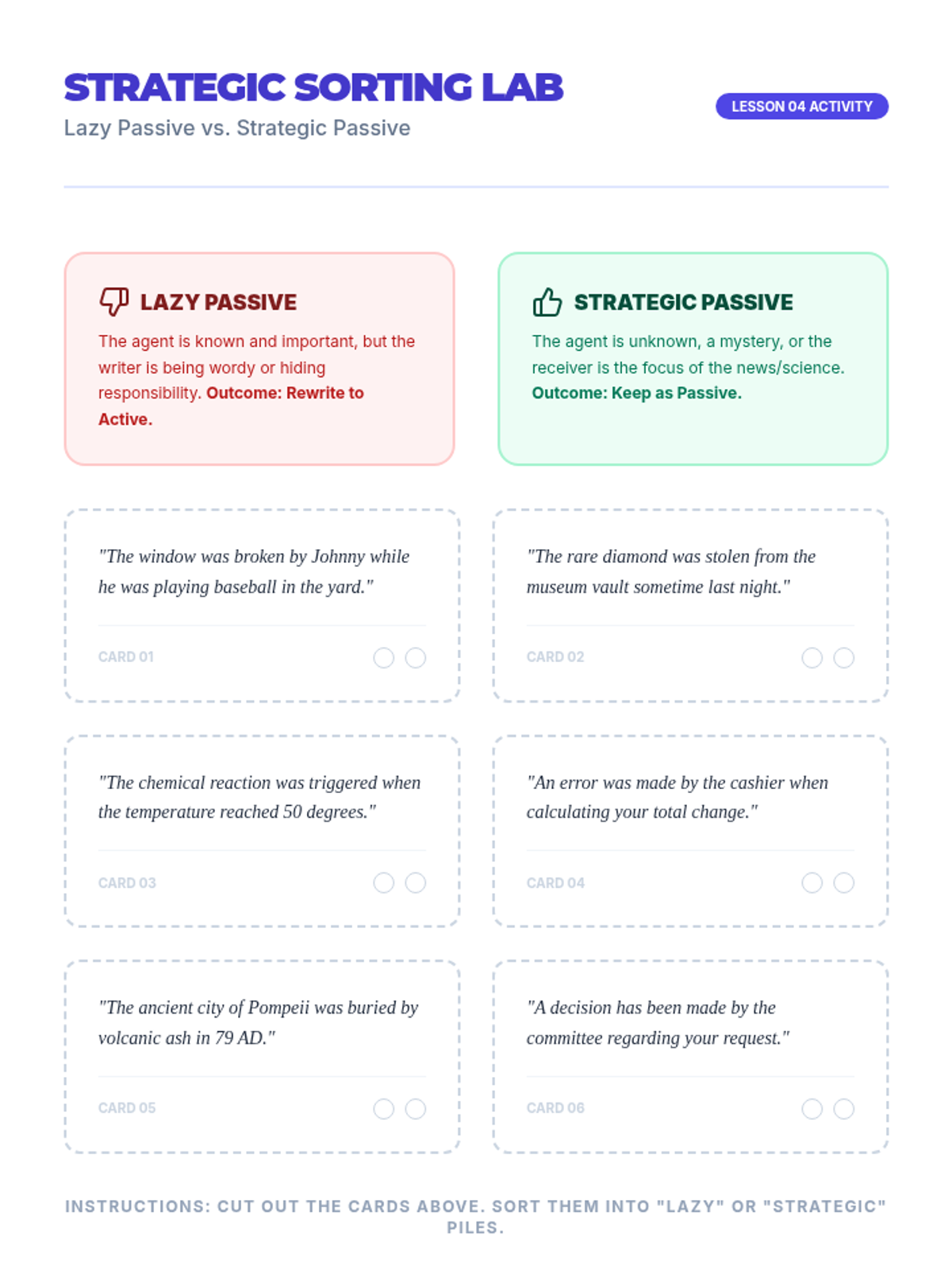This sequence provides a comprehensive exploration of active and passive voice, moving from basic sentence structure to sophisticated stylistic choices. Students will learn to identify, convert, and strategically use different voices to enhance clarity and impact in their writing.