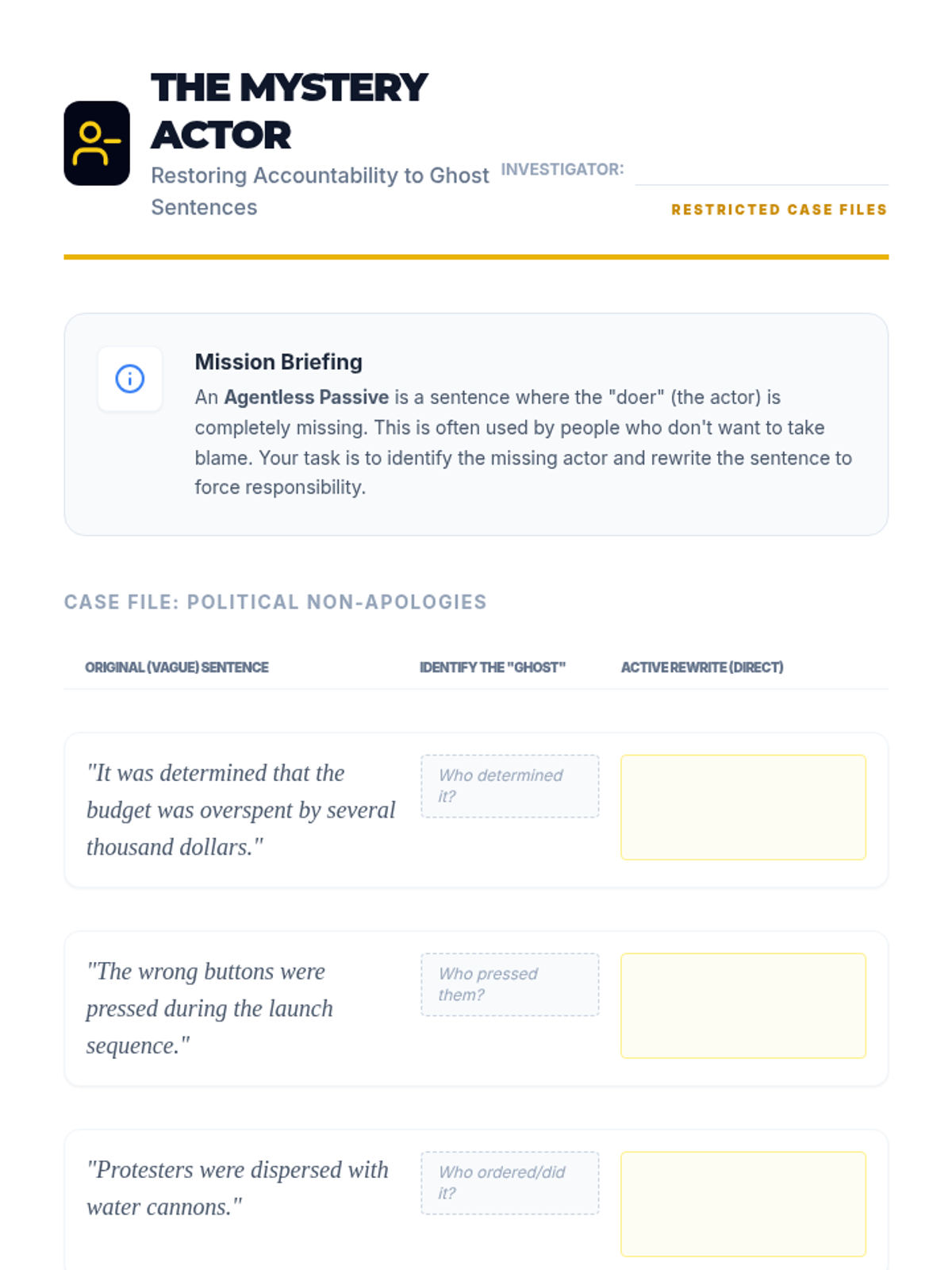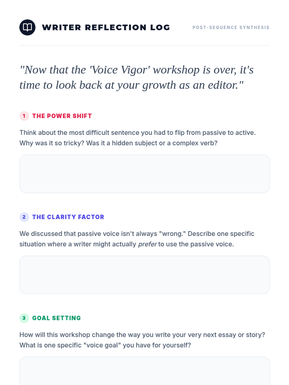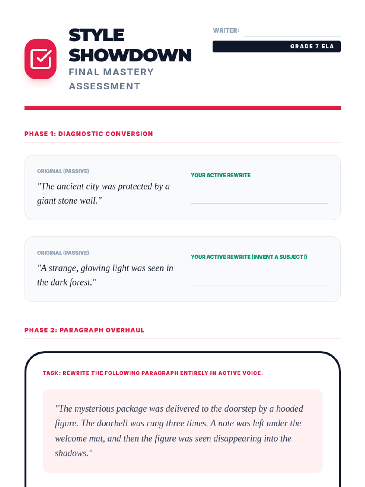 A middle school writing sequence focused on the mastery of active and passive voice. Students learn to identify passive constructions, evaluate their impact on clarity, and revise sentences to increase vigor and directness in their own writing.