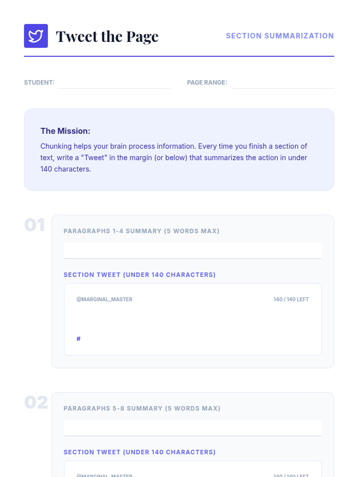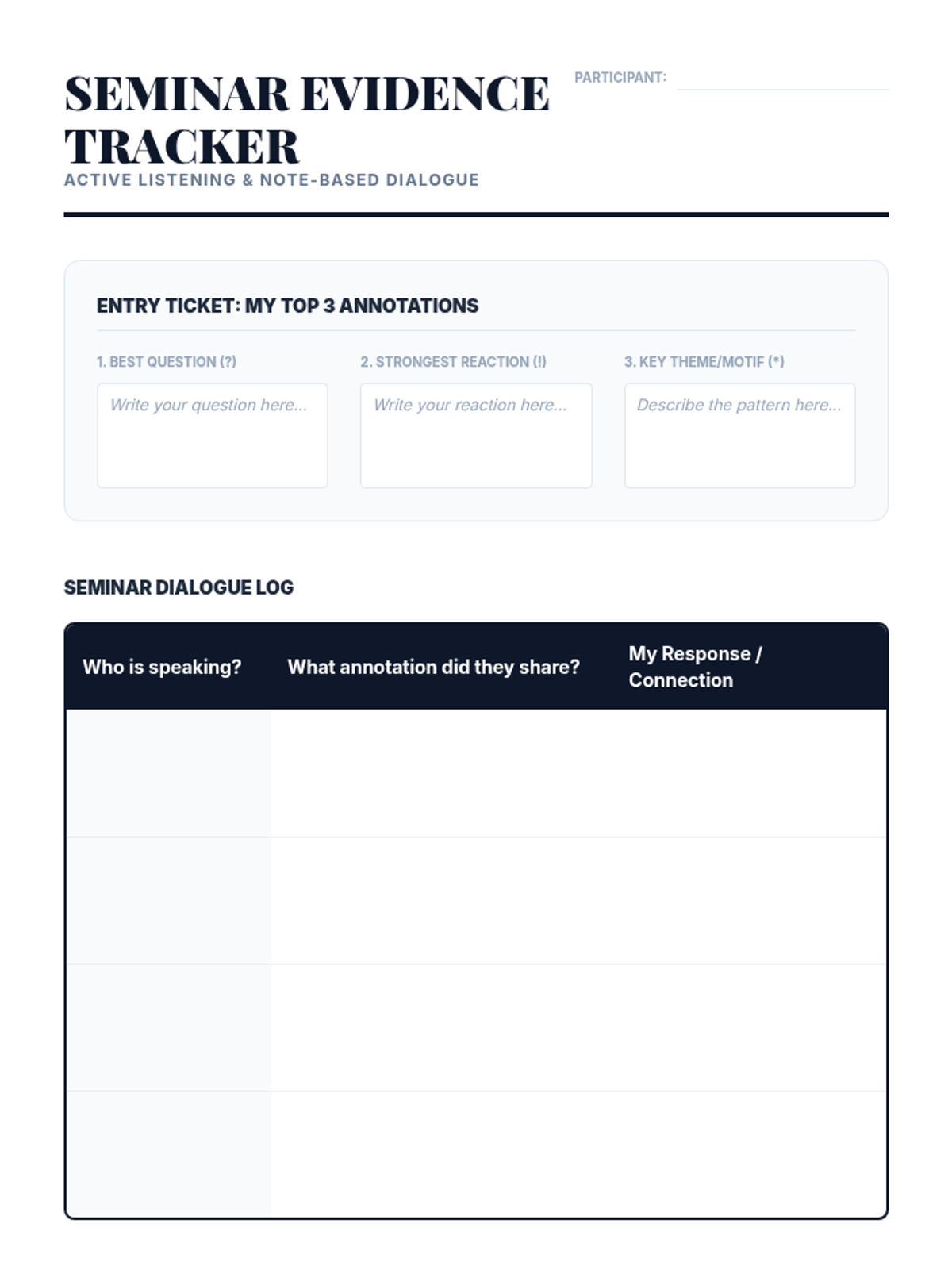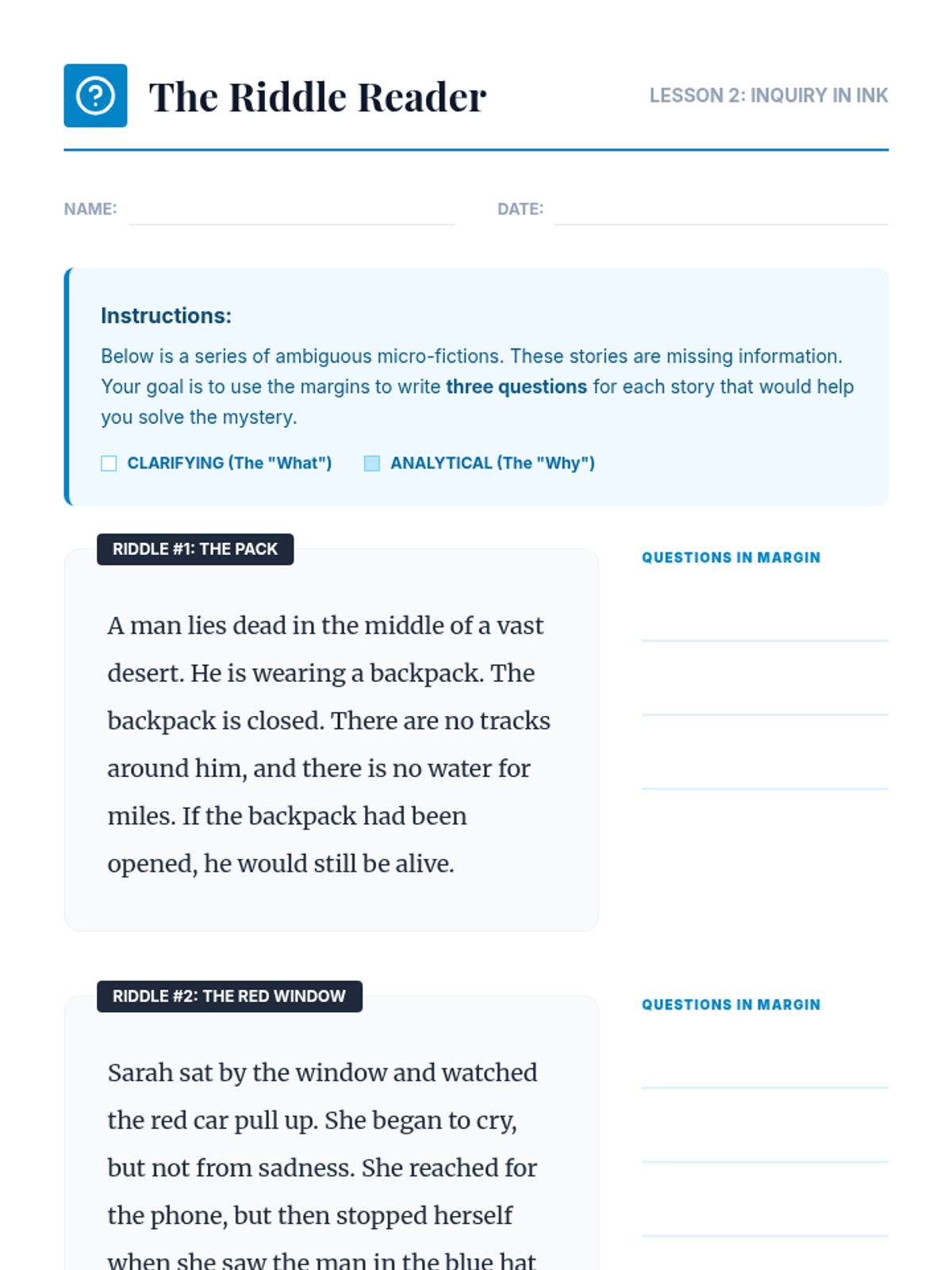 A 10th-grade academic support sequence that transforms students from passive readers to active analysts through the art of marginalia. Students master shorthand symbols, inquiry-based questioning, theme tracking, and summarization to prepare for a text-based Socratic seminar.