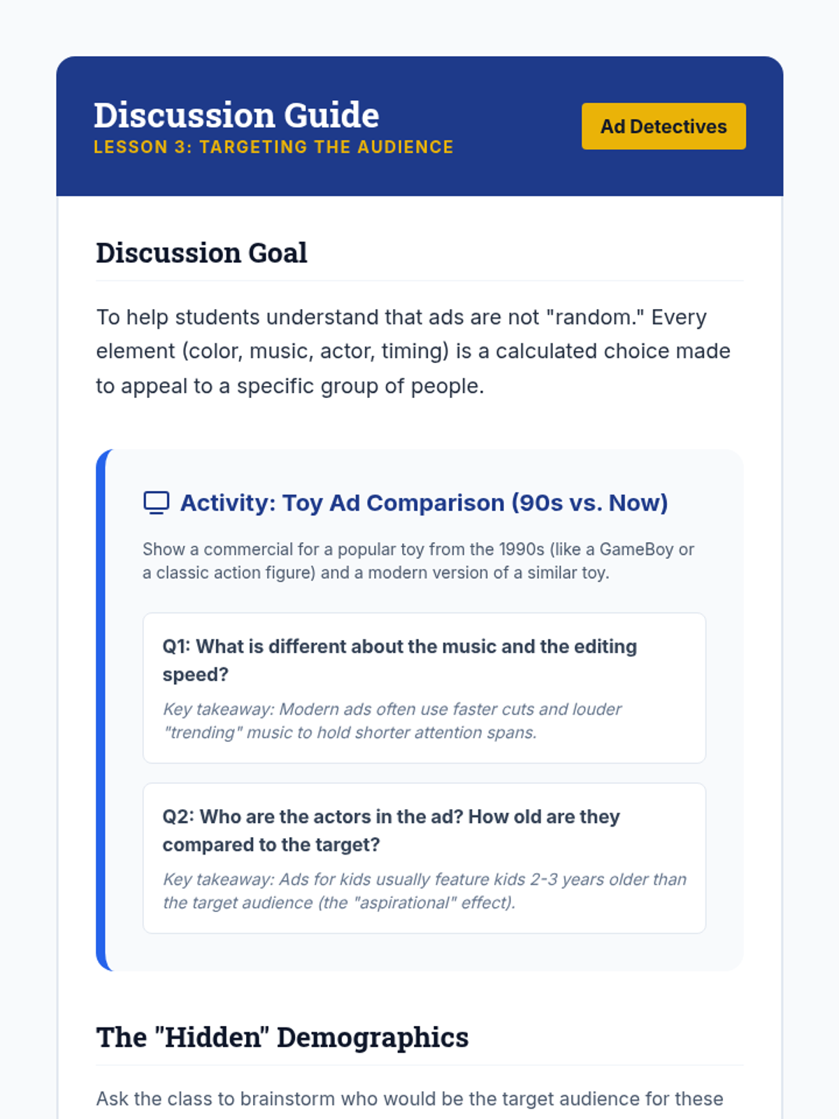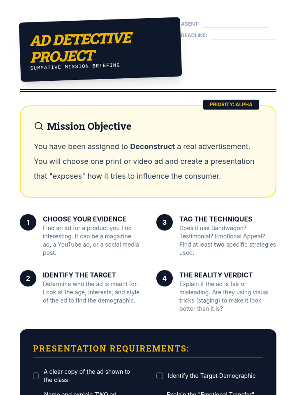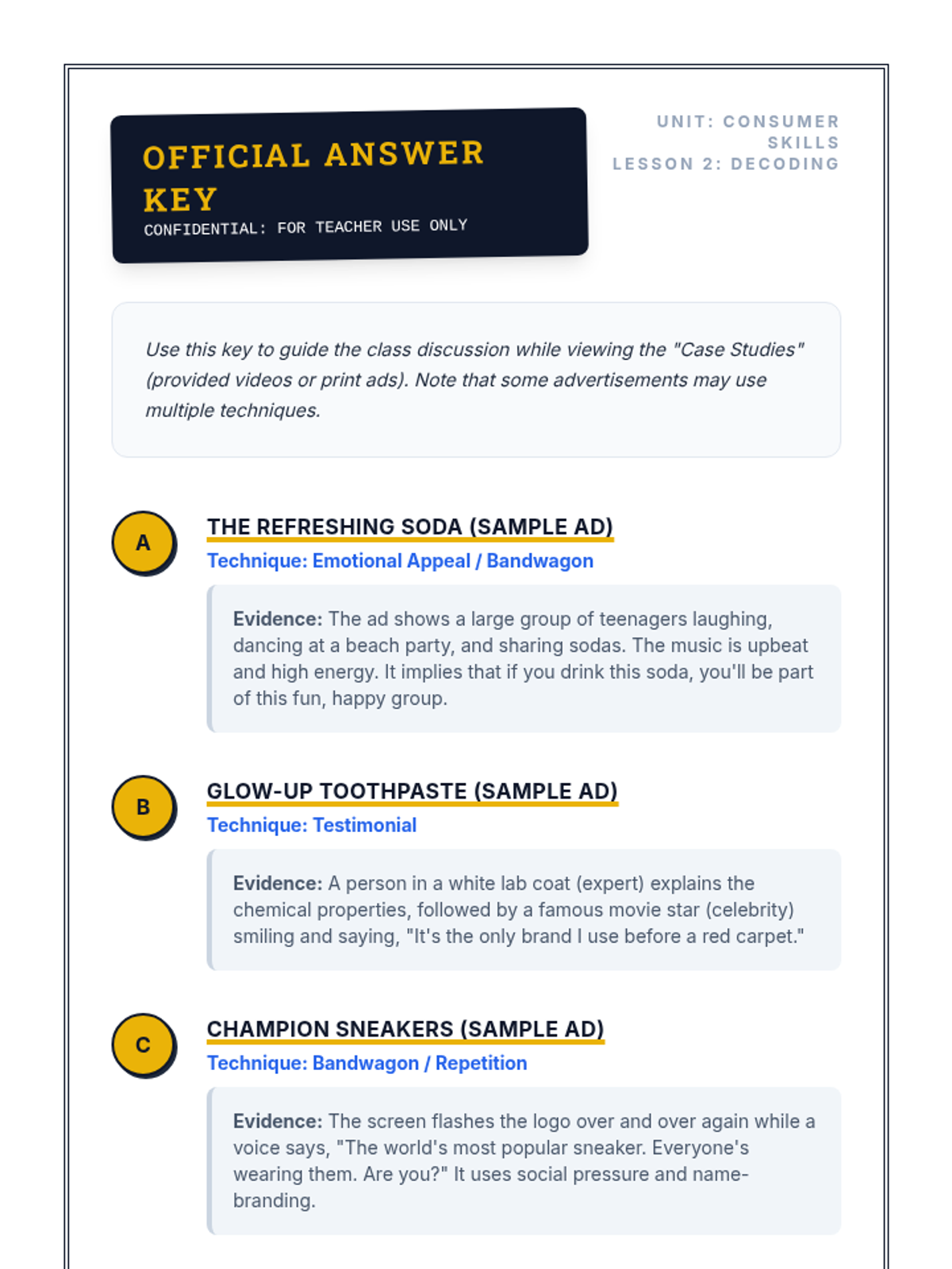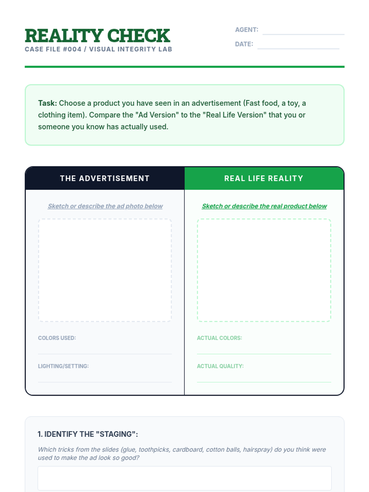 Students develop critical media literacy skills by deconstructing advertisements to understand how companies influence consumer behavior. They learn to identify common advertising techniques, understand target demographics, and recognize visual staging tactics used to manipulate consumer perception.