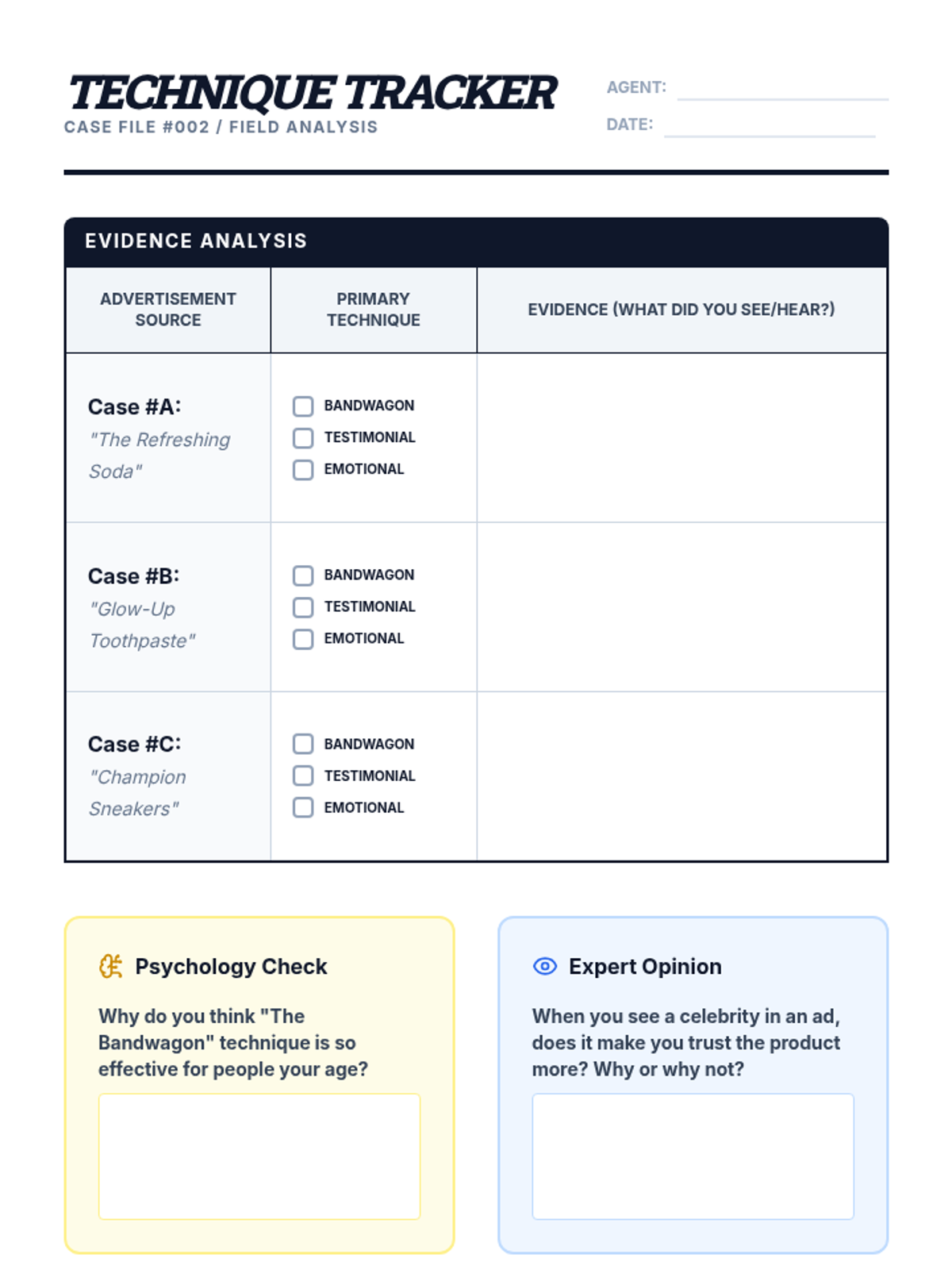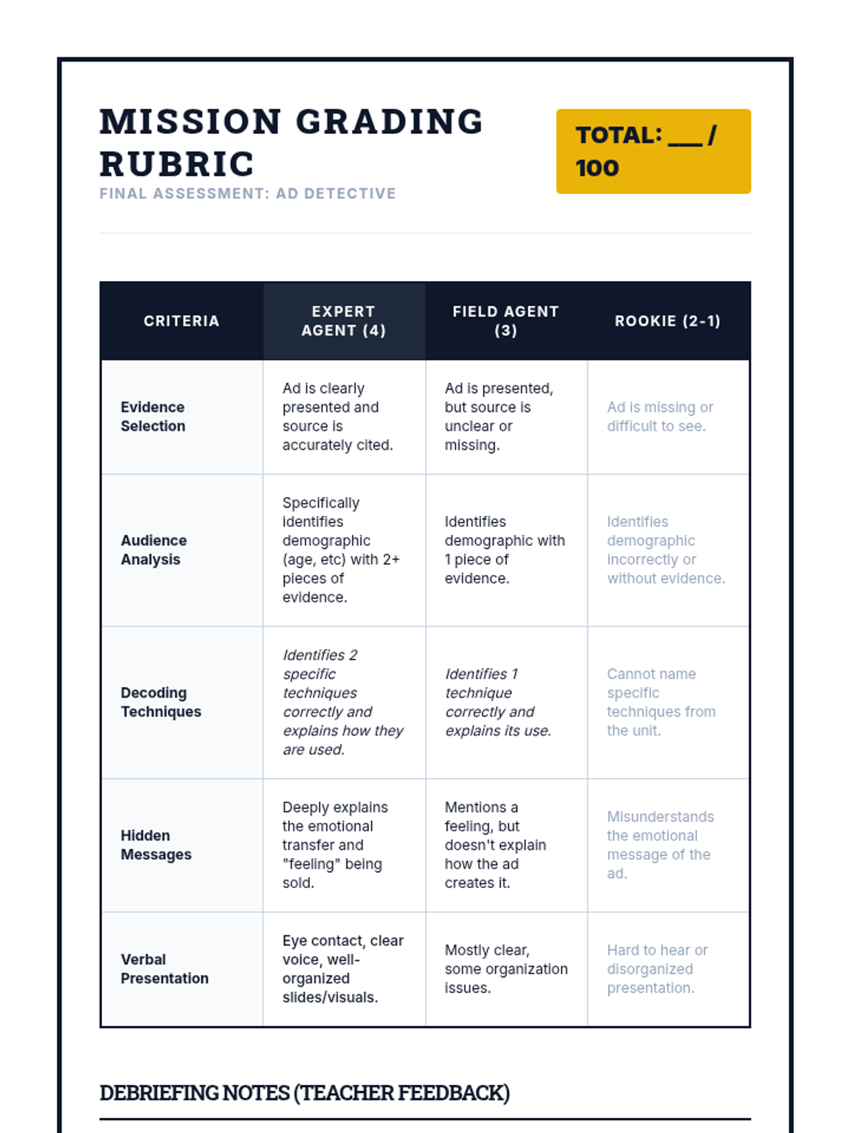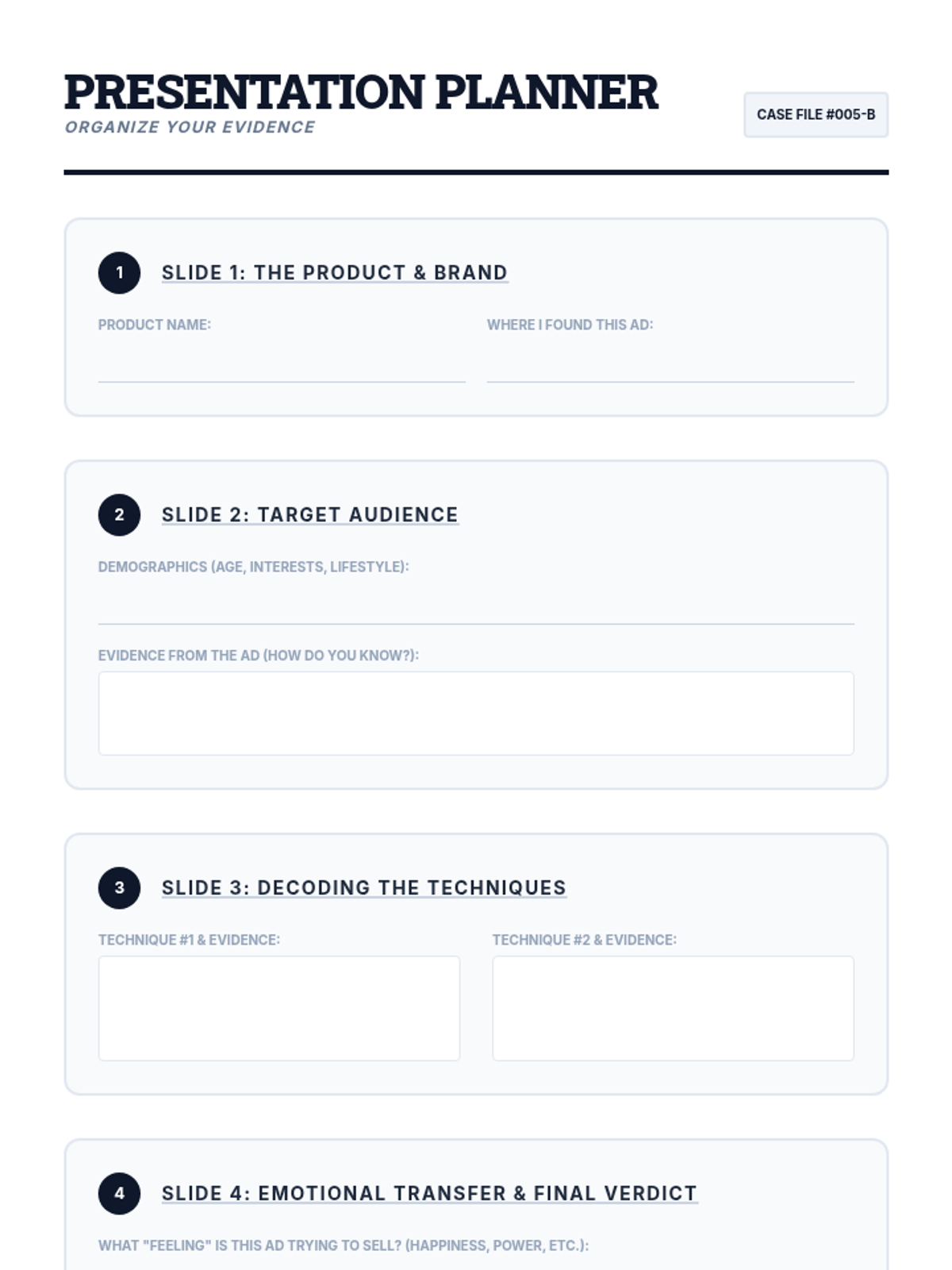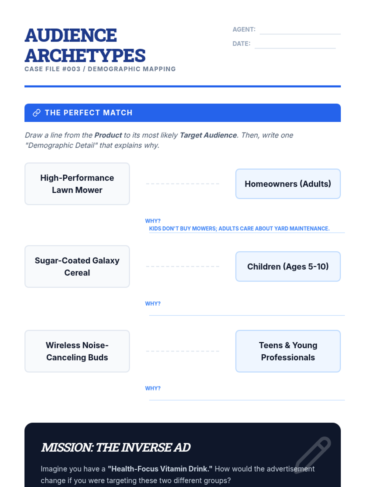 Students develop critical media literacy skills by deconstructing advertisements to understand how companies influence consumer behavior. They learn to identify common advertising techniques, understand target demographics, and recognize visual staging tactics used to manipulate consumer perception.