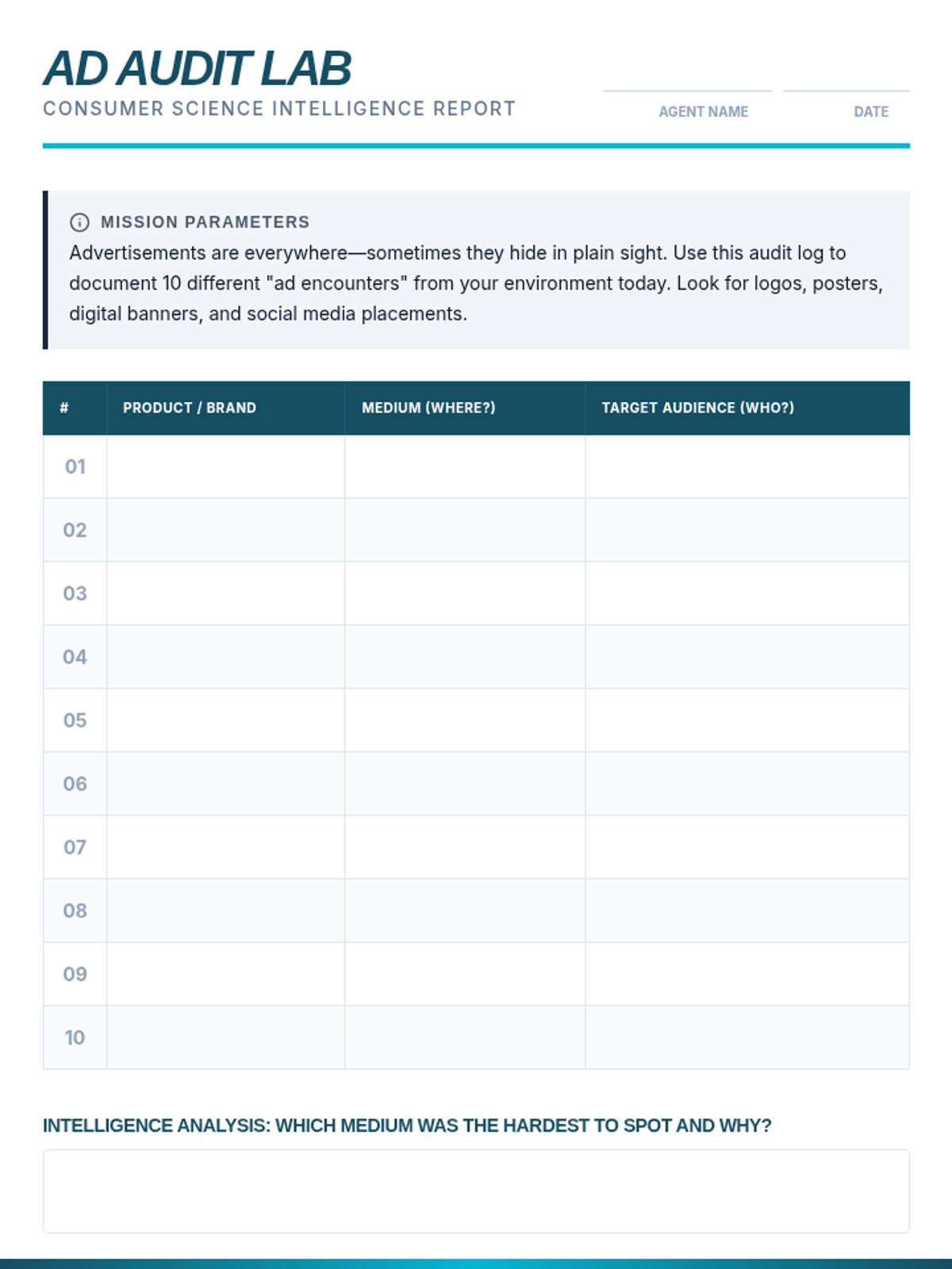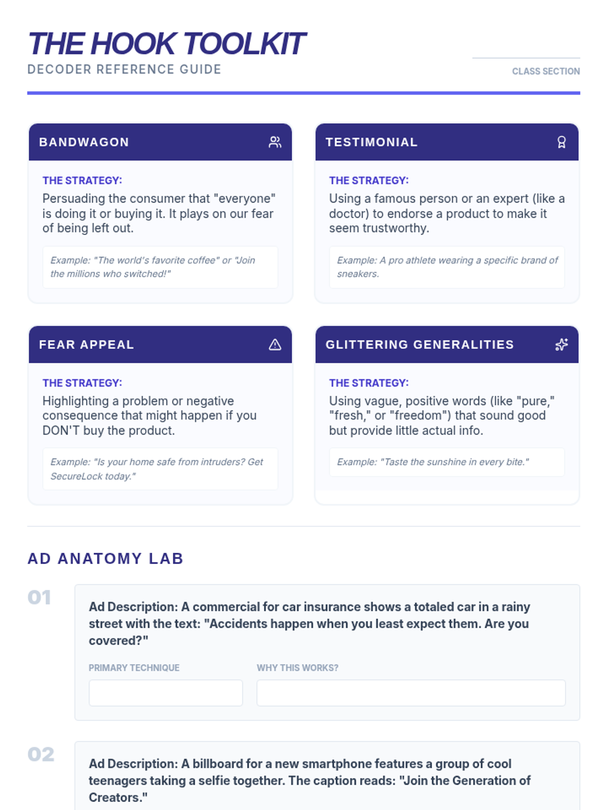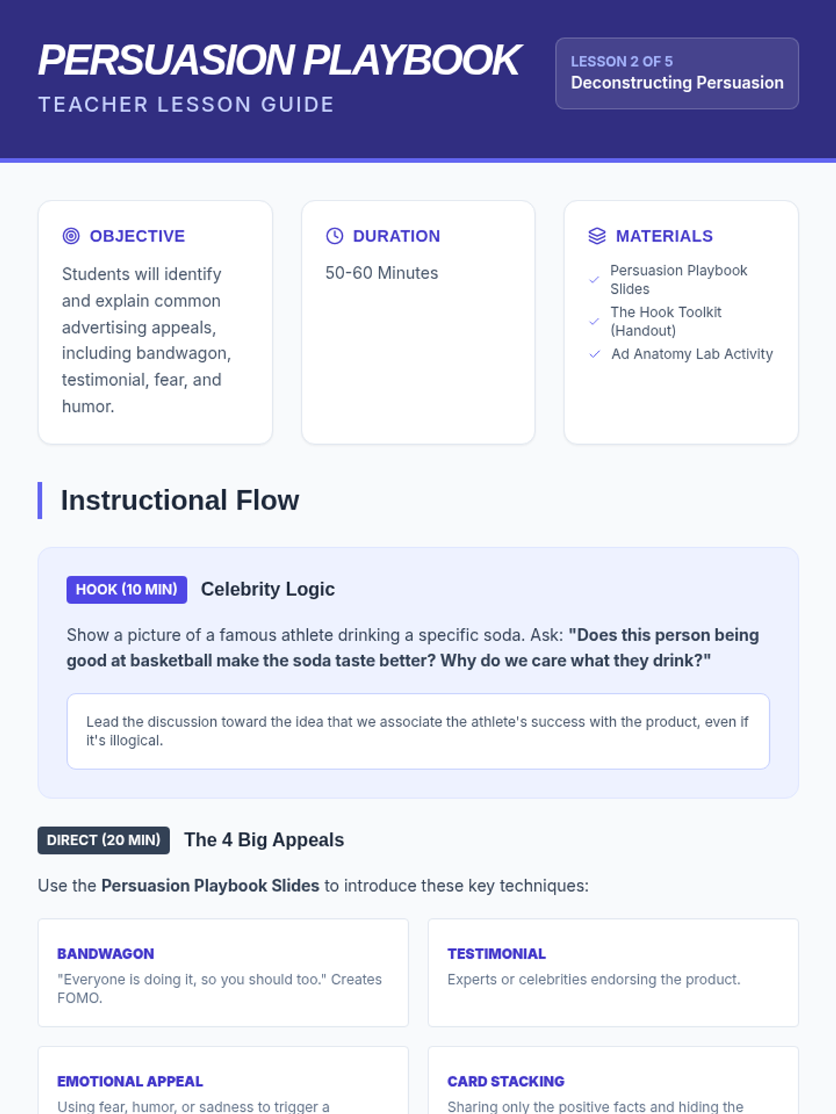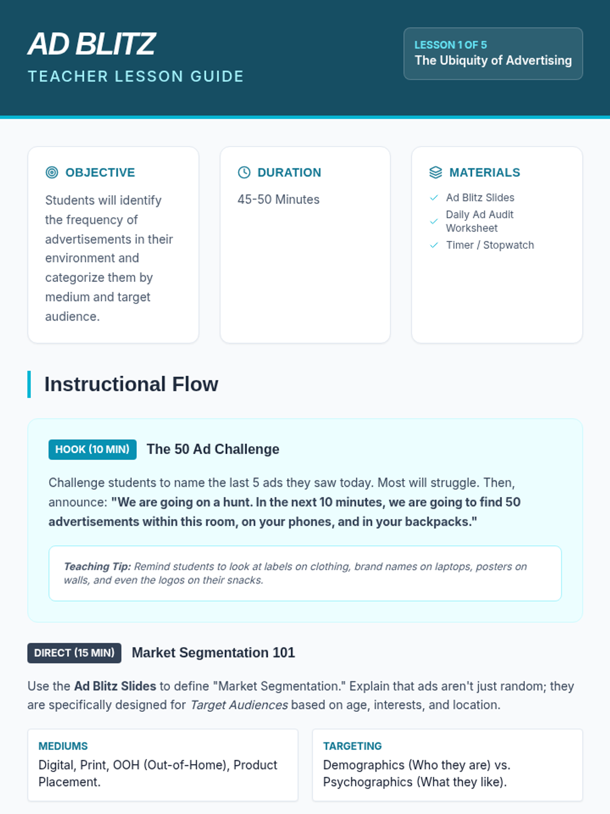 A comprehensive media literacy unit for 7th graders that teaches students to identify, analyze, and deconstruct persuasive advertising techniques across various media platforms. Students progress from recognizing the frequency of ads to critiquing the psychological and visual strategies used to influence consumer behavior.