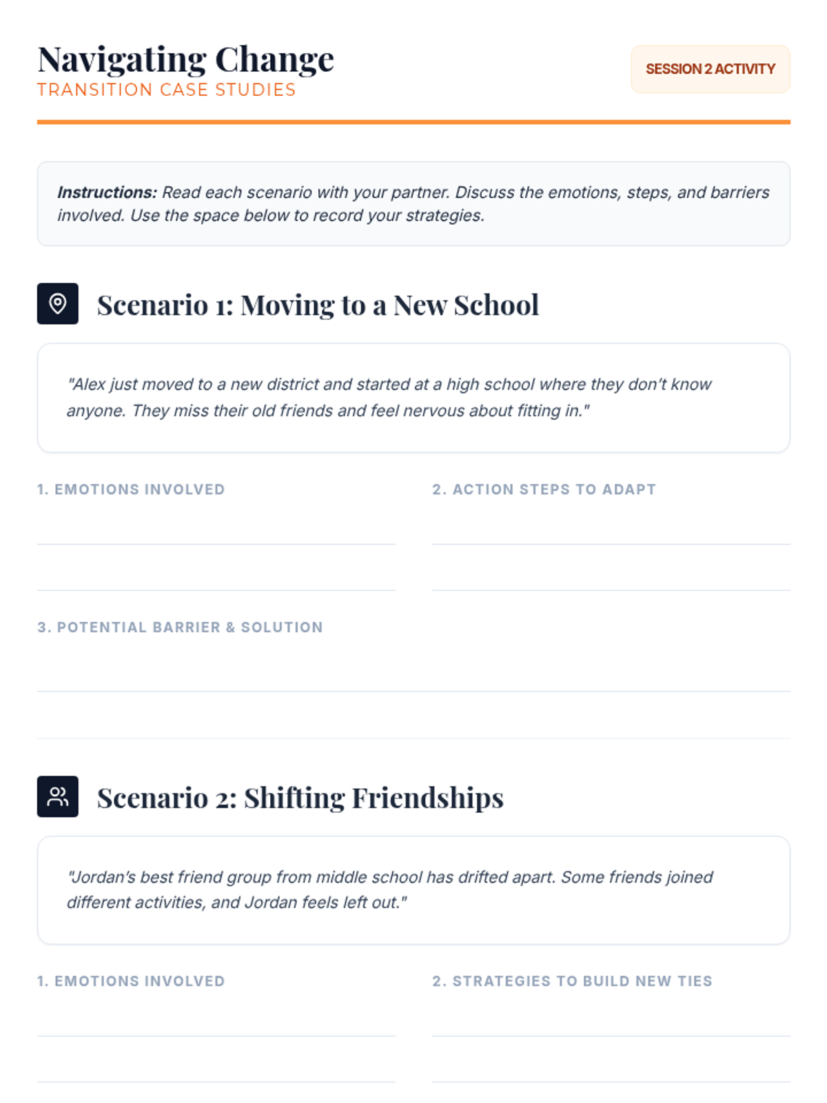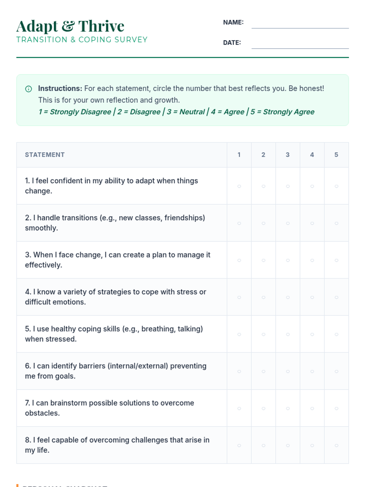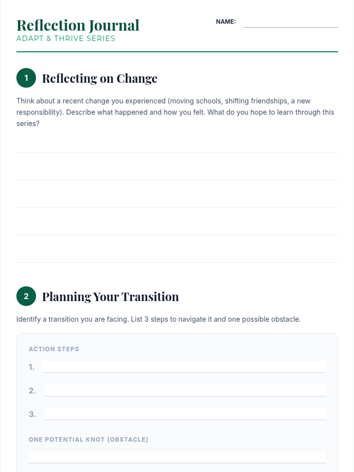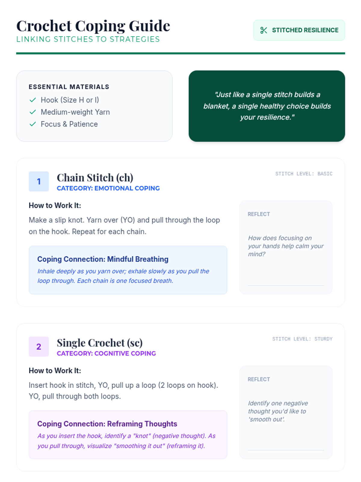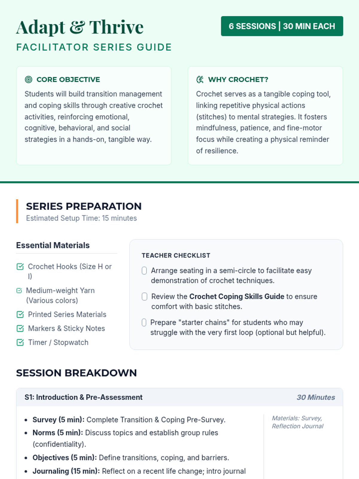 A 6-session small-group series for 11th graders focused on transition management, coping skills, and overcoming barriers through hands-on crochet activities and reflective journaling.