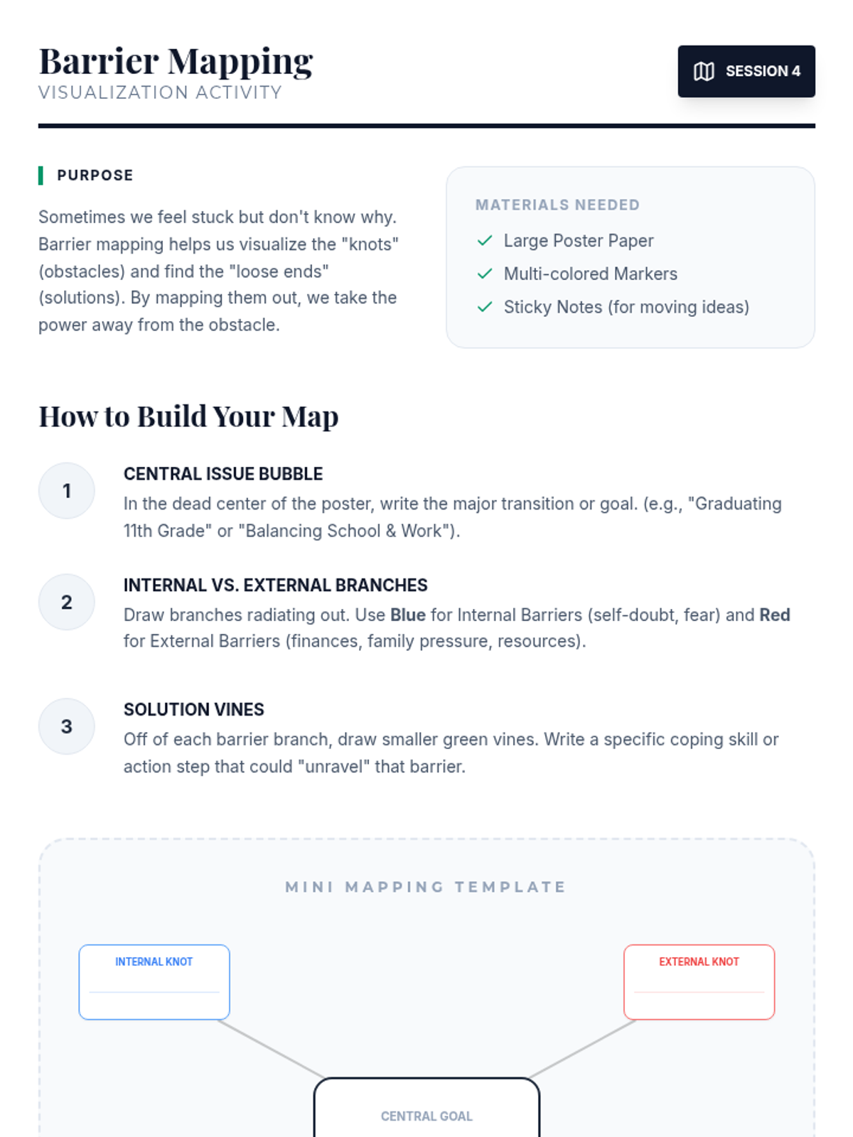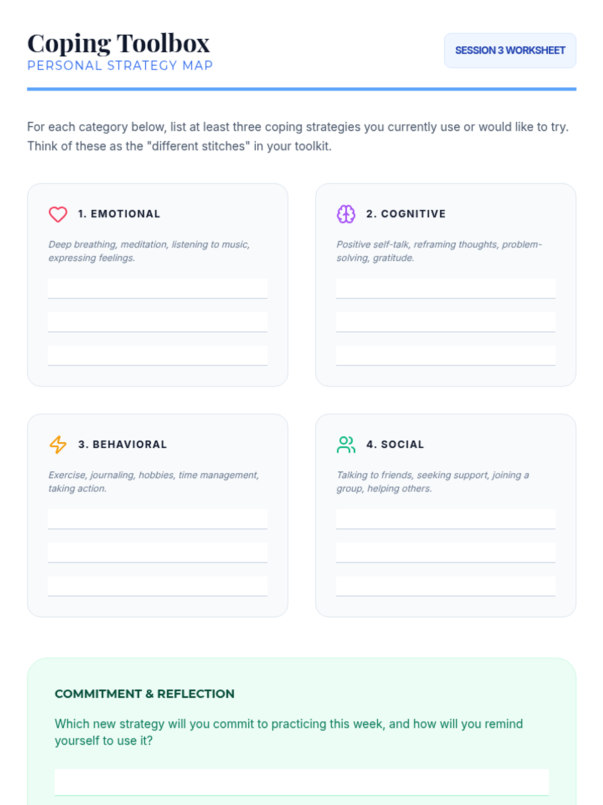 A 4-session small group counseling program for high school girls focused on identifying anxiety triggers, practicing mindfulness, and developing a personalized toolkit of coping strategies. The sequence emphasizes peer support, empowerment, and practical application within the school environment.