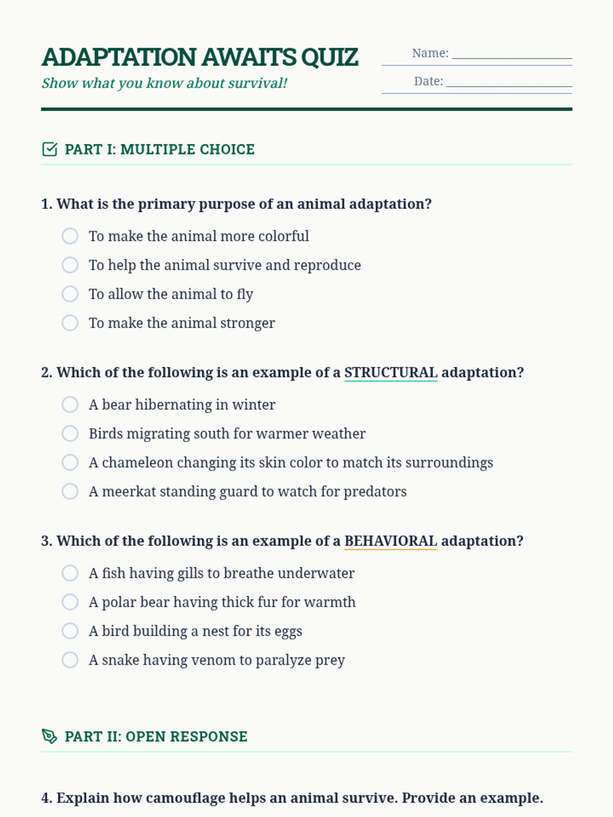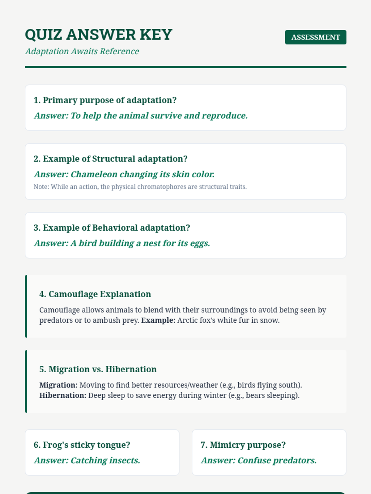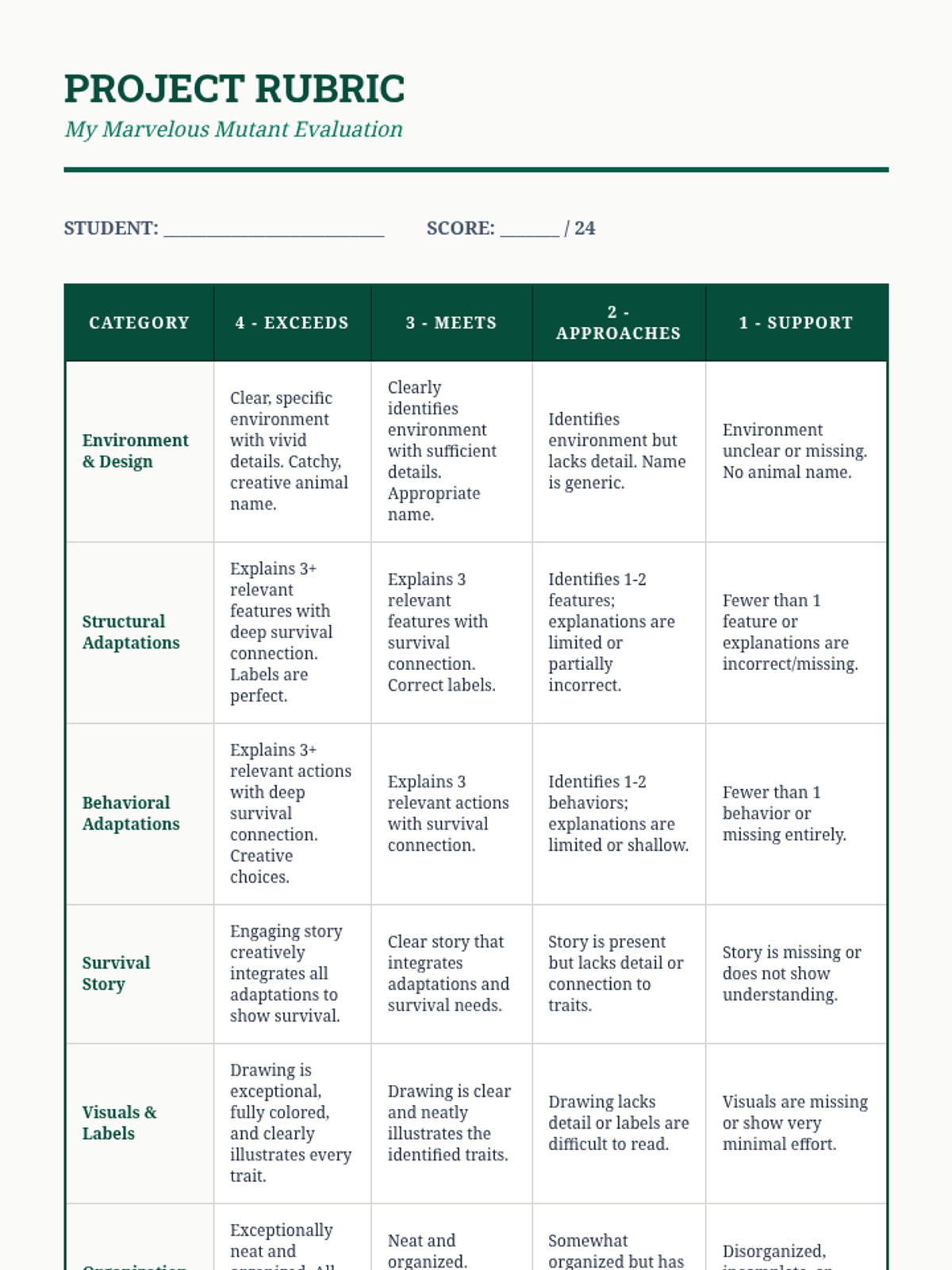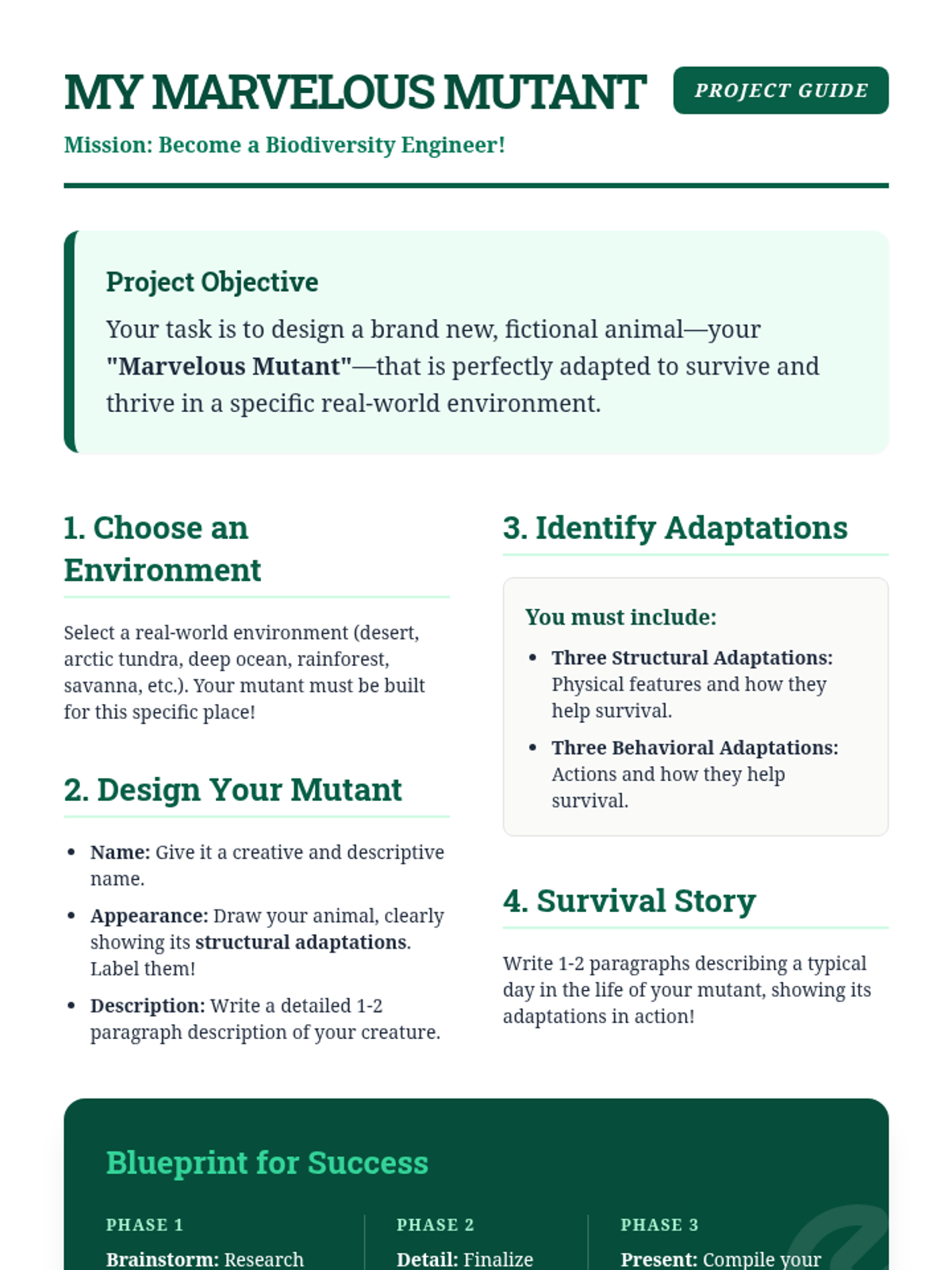 A comprehensive 2-week science sequence for 6th grade exploring animal adaptations. Students learn to distinguish between structural and behavioral traits through interactive stations, a webquest, and a creative design project.