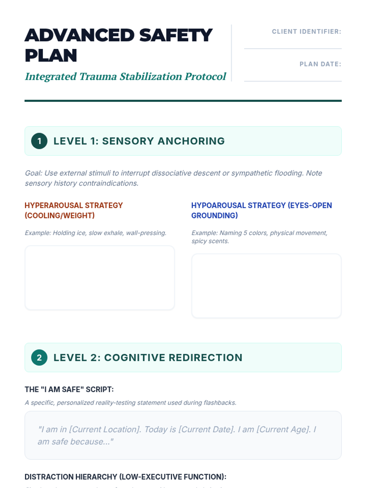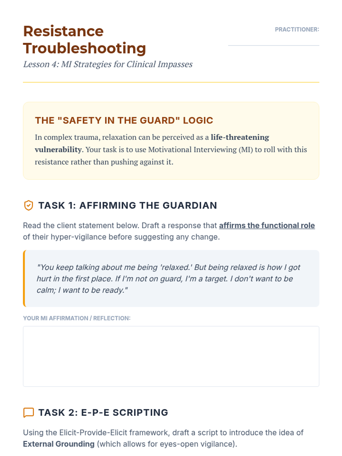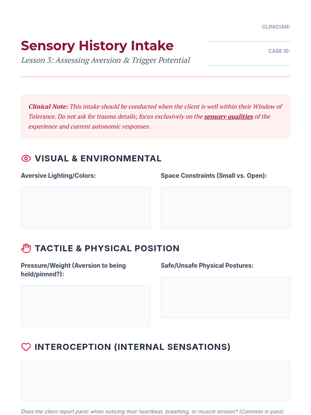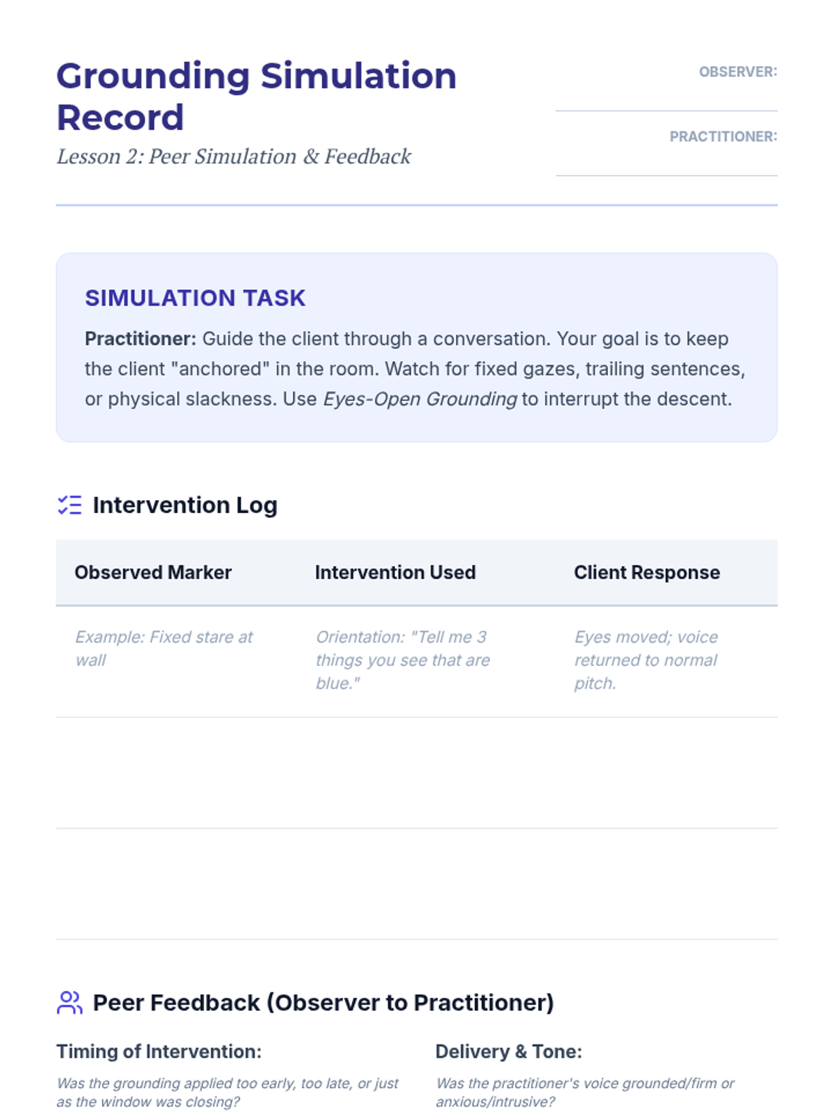 An advanced clinical sequence for graduate-level counseling students focused on the nuanced application of grounding and self-soothing techniques for clients with complex PTSD and dissociative disorders. The curriculum emphasizes the Window of Tolerance, differentiating dissociation from mindfulness, and navigating sensory triggers to prevent retraumatization.