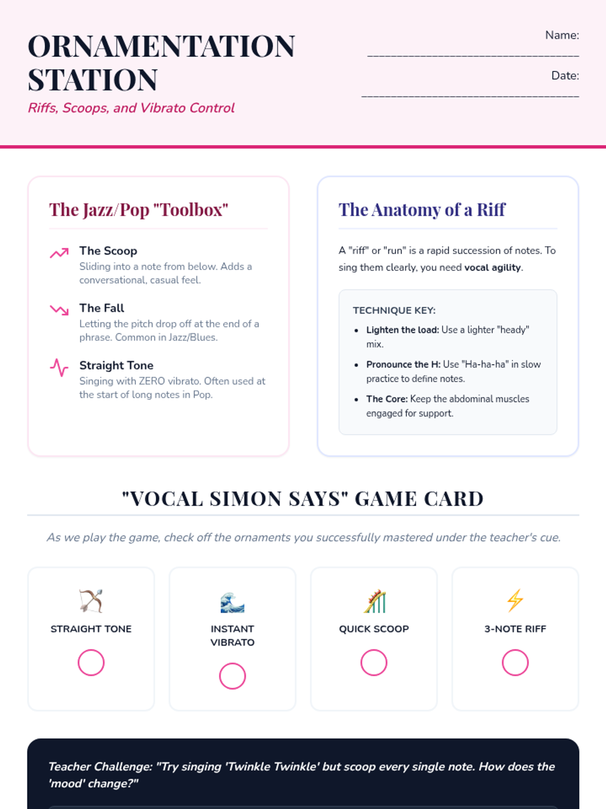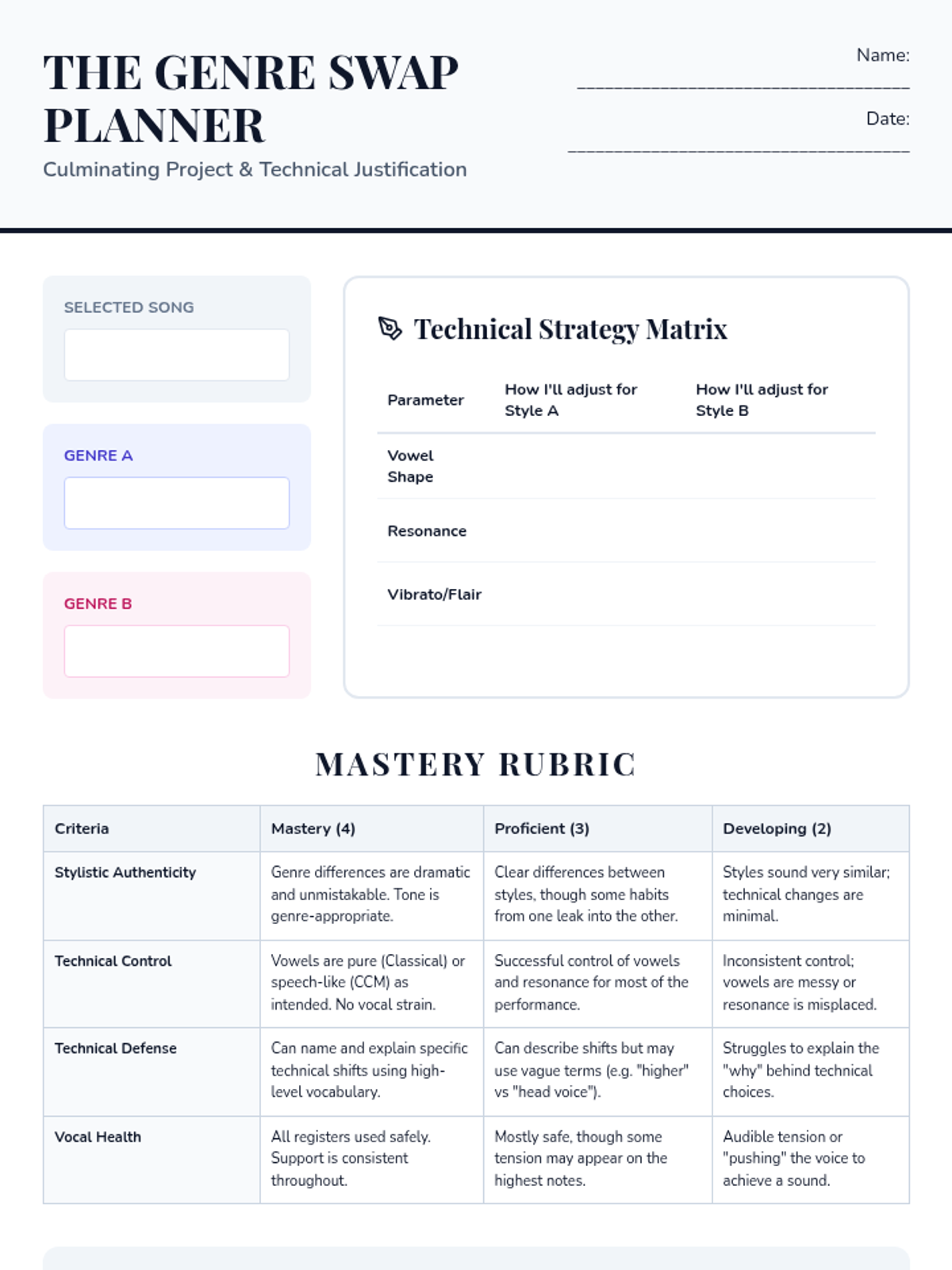 A 10th-grade vocal performance unit focused on stylistic versatility. Students explore the technical adjustments needed to transition authentically between Classical, Jazz, Pop, and Musical Theater styles while maintaining vocal health.
