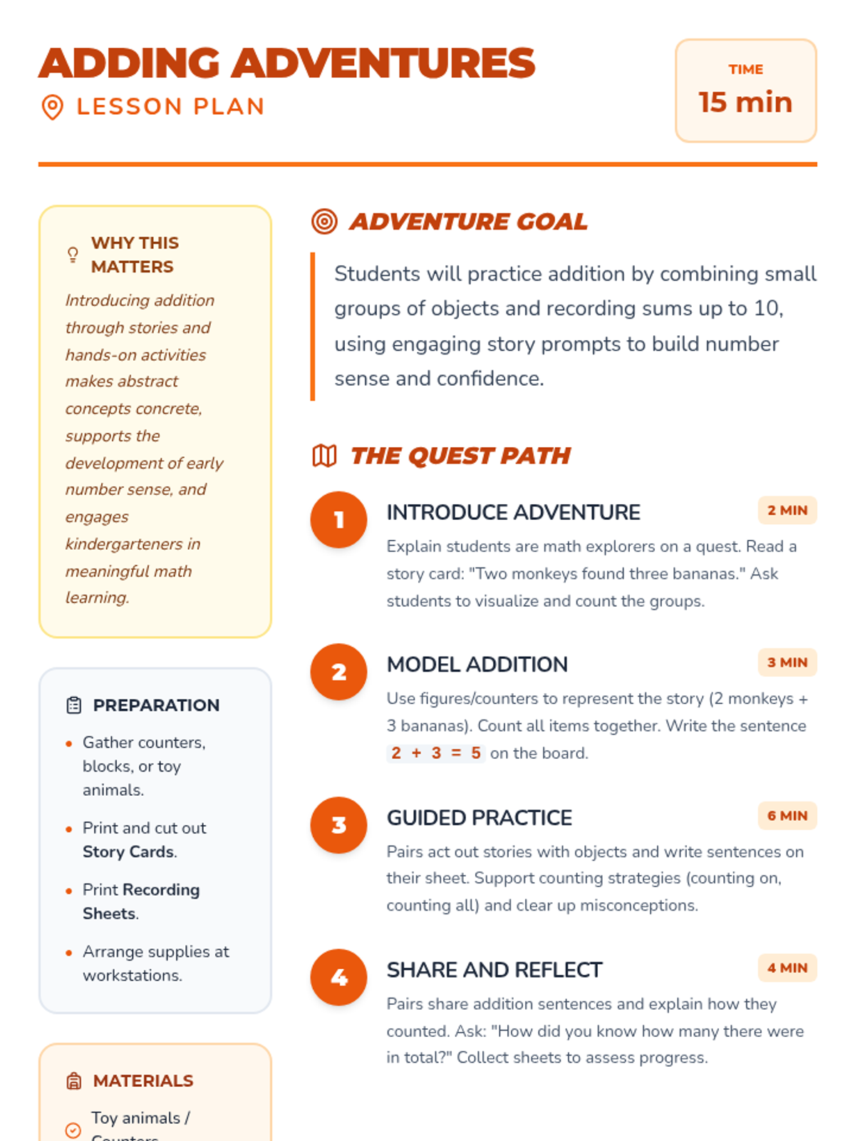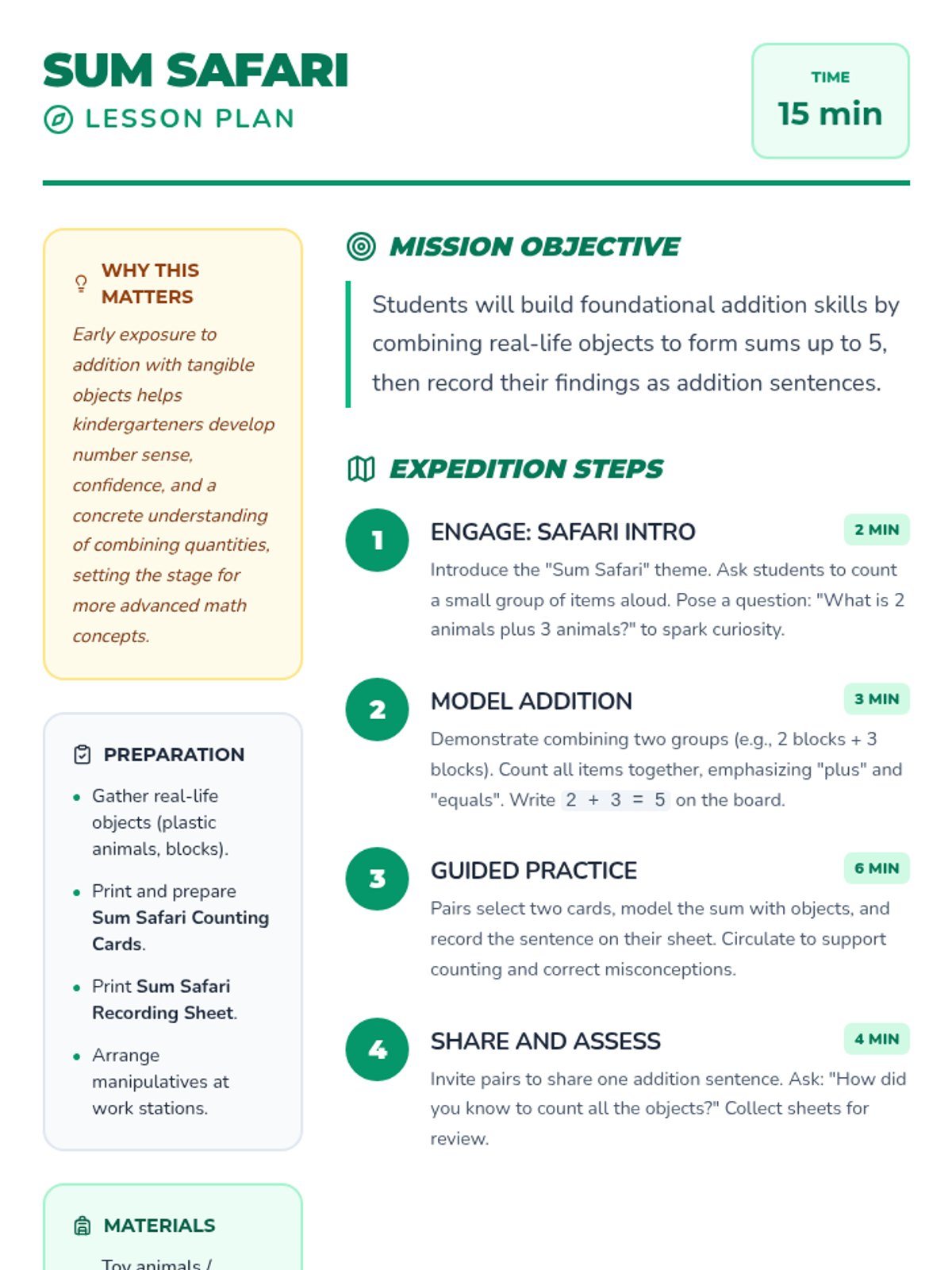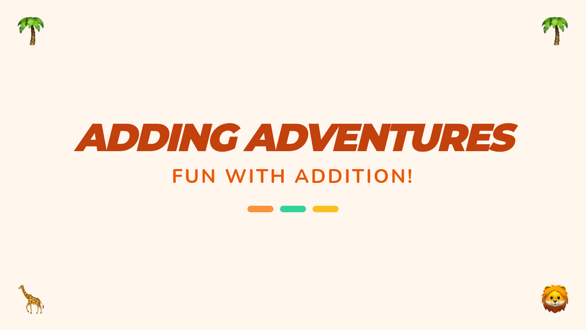 A kindergarten math sequence introducing addition through a safari theme and story-based adventures, progressing from sums of 5 to sums of 10.