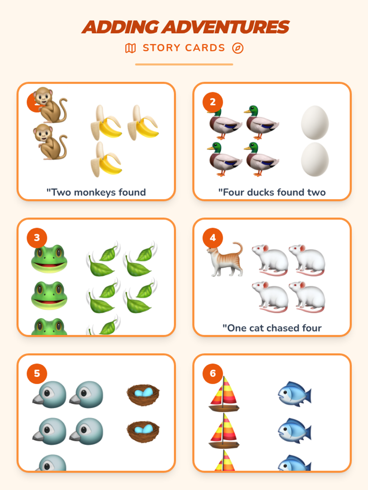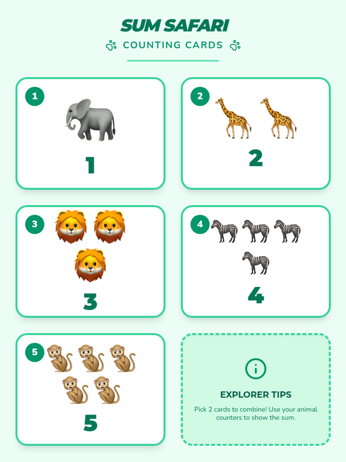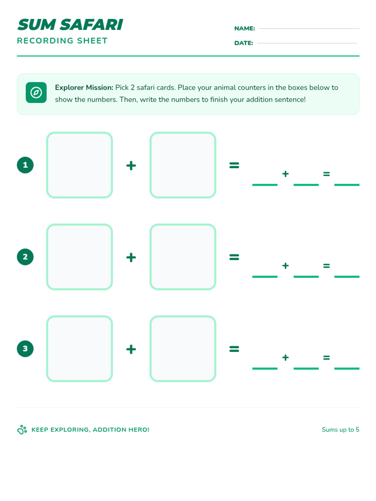 A kindergarten math sequence introducing addition through a safari theme and story-based adventures, progressing from sums of 5 to sums of 10.
