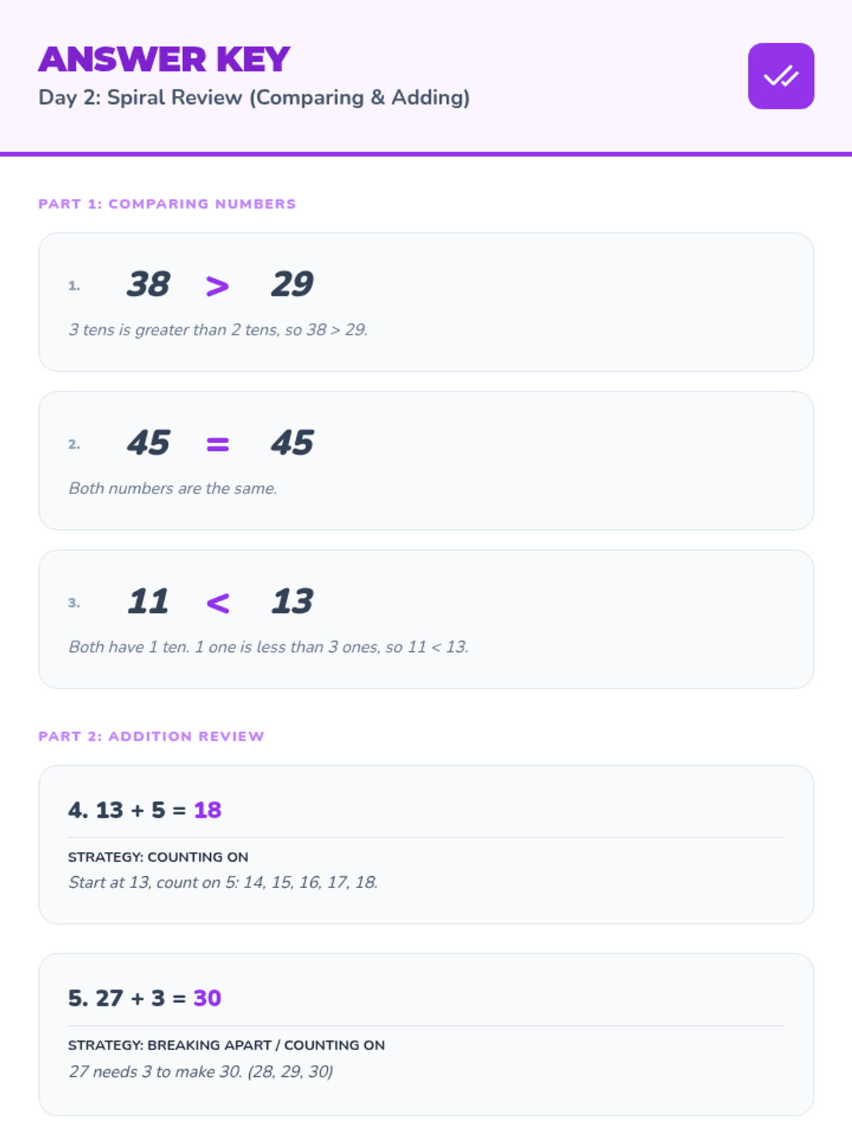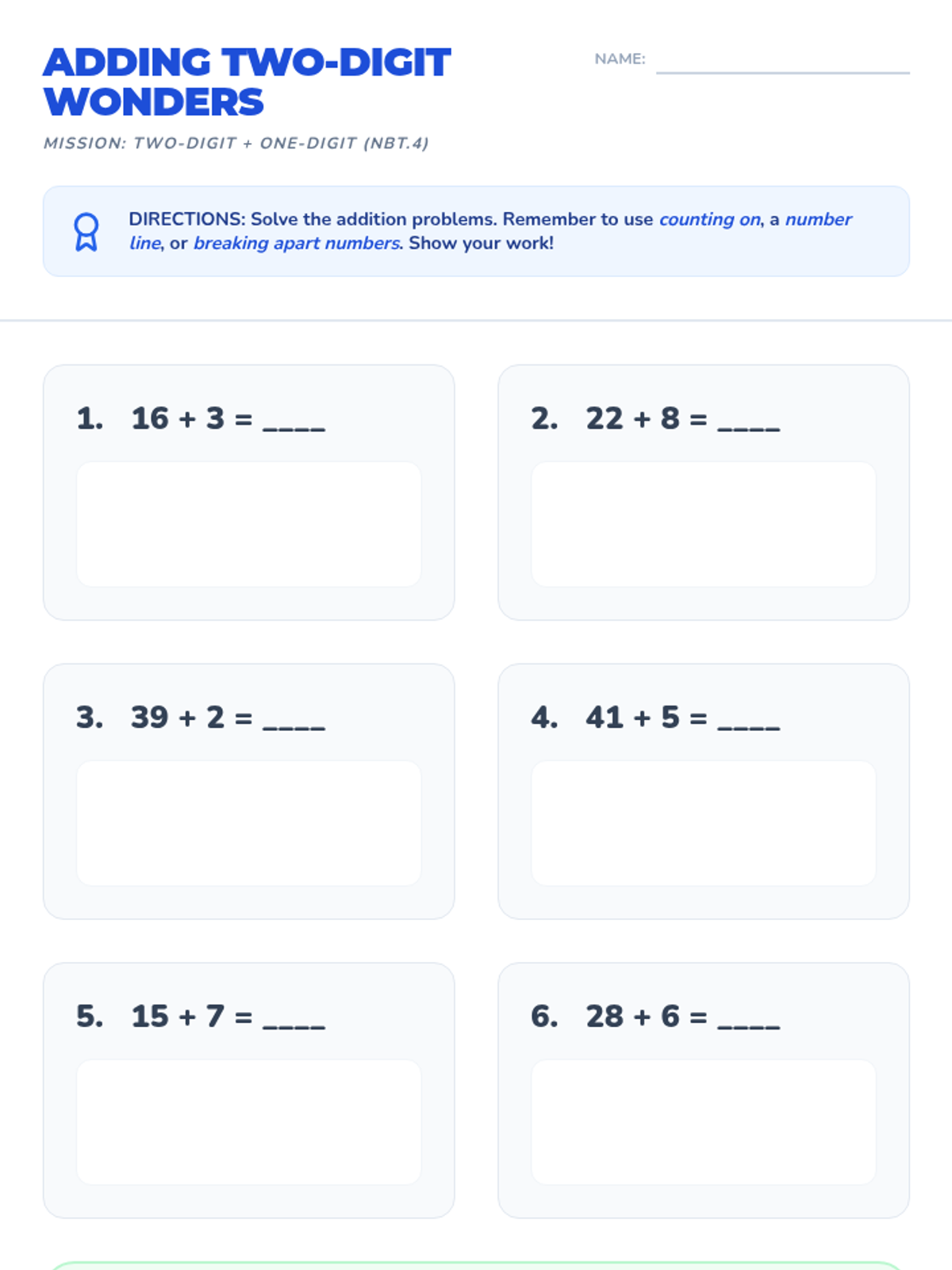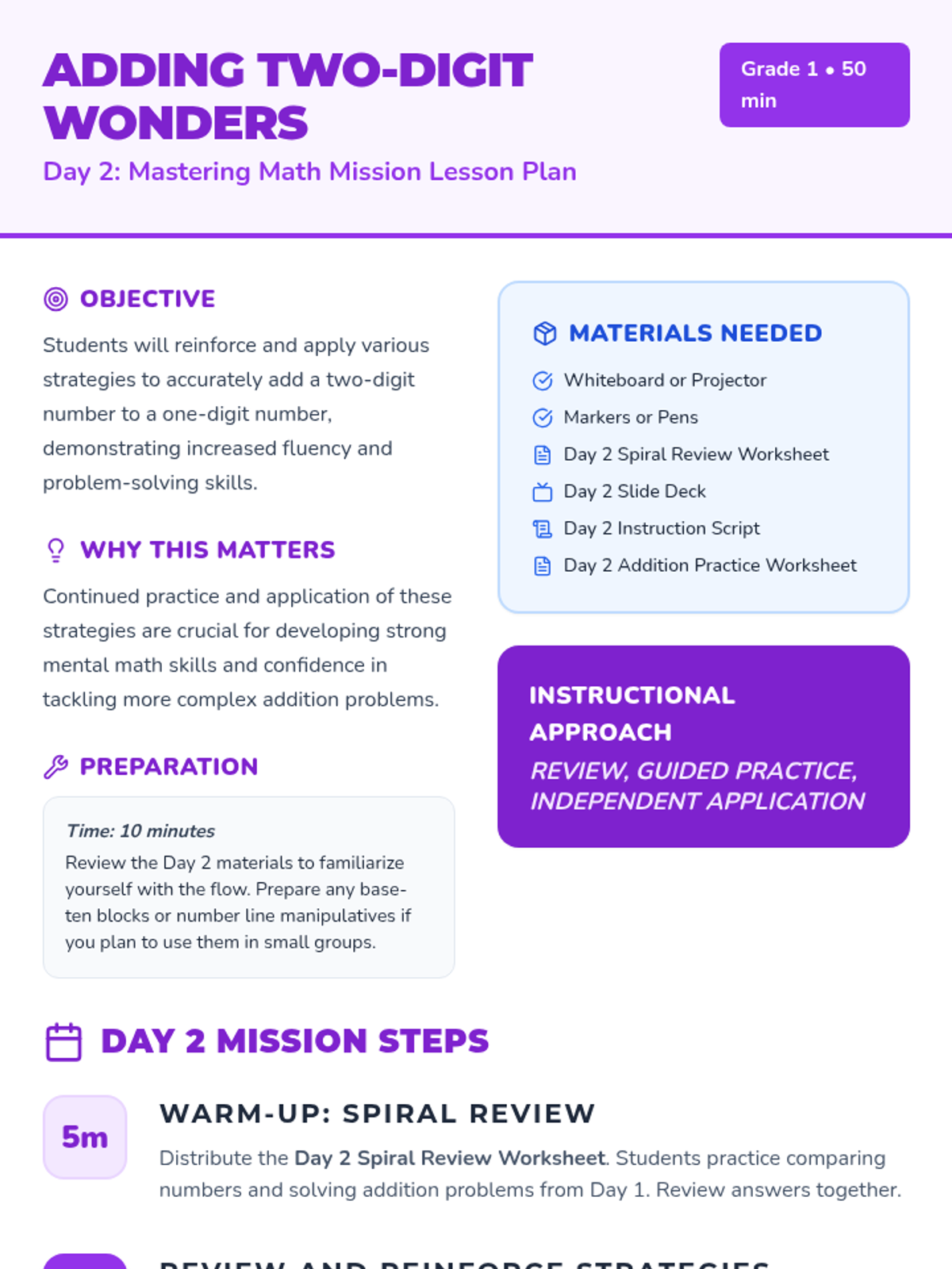 A 2-day sequence for first-grade students focused on adding two-digit numbers to one-digit numbers using strategies like counting on, number lines, and breaking apart. Students also practice comparing numbers and solving real-world word problems.