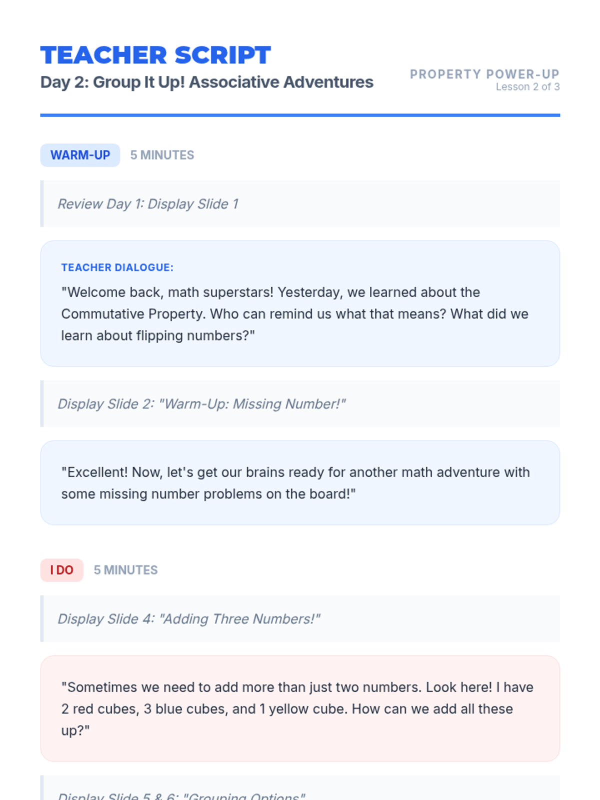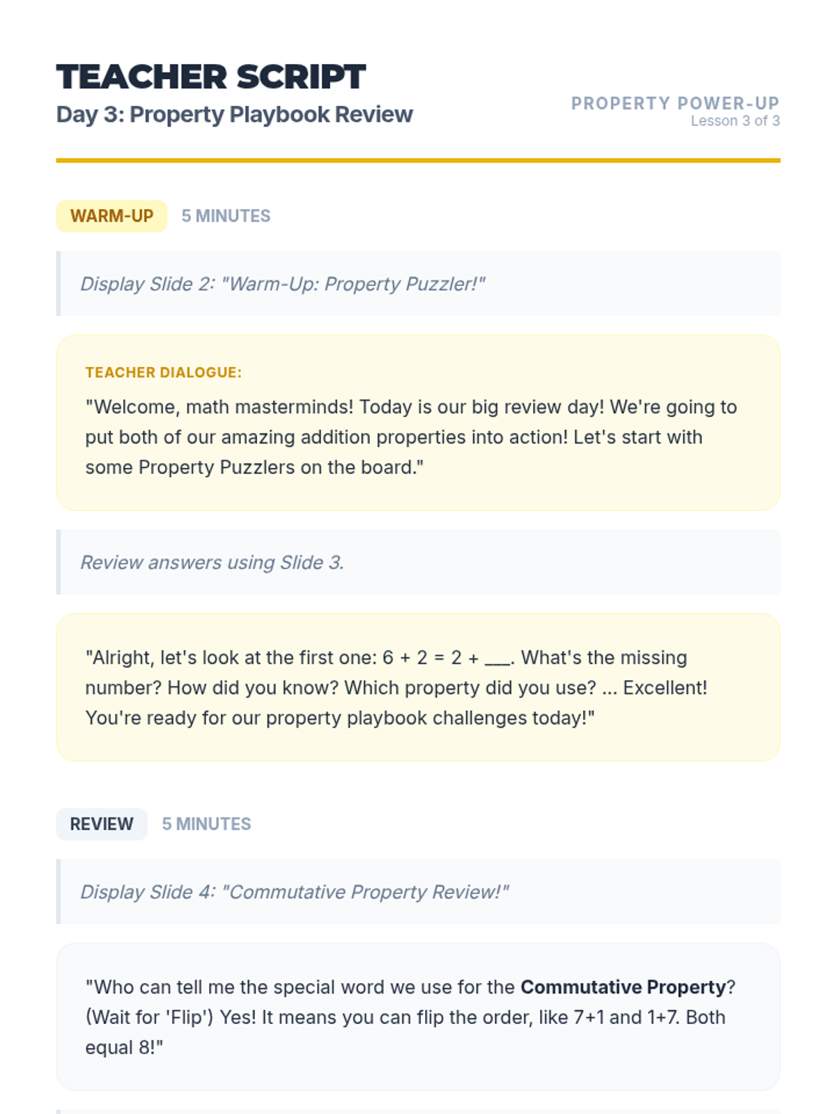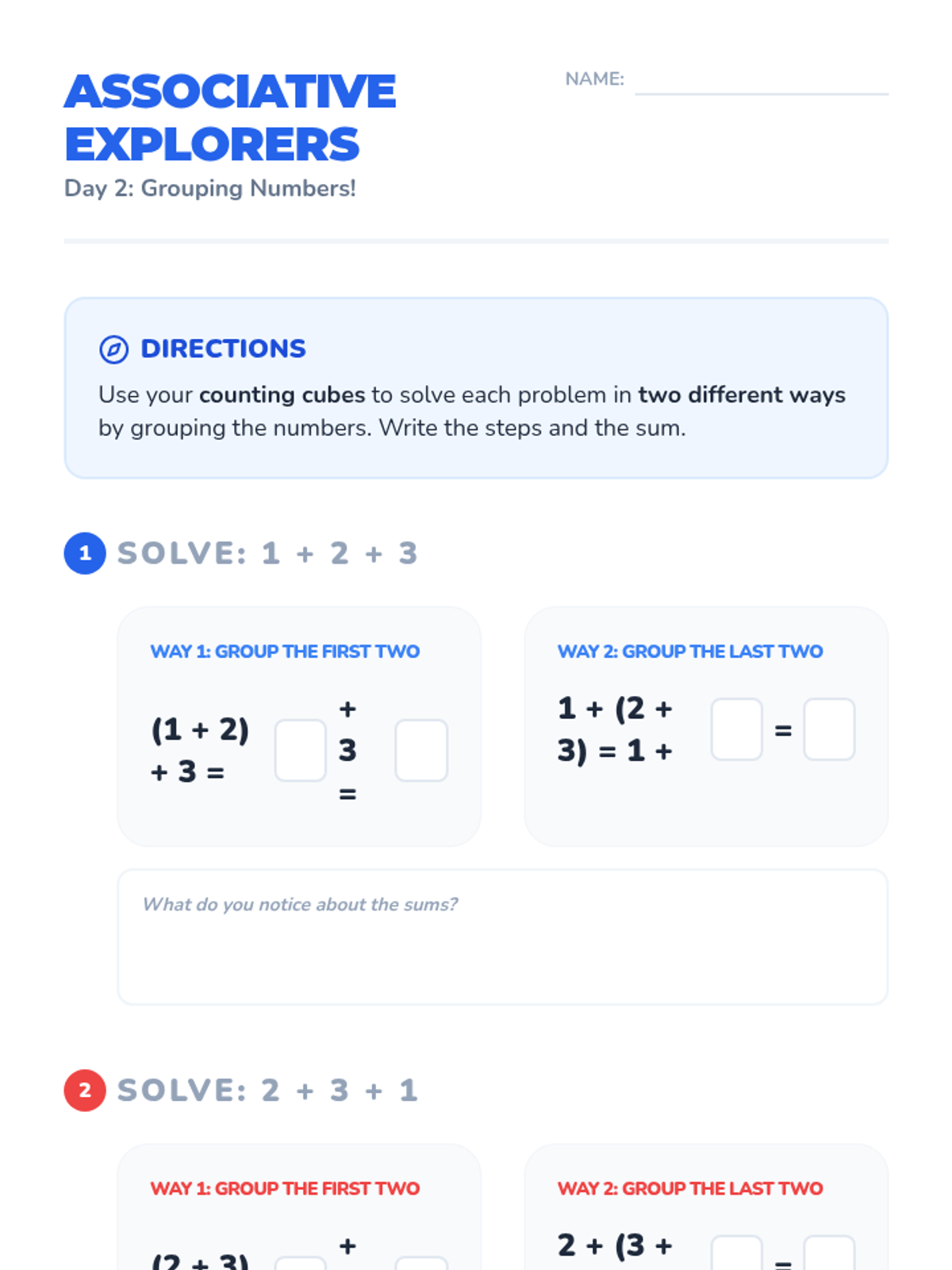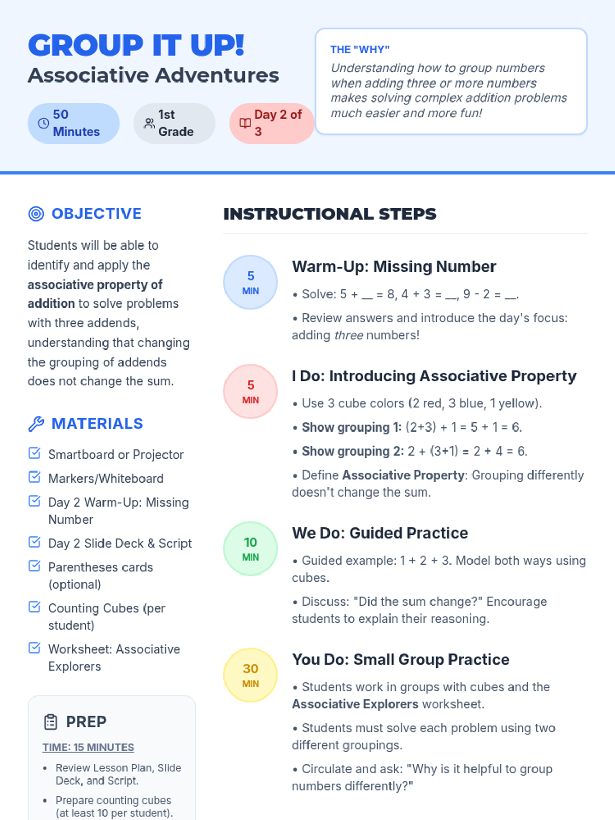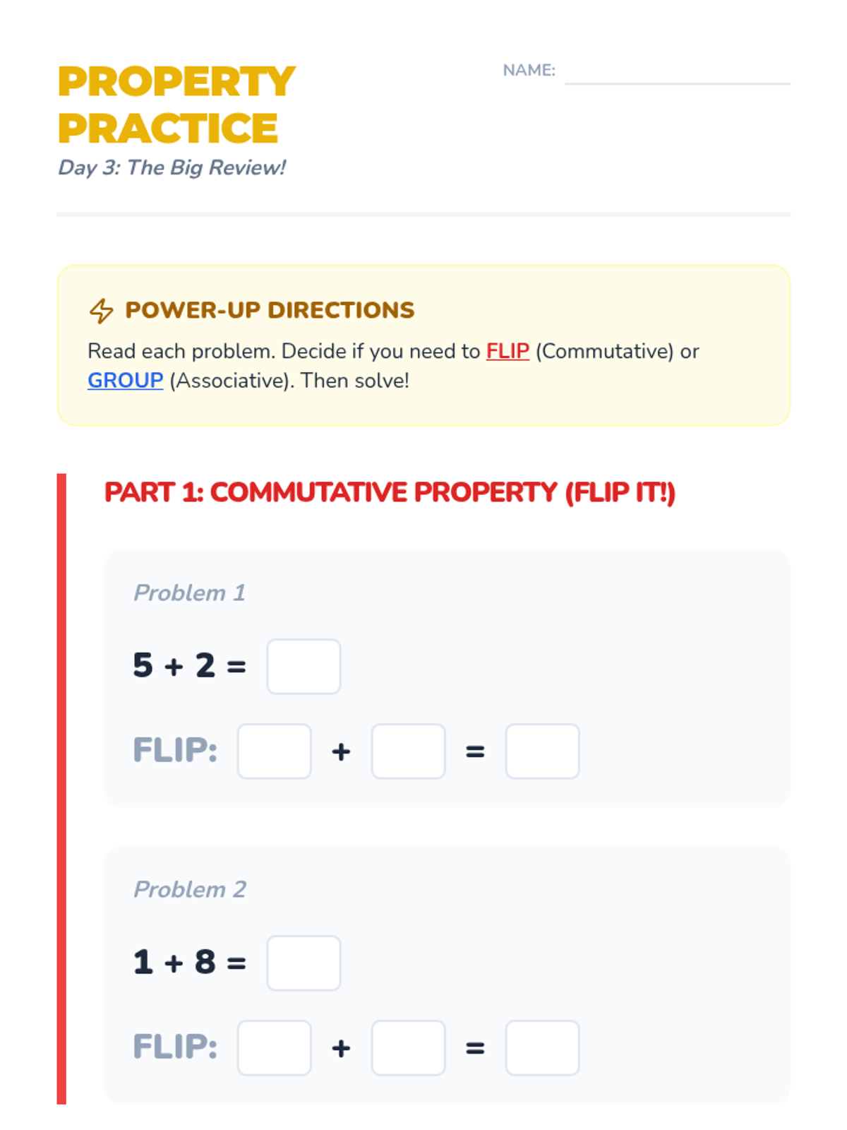 A three-day spiral review sequence for 1st-grade students to master the commutative and associative properties of addition through manipulatives and guided practice.