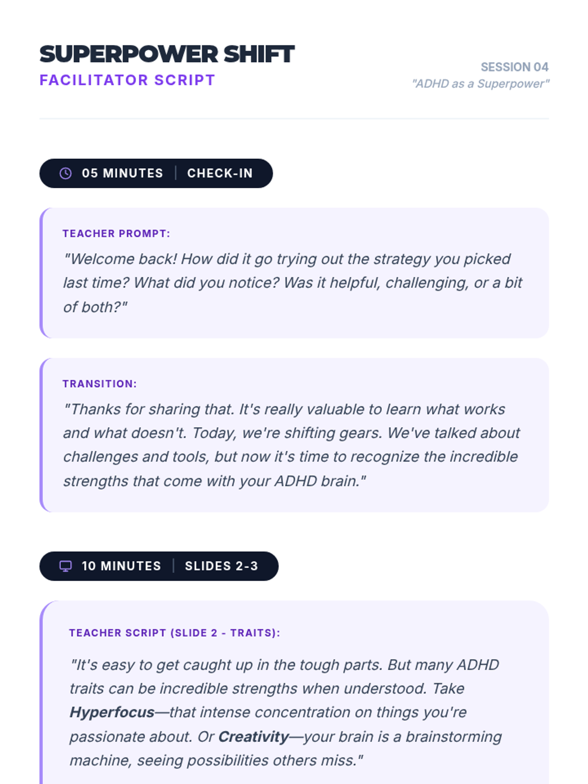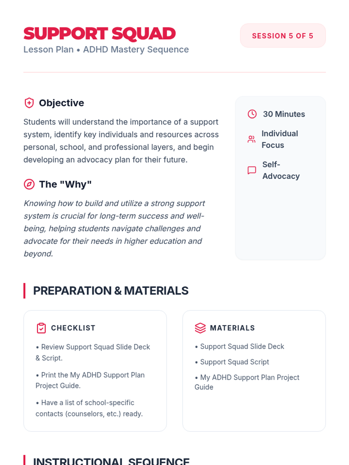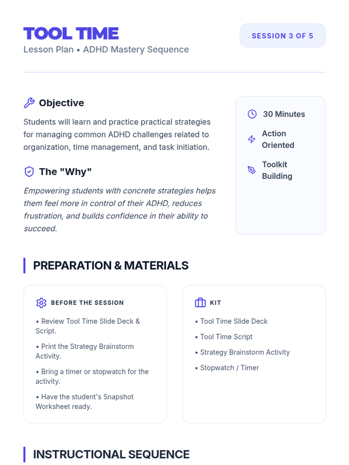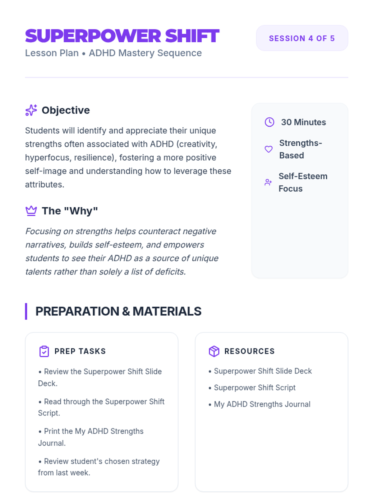 A comprehensive 5-session sequence designed for 12th-grade students to understand their ADHD diagnosis, identify personal impacts, build a toolkit of strategies, and embrace their unique strengths.