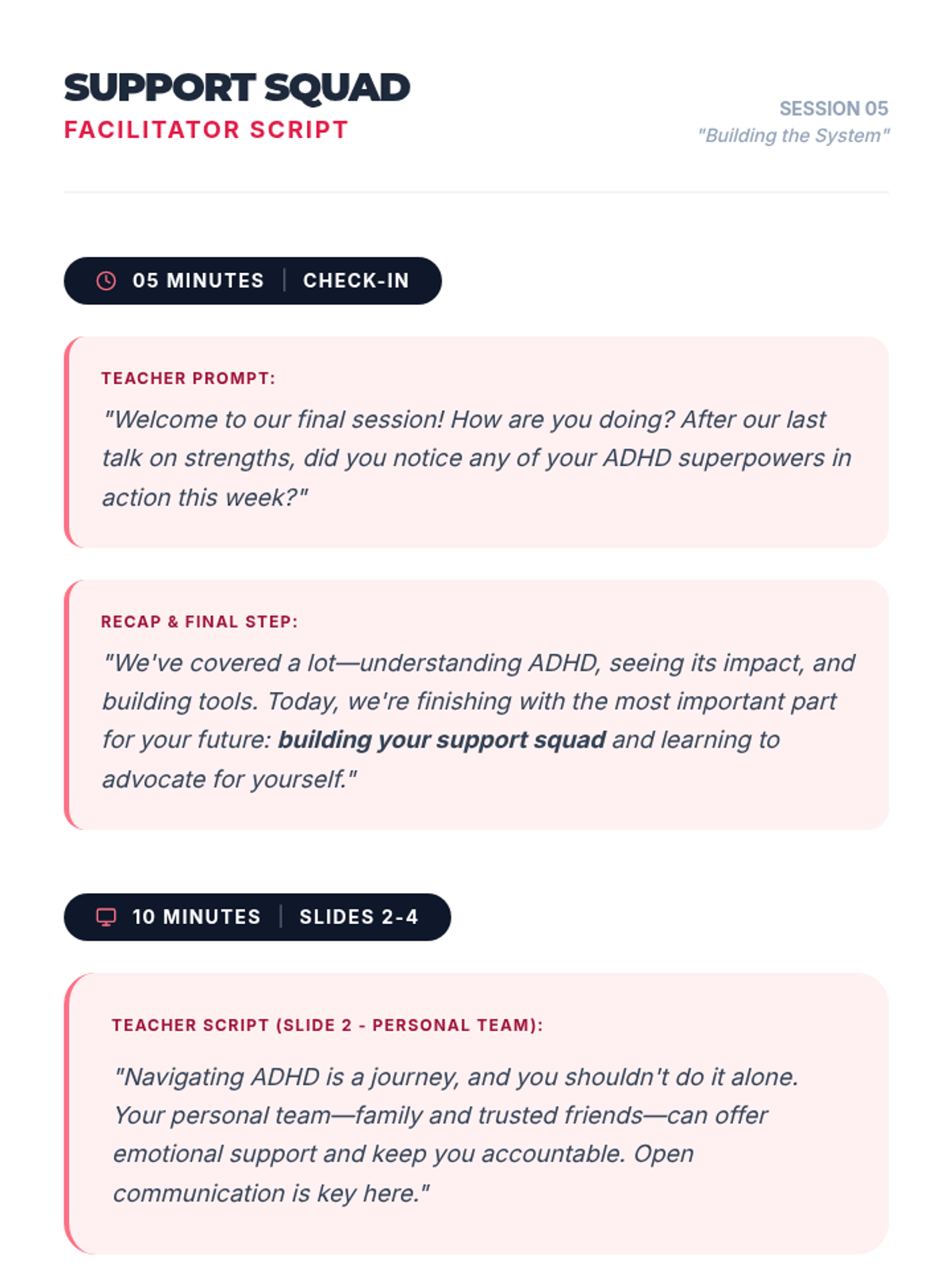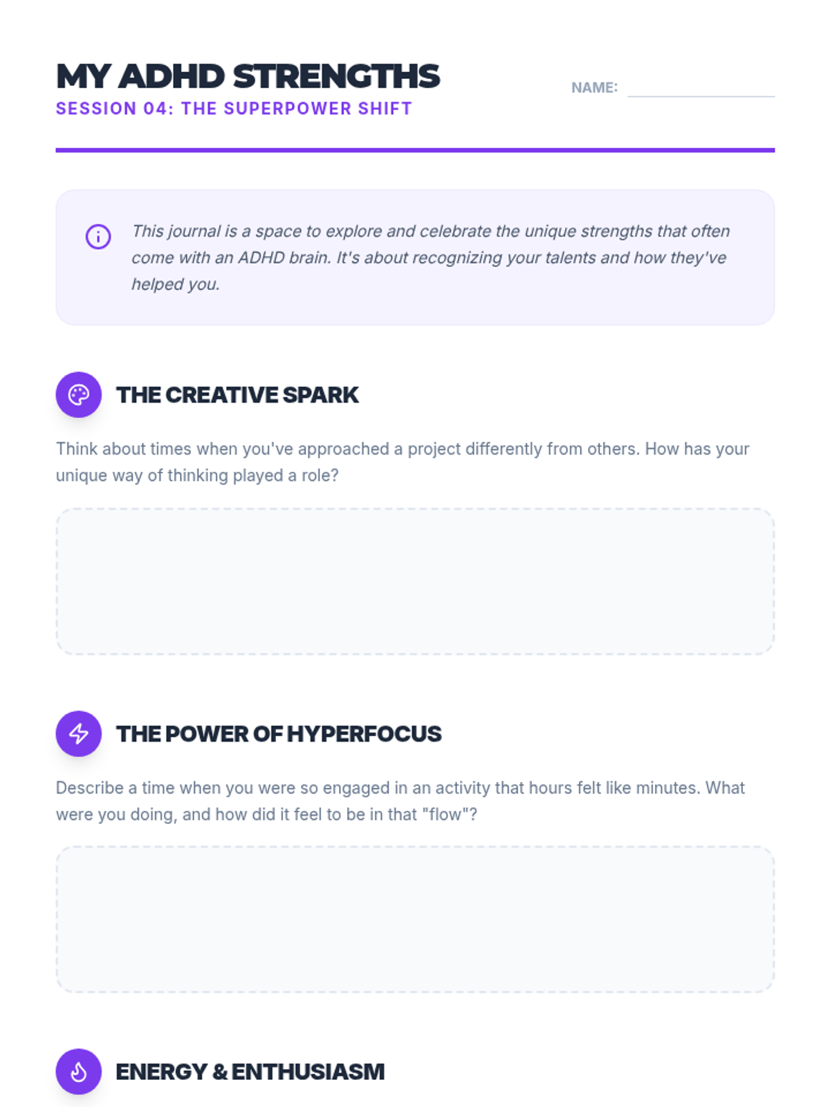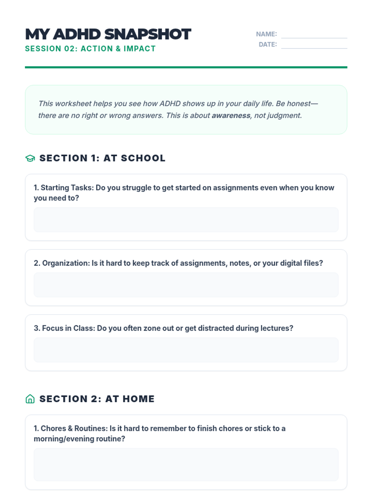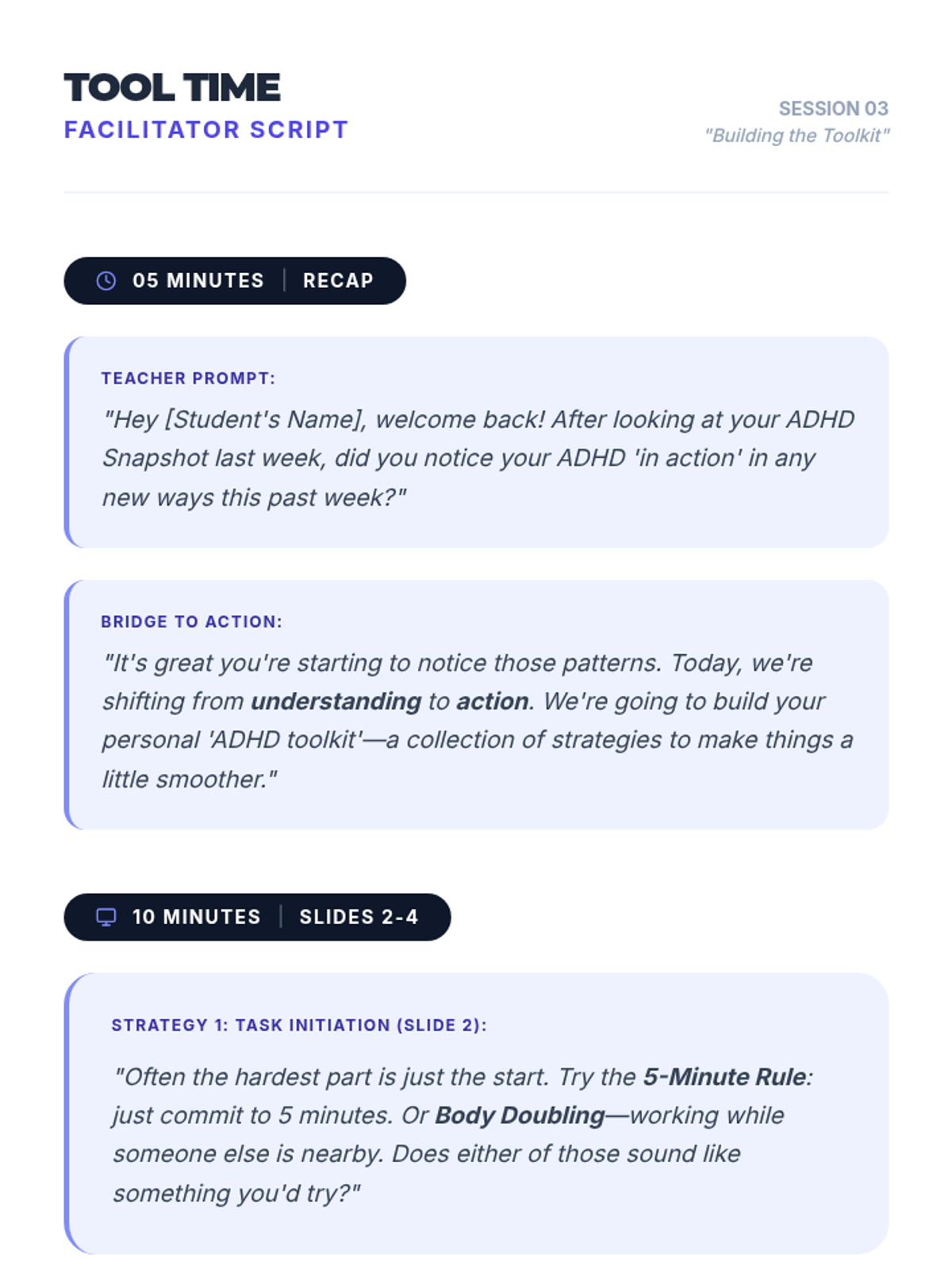 A comprehensive 5-session sequence designed for 12th-grade students to understand their ADHD diagnosis, identify personal impacts, build a toolkit of strategies, and embrace their unique strengths.