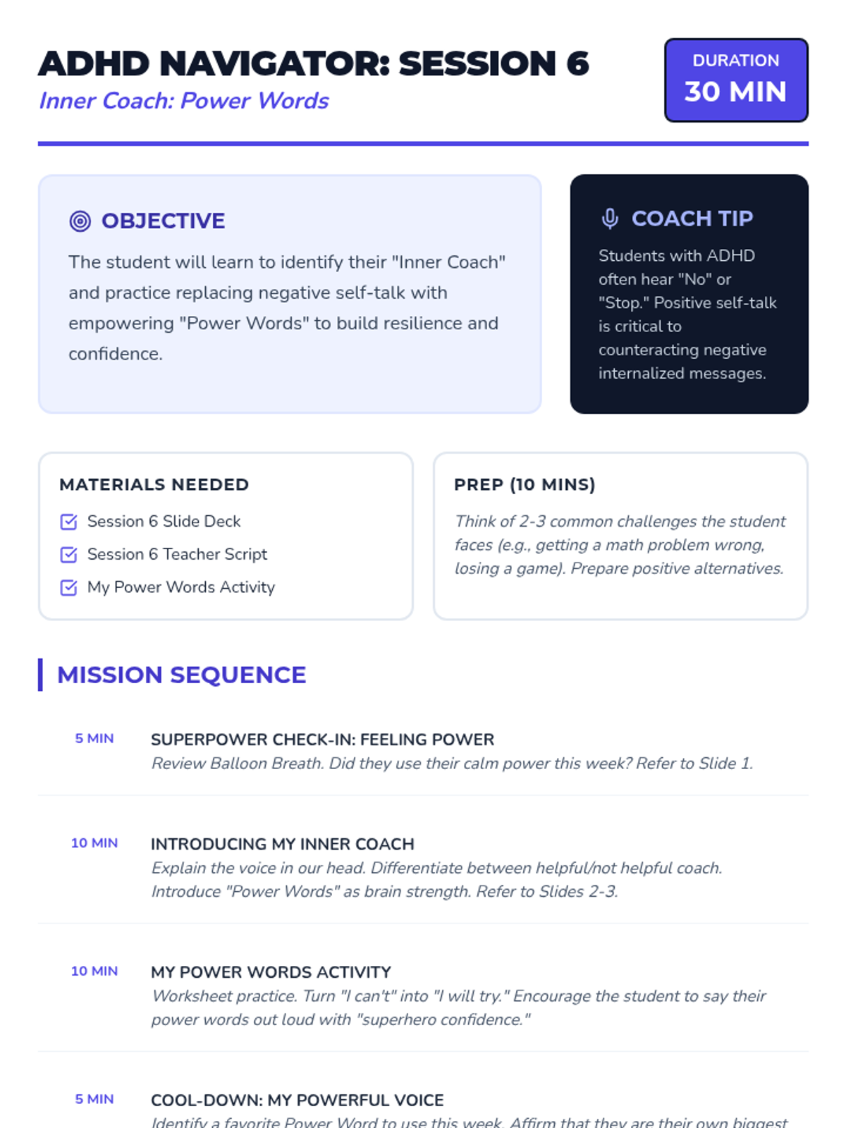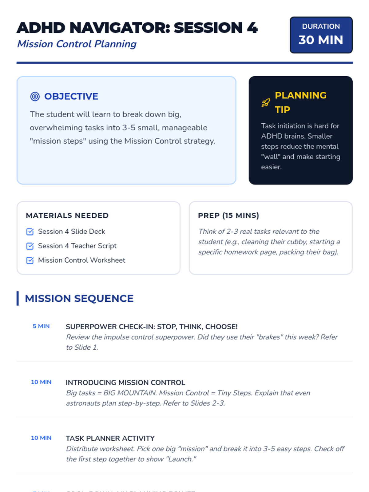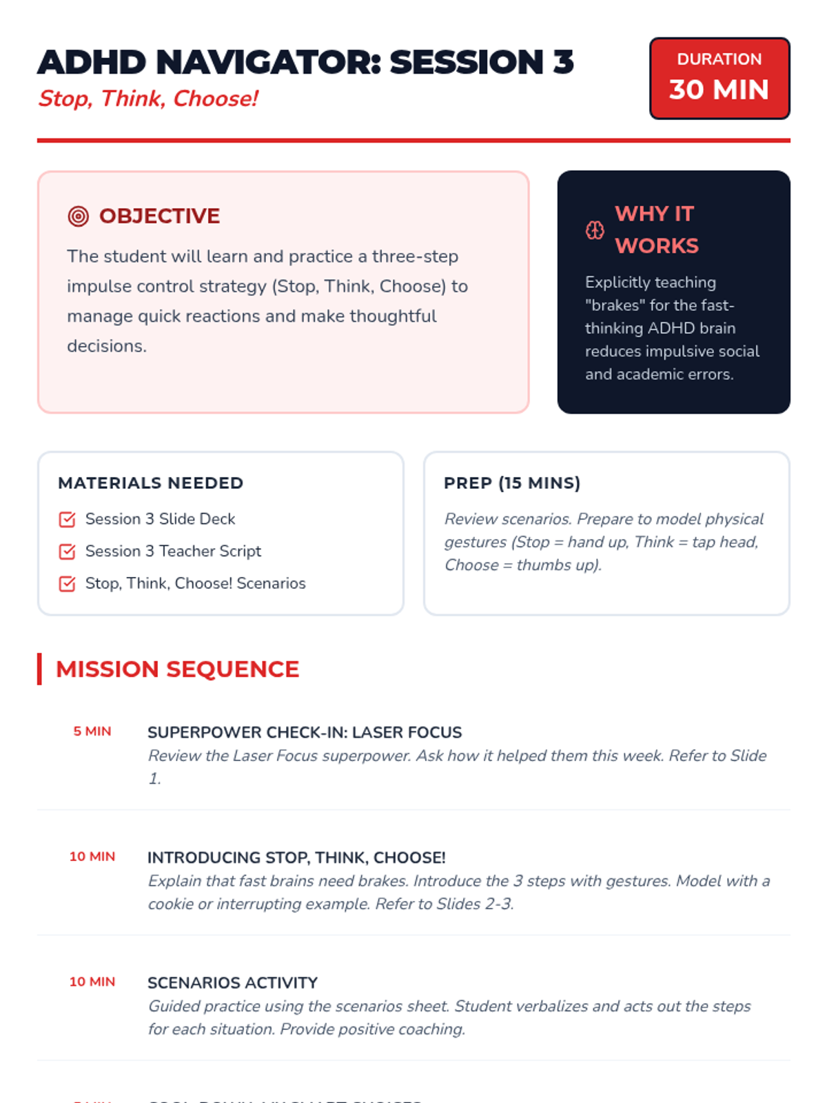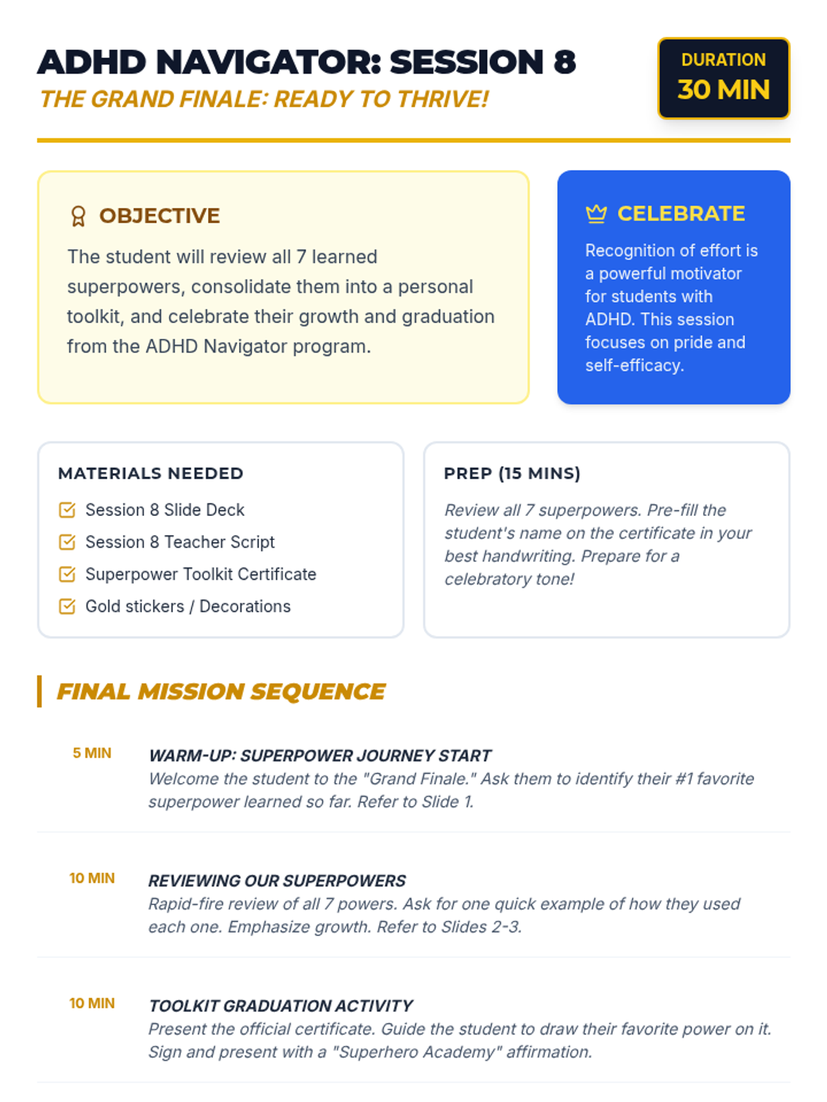 An 8-session individual Tier 3 program for a 3rd-grade student with severe ADHD, focusing on strengths, self-regulation, and organizational strategies through a 'Superhero Academy' theme.