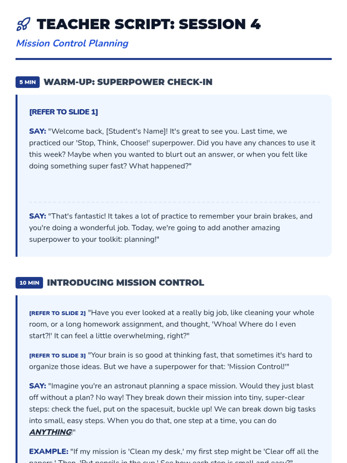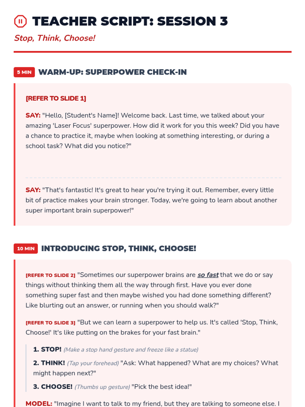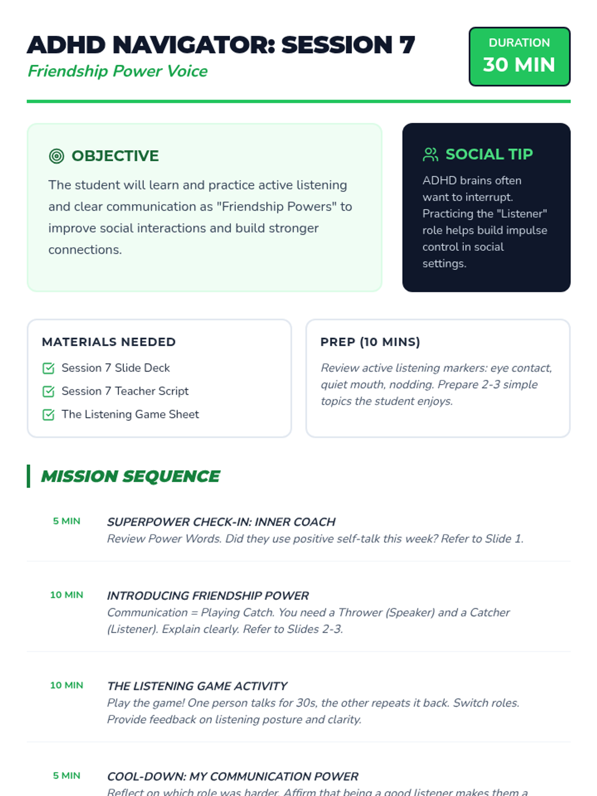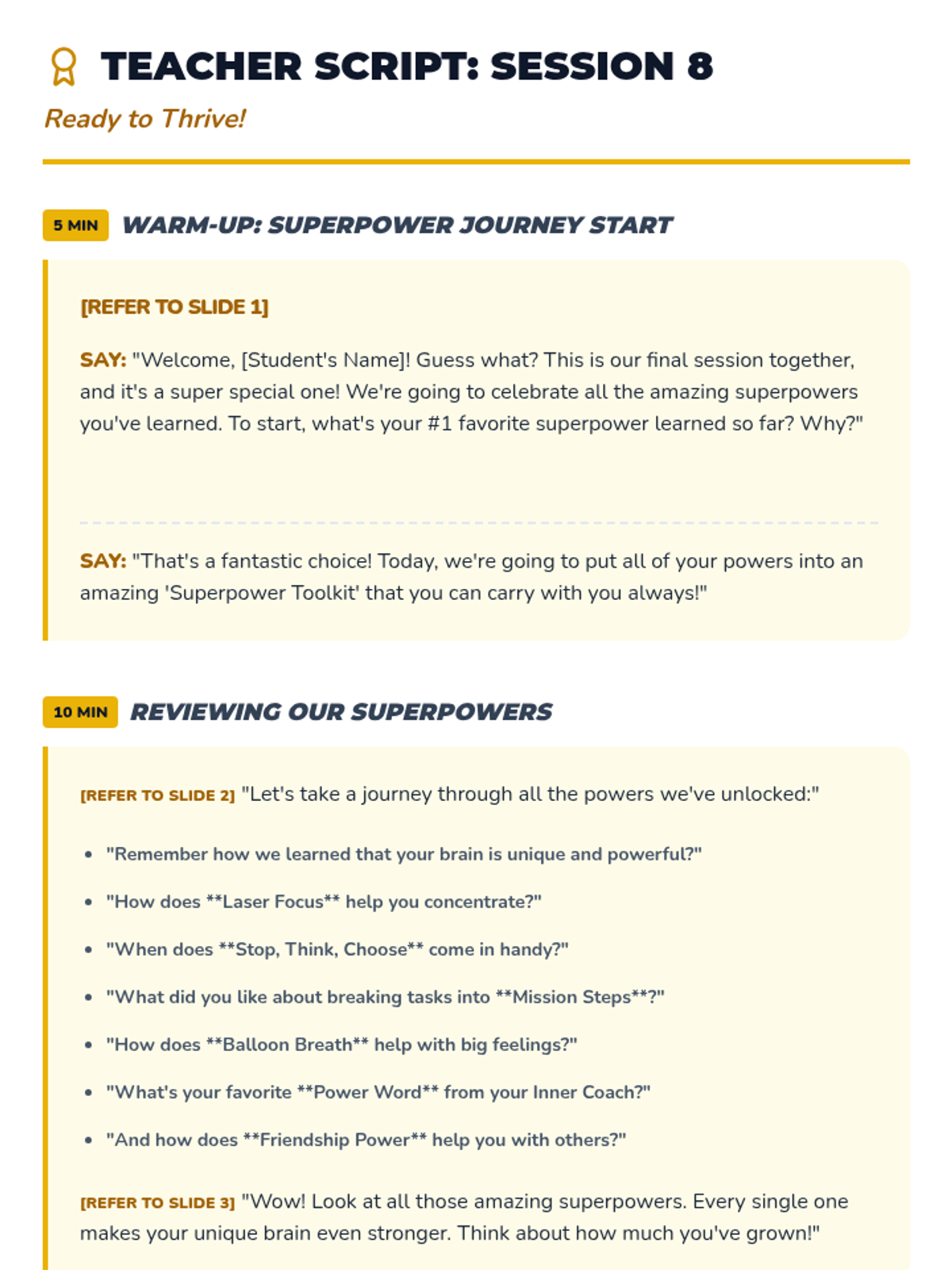 An 8-session individual Tier 3 program for a 3rd-grade student with severe ADHD, focusing on strengths, self-regulation, and organizational strategies through a 'Superhero Academy' theme.