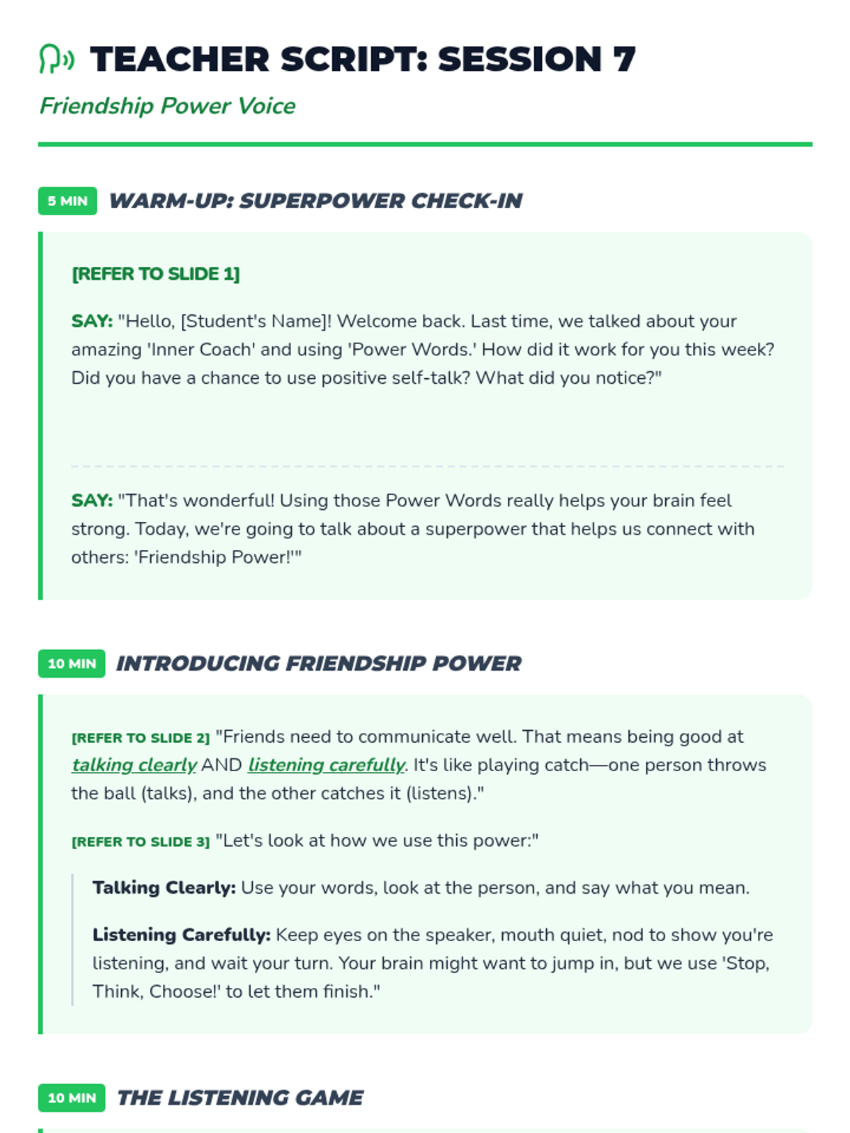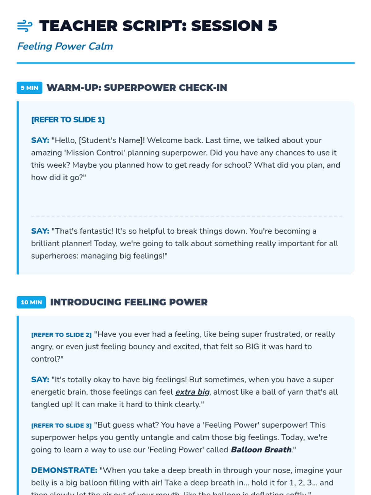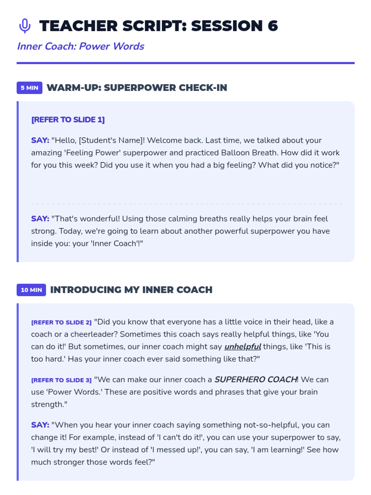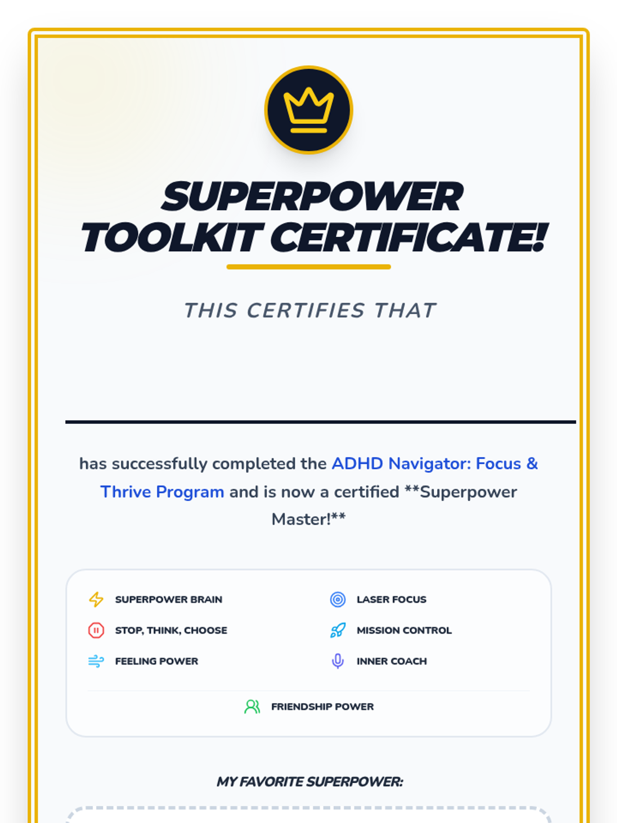 An 8-session individual Tier 3 program for a 3rd-grade student with severe ADHD, focusing on strengths, self-regulation, and organizational strategies through a 'Superhero Academy' theme.