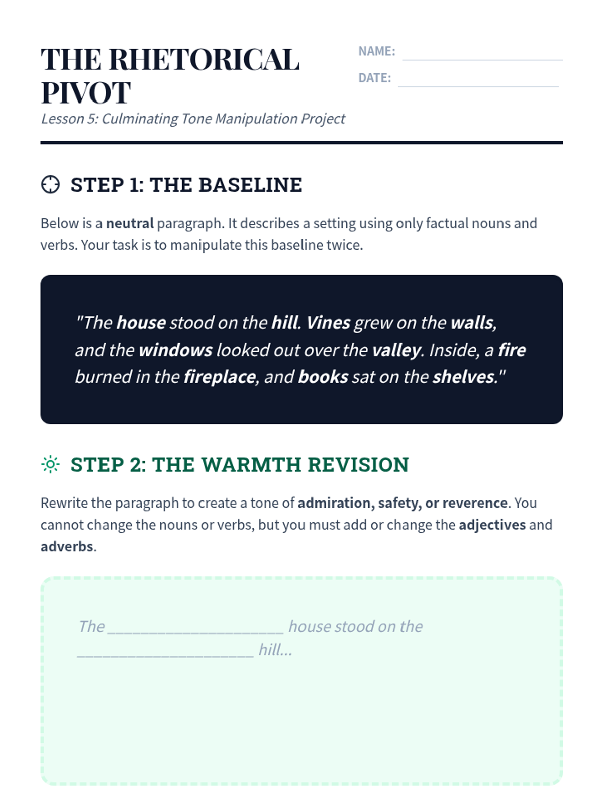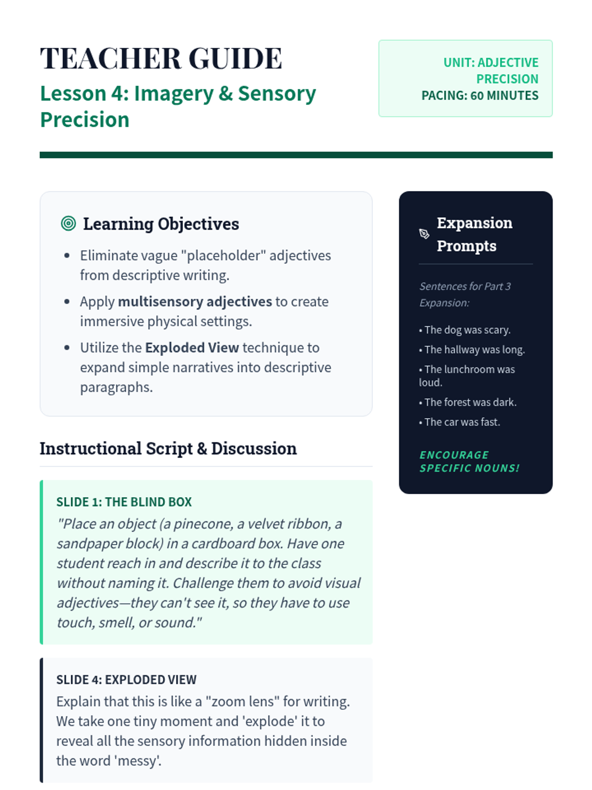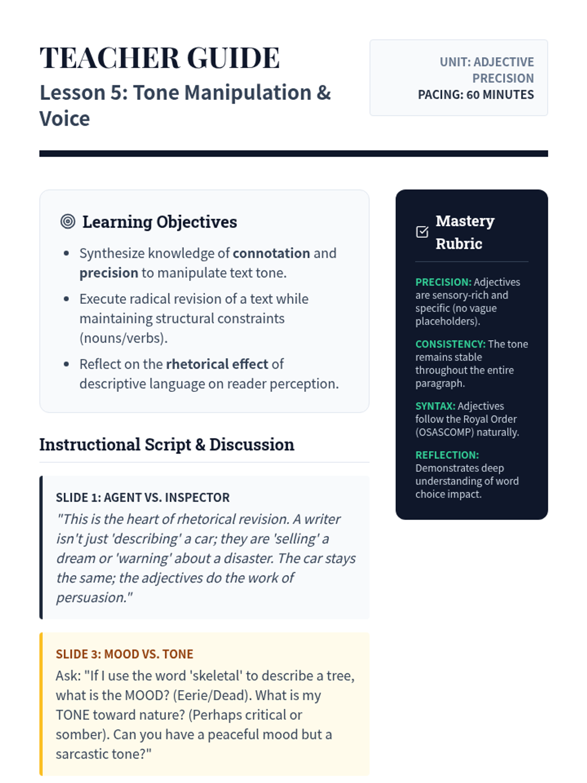 A comprehensive 10th-grade sequence exploring the rhetorical power of adjectives, moving from basic connotation to syntactic logic and strategic revision for tone and mood.
