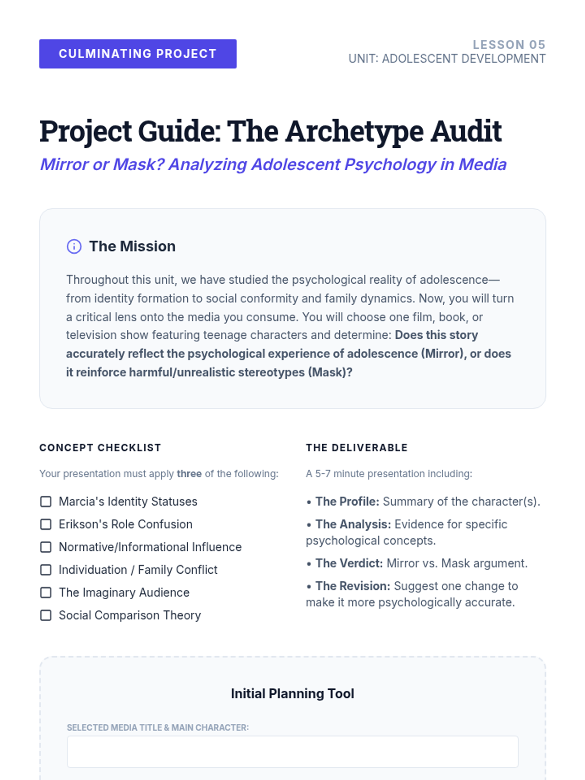 This sequence explores the psychological and social dimensions of growing up, focusing on identity formation, peer influence, family dynamics, and digital impact. Students apply classical theories like Erikson and Marcia to understand the transition from internal self-definition to external social navigation.