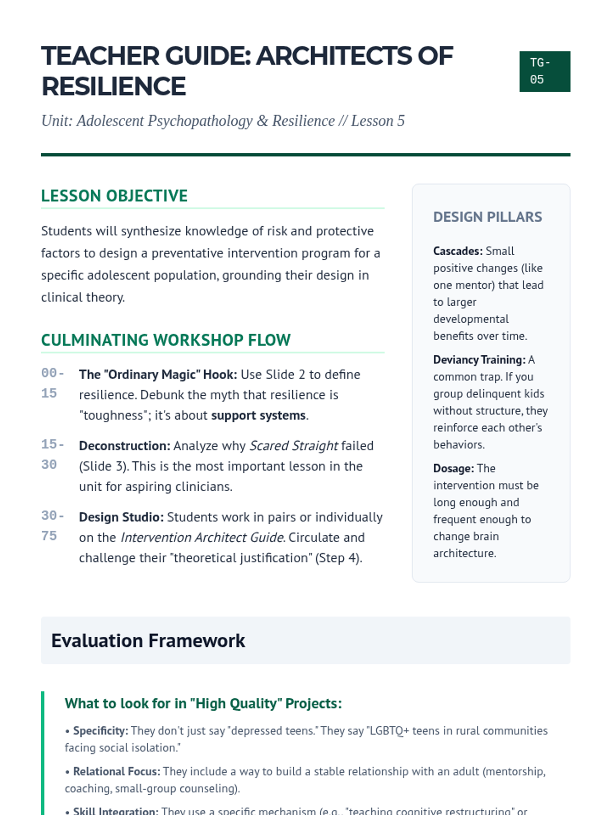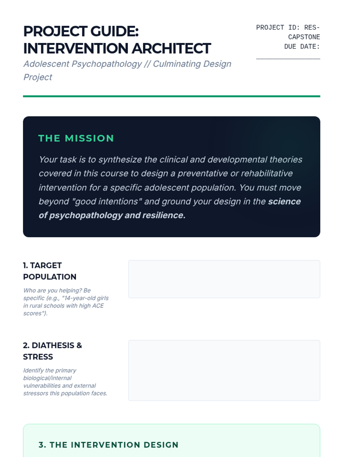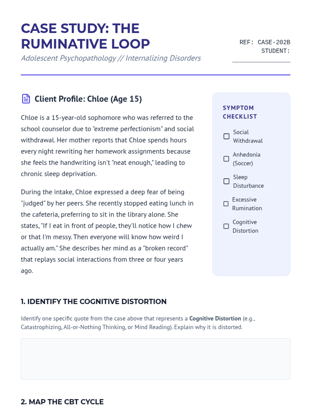 A comprehensive exploration of adolescent mental health, focusing on the distinction between normative developmental shifts and clinical psychopathology. Students apply the diathesis-stress model to internalizing and externalizing disorders, analyze the impact of trauma, and design evidence-based resilience interventions.