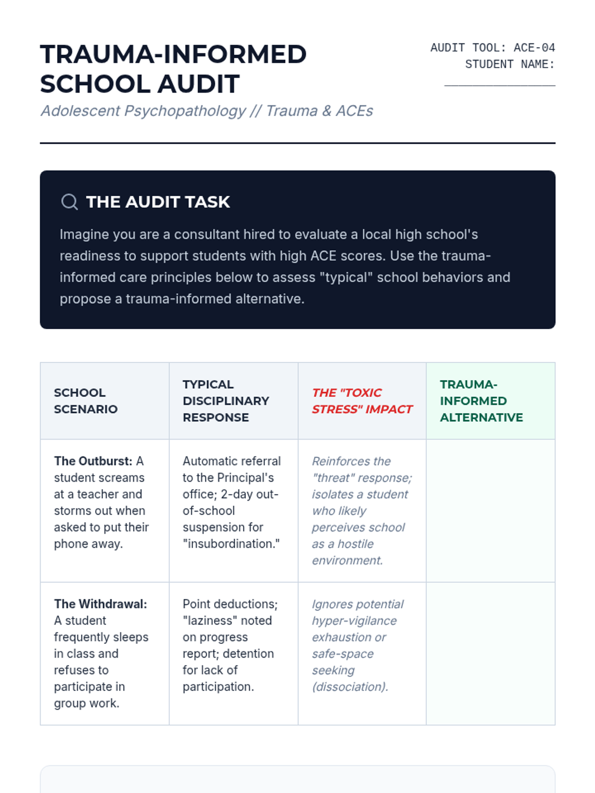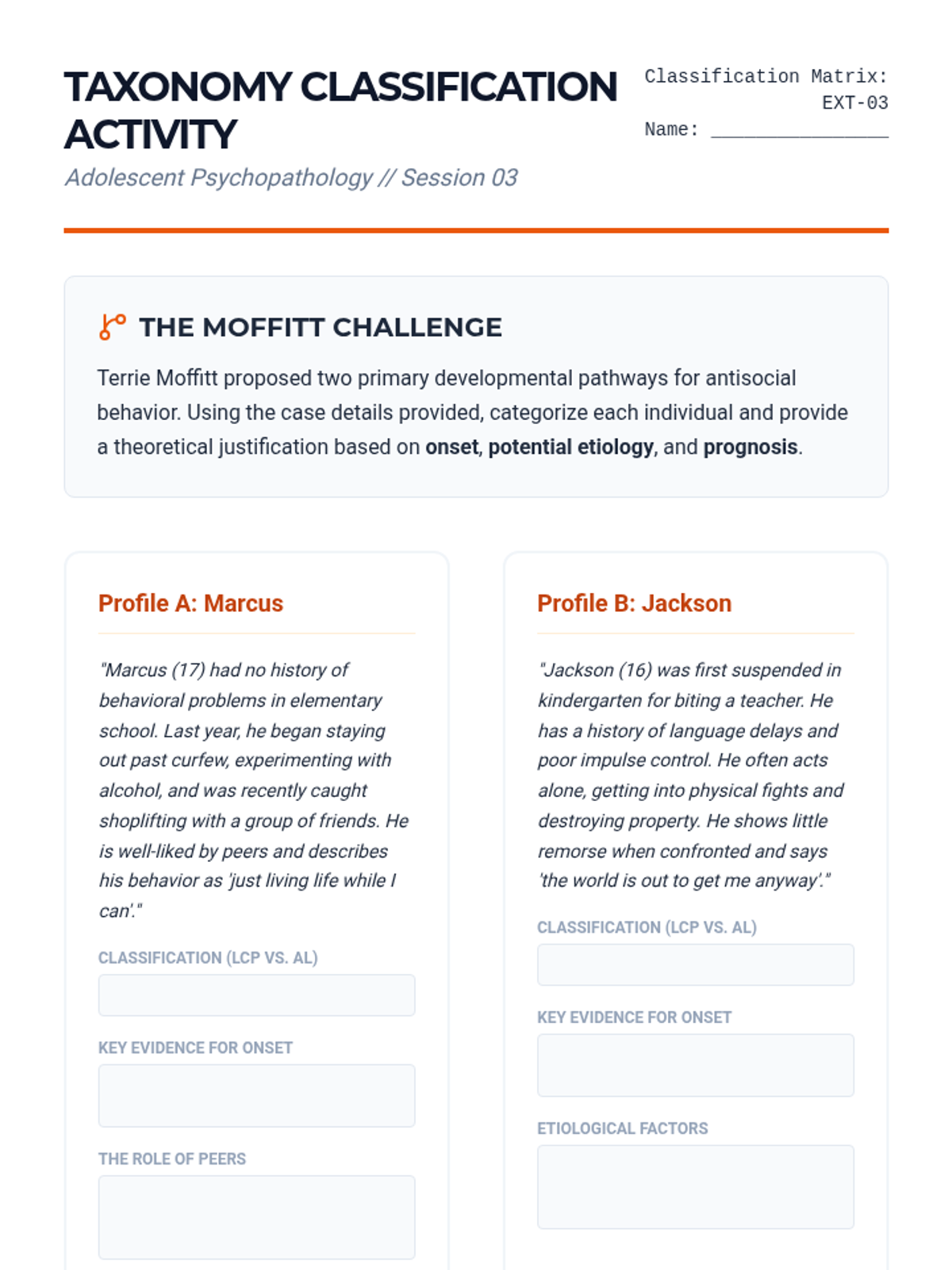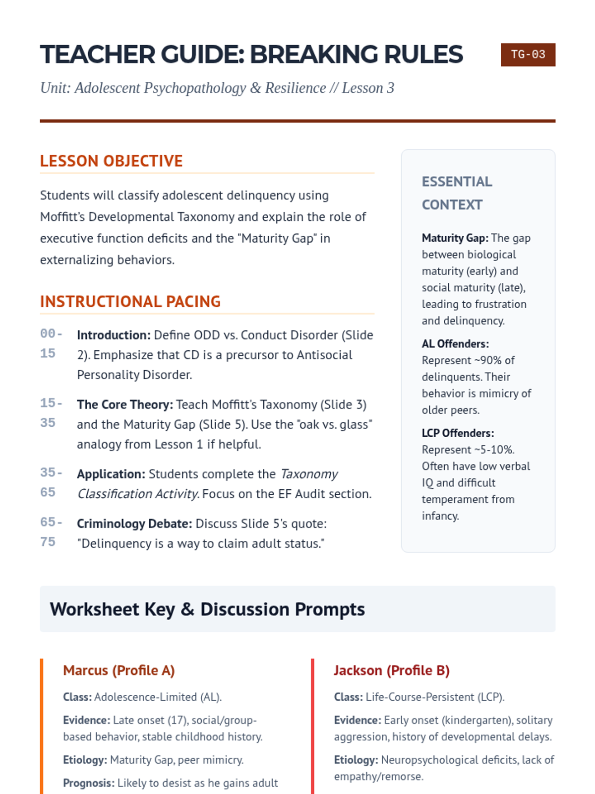 A comprehensive exploration of adolescent mental health, focusing on the distinction between normative developmental shifts and clinical psychopathology. Students apply the diathesis-stress model to internalizing and externalizing disorders, analyze the impact of trauma, and design evidence-based resilience interventions.