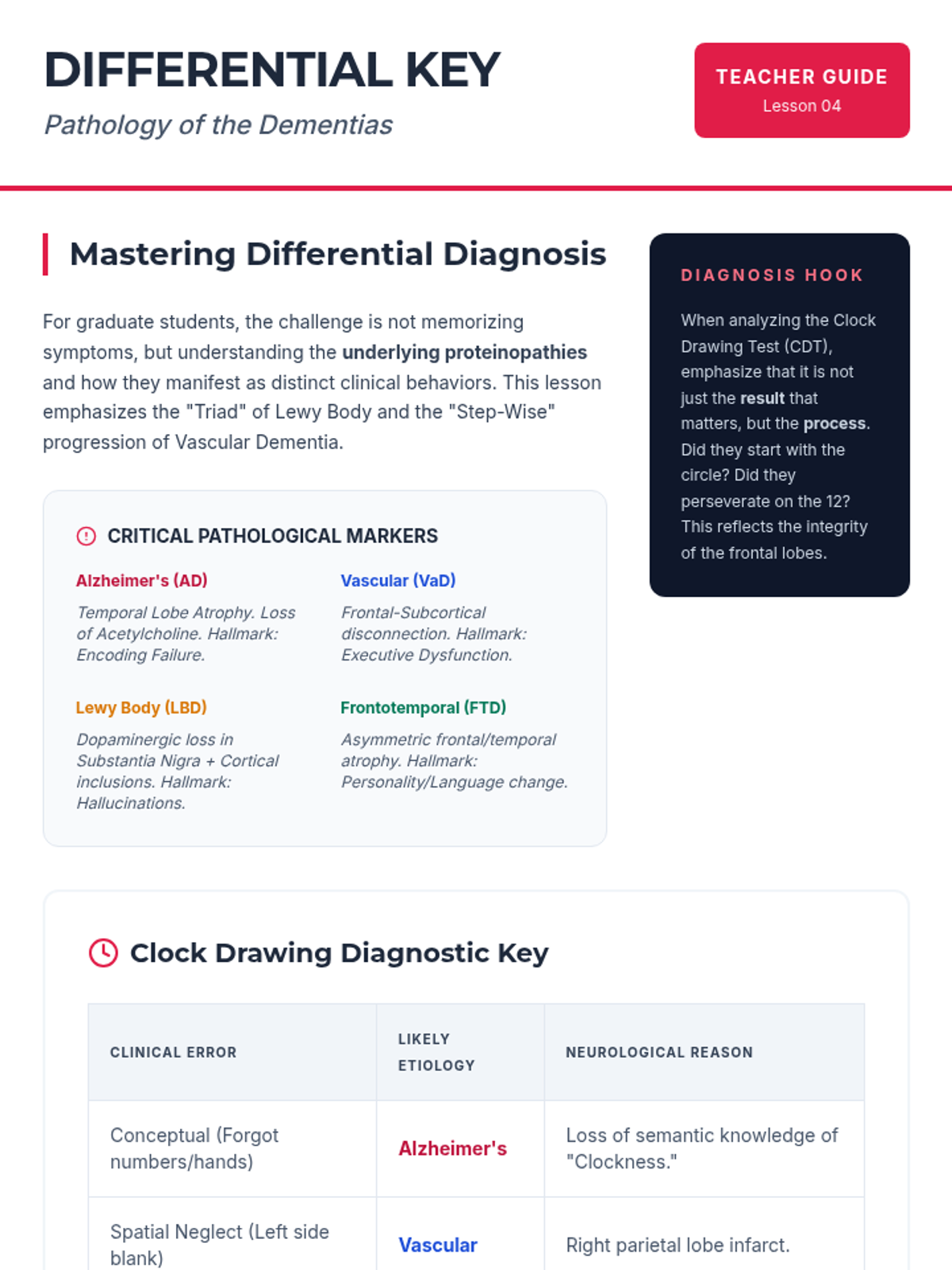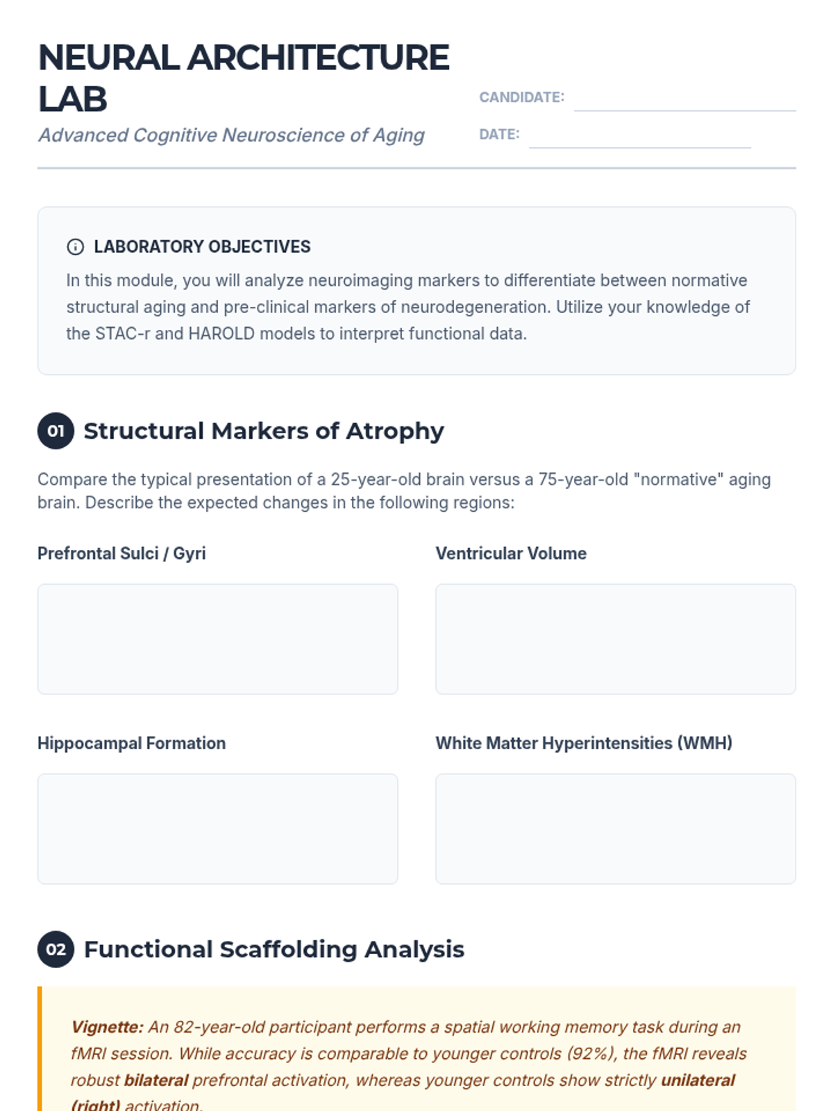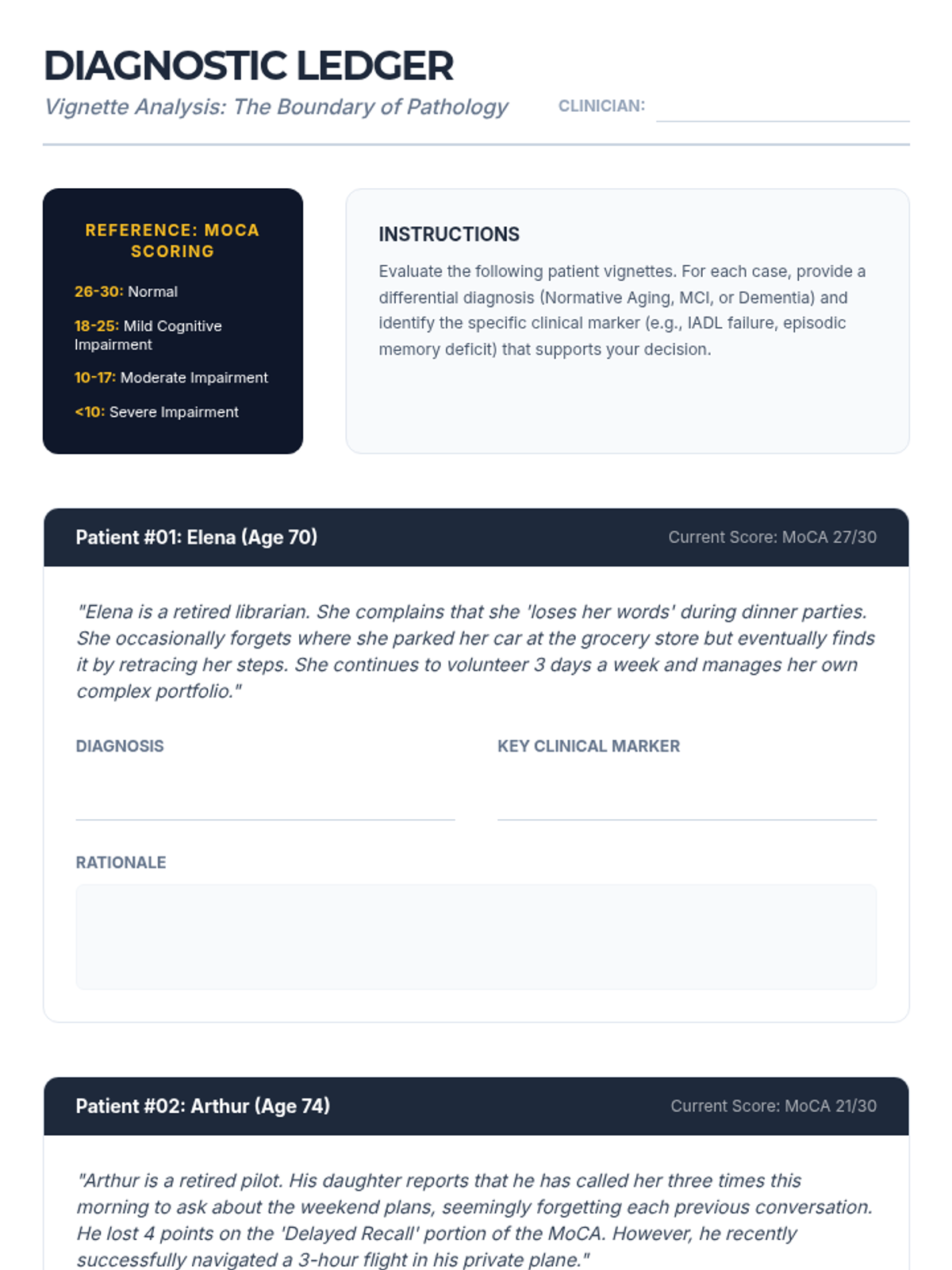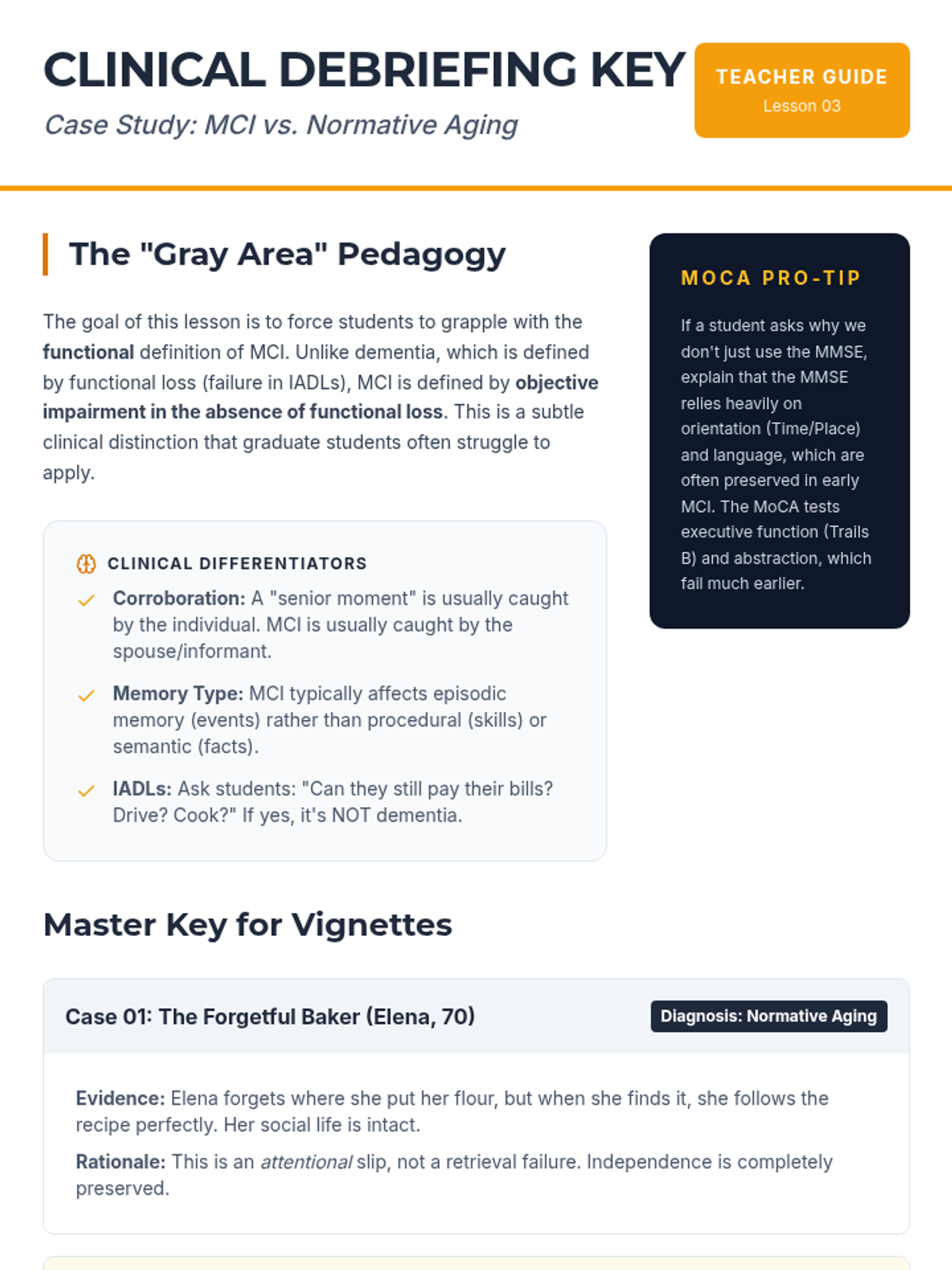 A graduate-level exploration of the clinical boundary between normal cognitive aging and neurodegenerative pathology. This sequence covers neurobiological changes, psychometric trajectories, diagnostic criteria for MCI, and the differential pathology of major dementias, concluding with the cognitive reserve hypothesis.