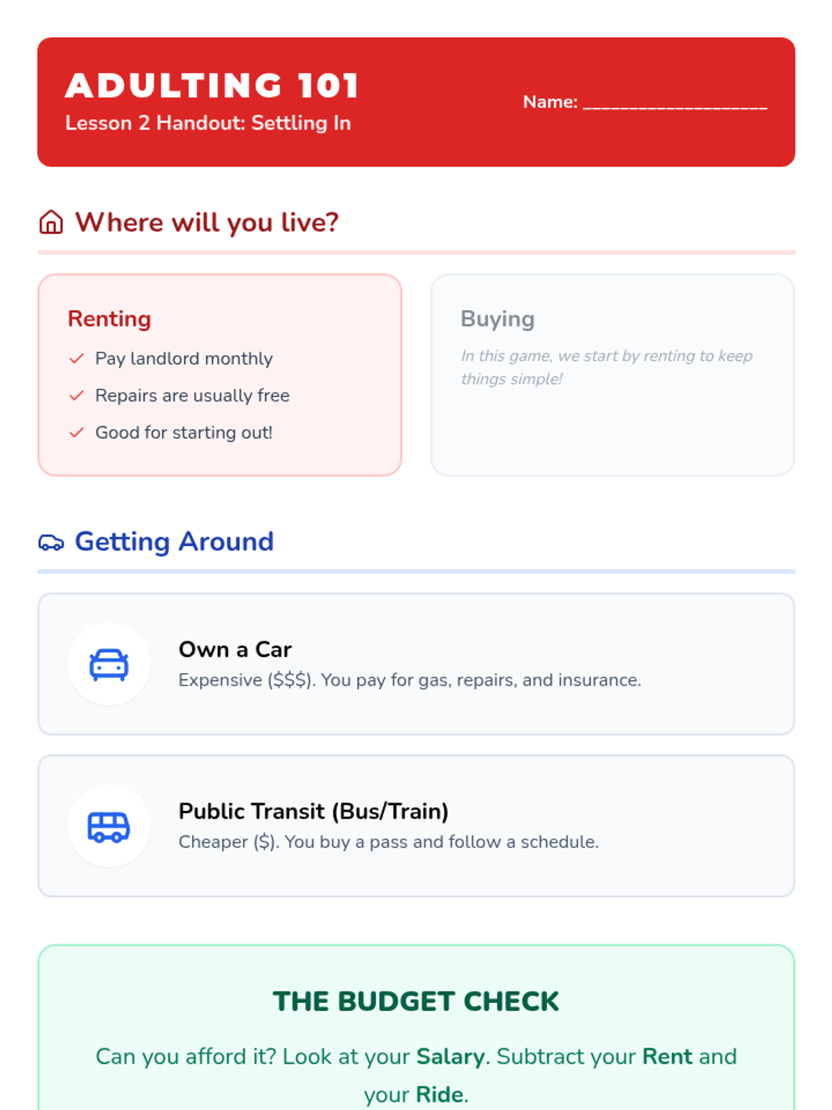 A comprehensive 'Game of Life' style curriculum designed for high school students with 5th-grade reading levels. It focuses on financial literacy, housing, transportation, and navigating daily life through an engaging board game format.