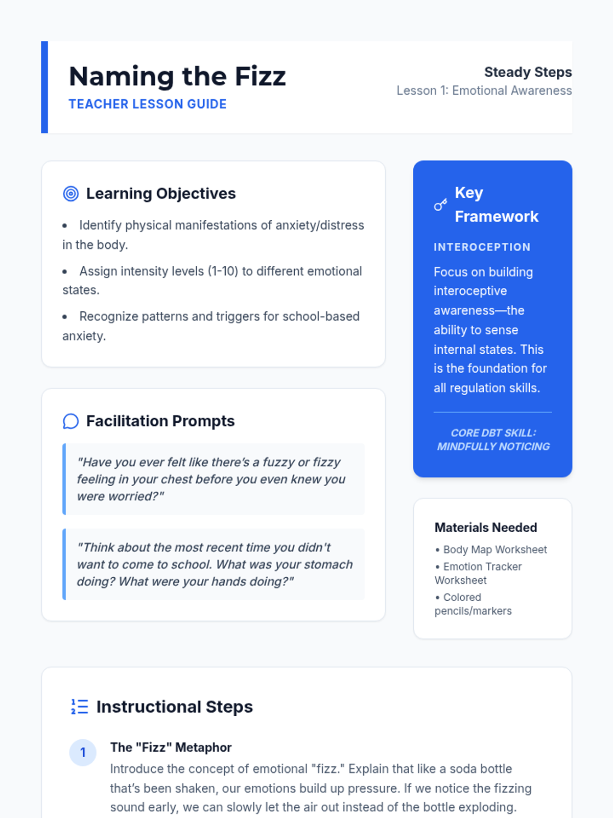 A comprehensive therapeutic sequence focused on building emotional resilience, distress tolerance, and overcoming school avoidance using CBT and DBT principles.