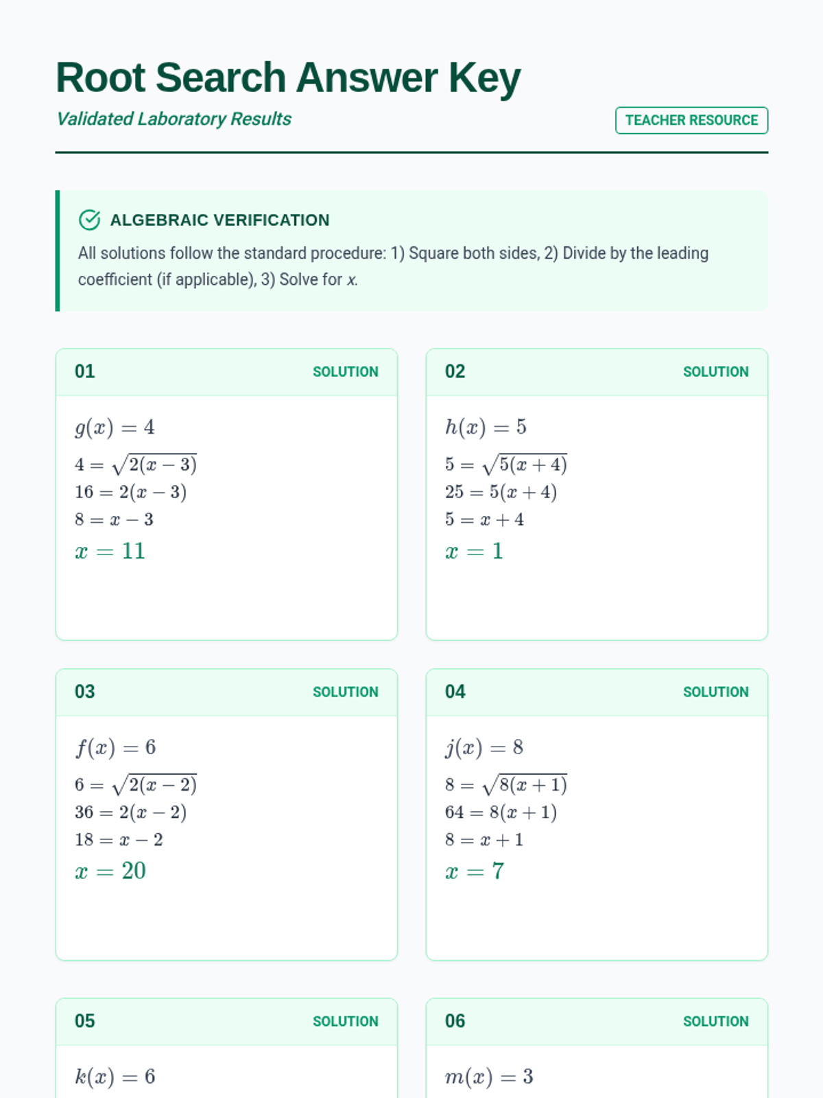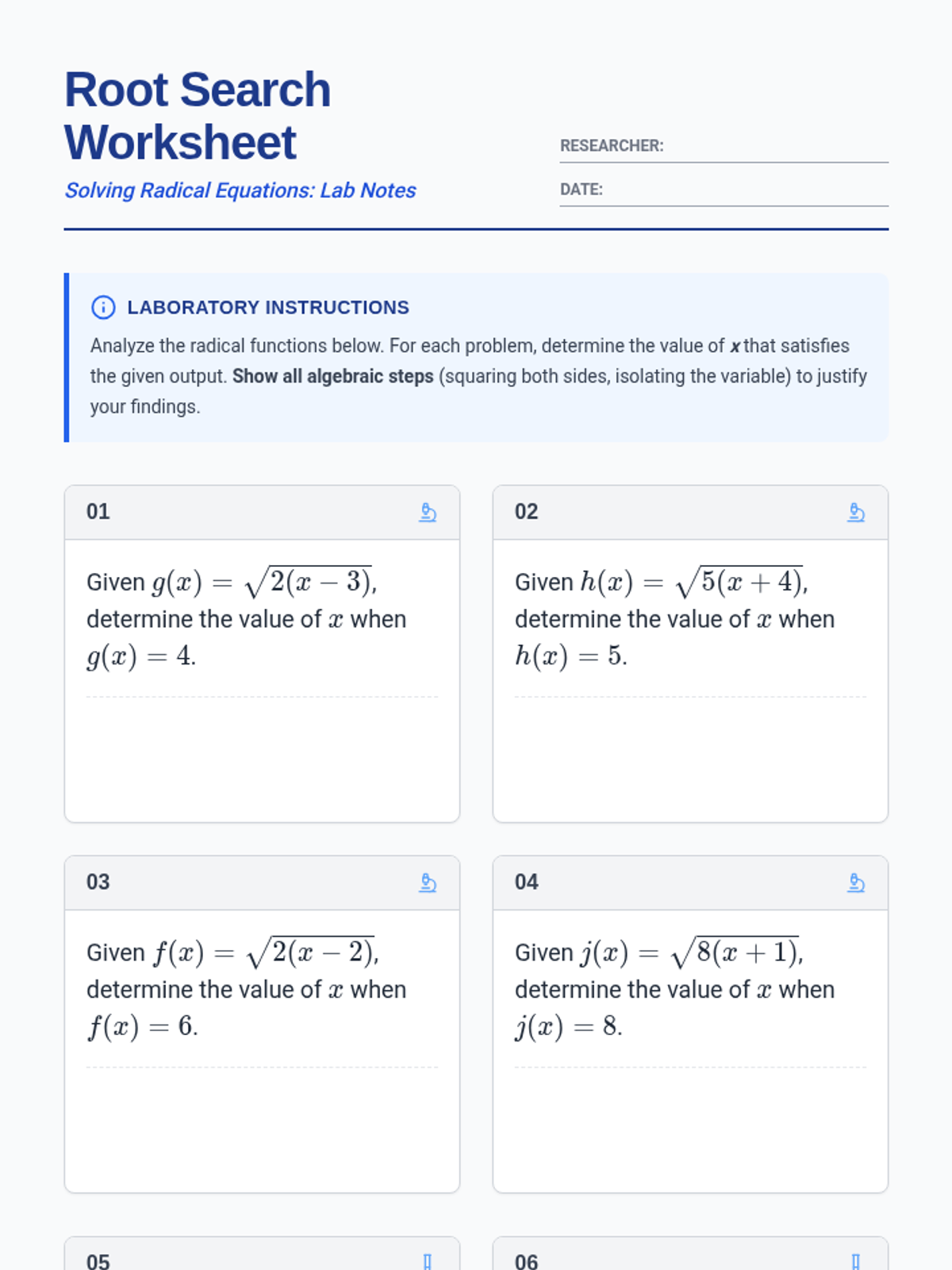 A sequence exploring radical functions, focusing on solving radical equations through algebraic manipulation and function notation.