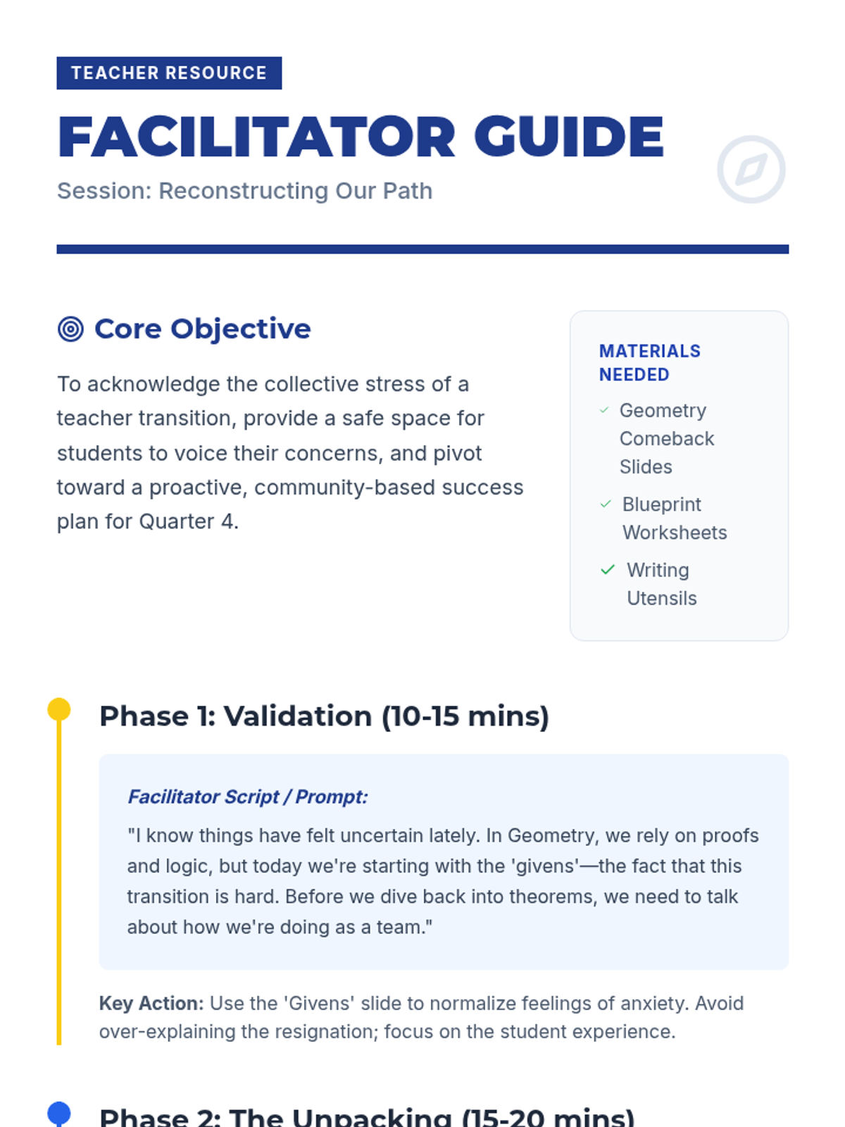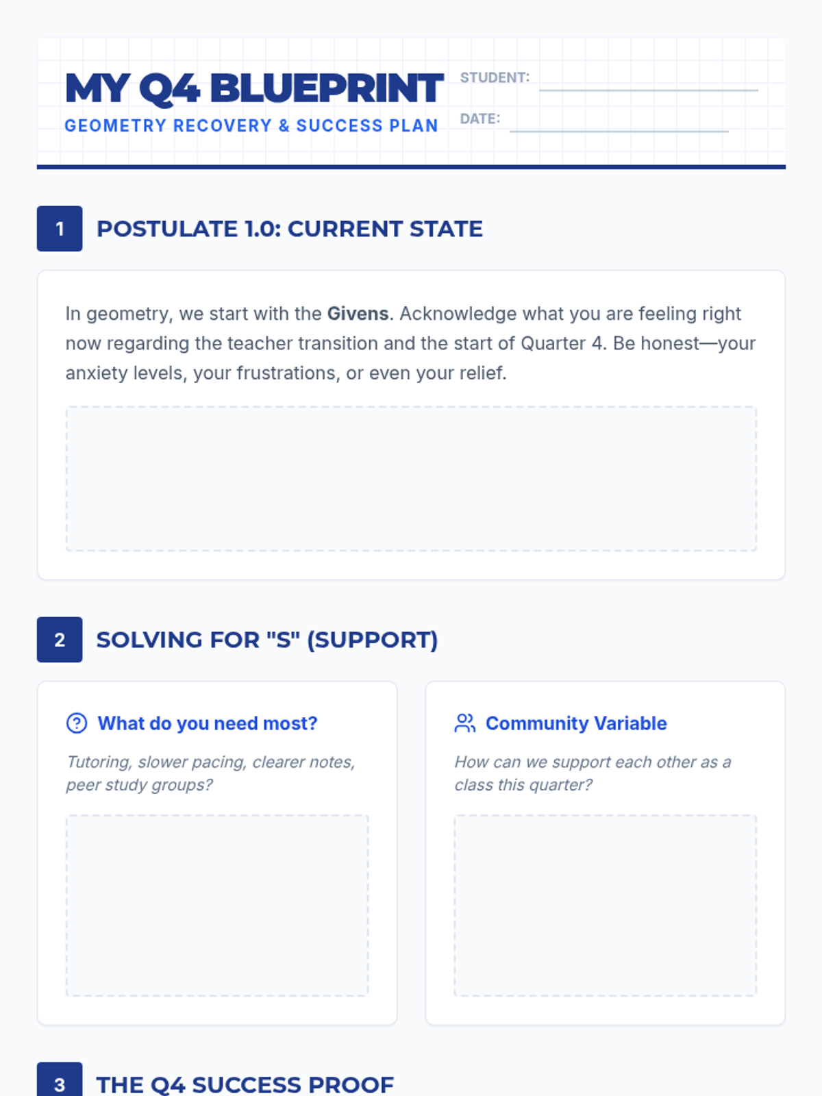 A supportive sequence designed to help Geometry students process a teacher transition, voice their anxieties, and co-create a success plan for the final quarter.