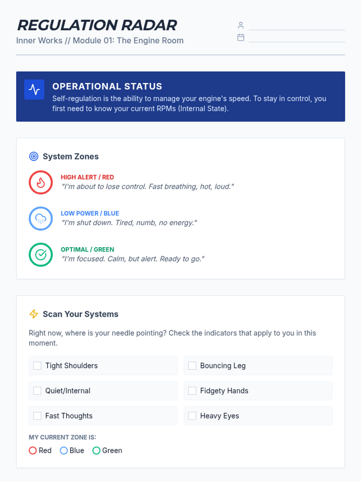 A series of four 15-minute counseling modules designed for middle and high school students. Each module focuses on a core social-emotional skill: self-regulation, coping strategies, emotional expression, and honesty, using a "Mind Mechanics" blueprint aesthetic.