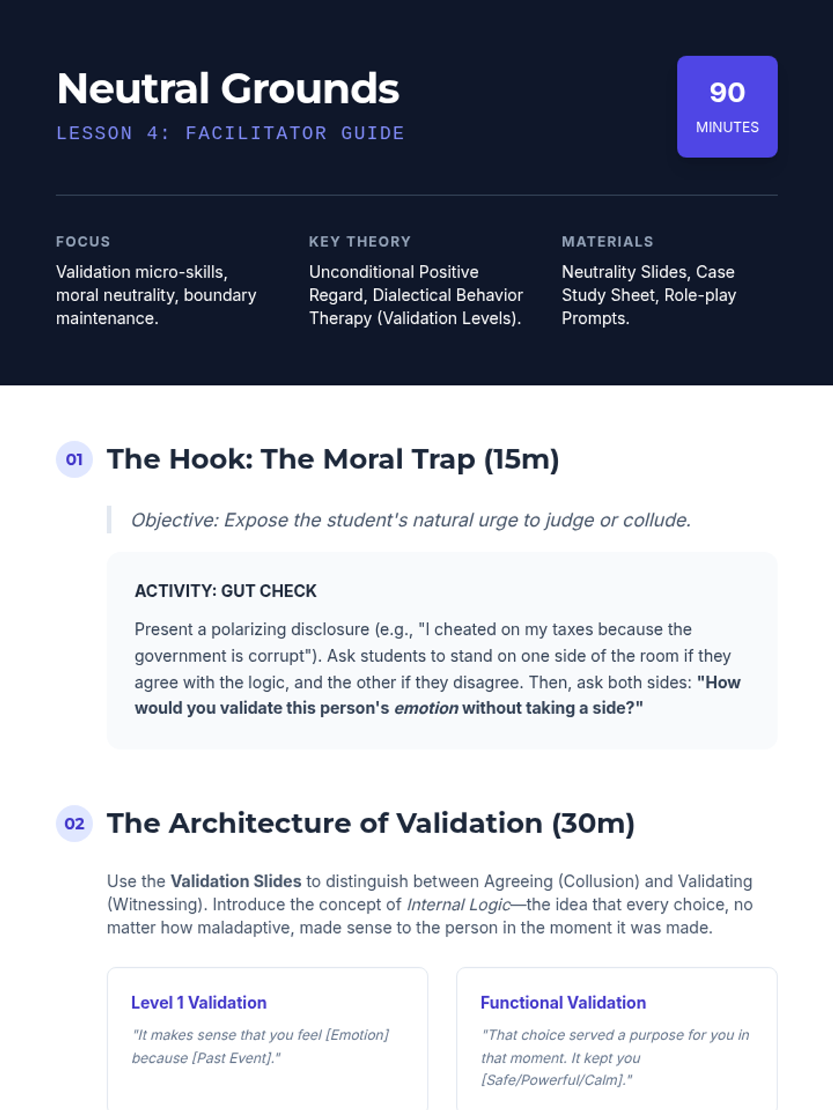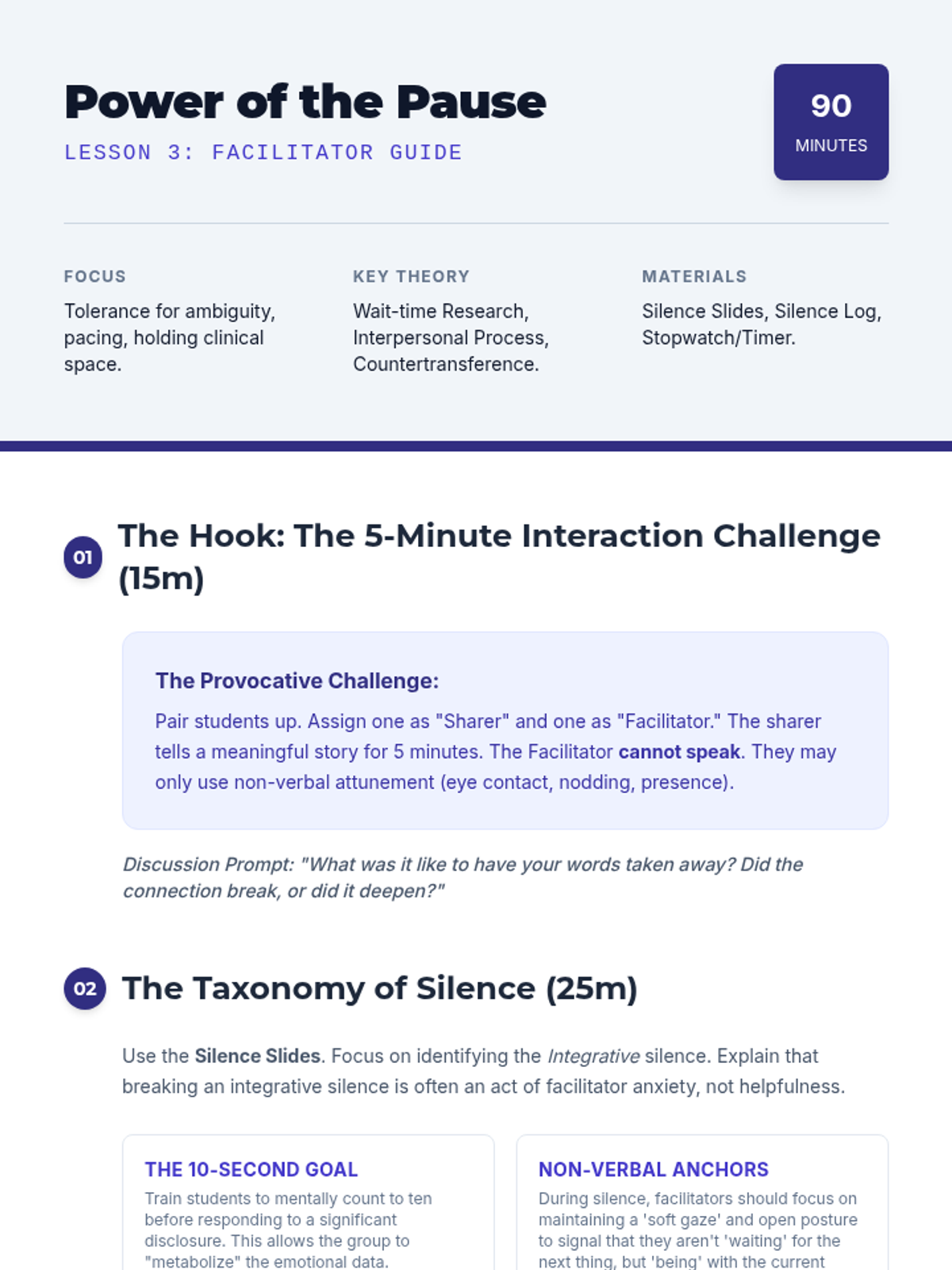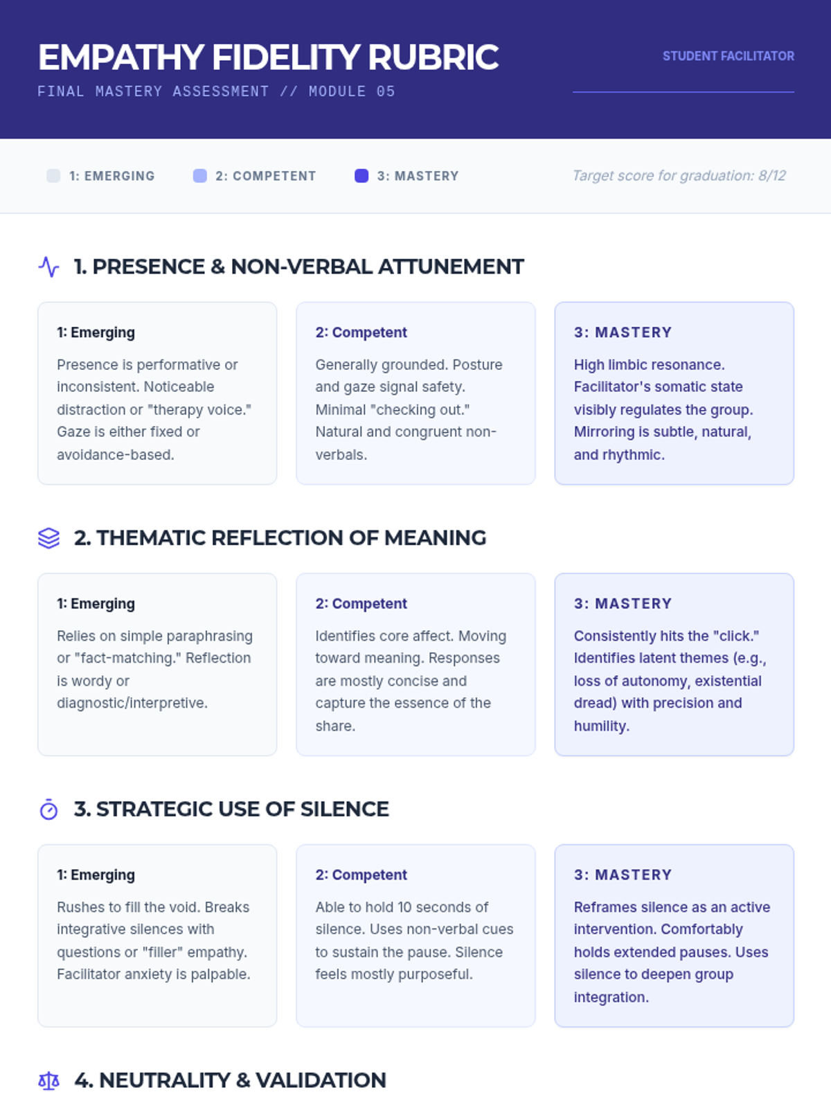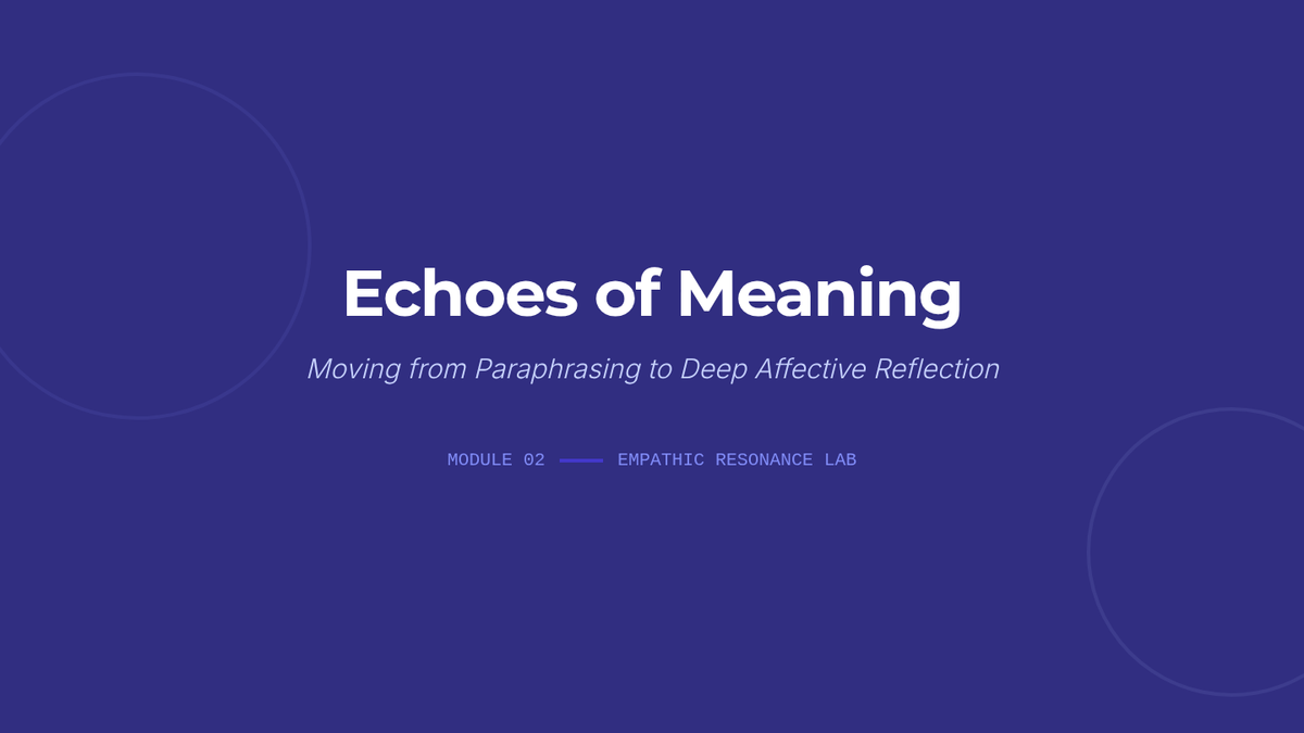 An advanced workshop sequence for graduate students focusing on the micro-skills of attunement, deep reflection, the strategic use of silence, and the clinical distinction between validation and agreement in group support settings.