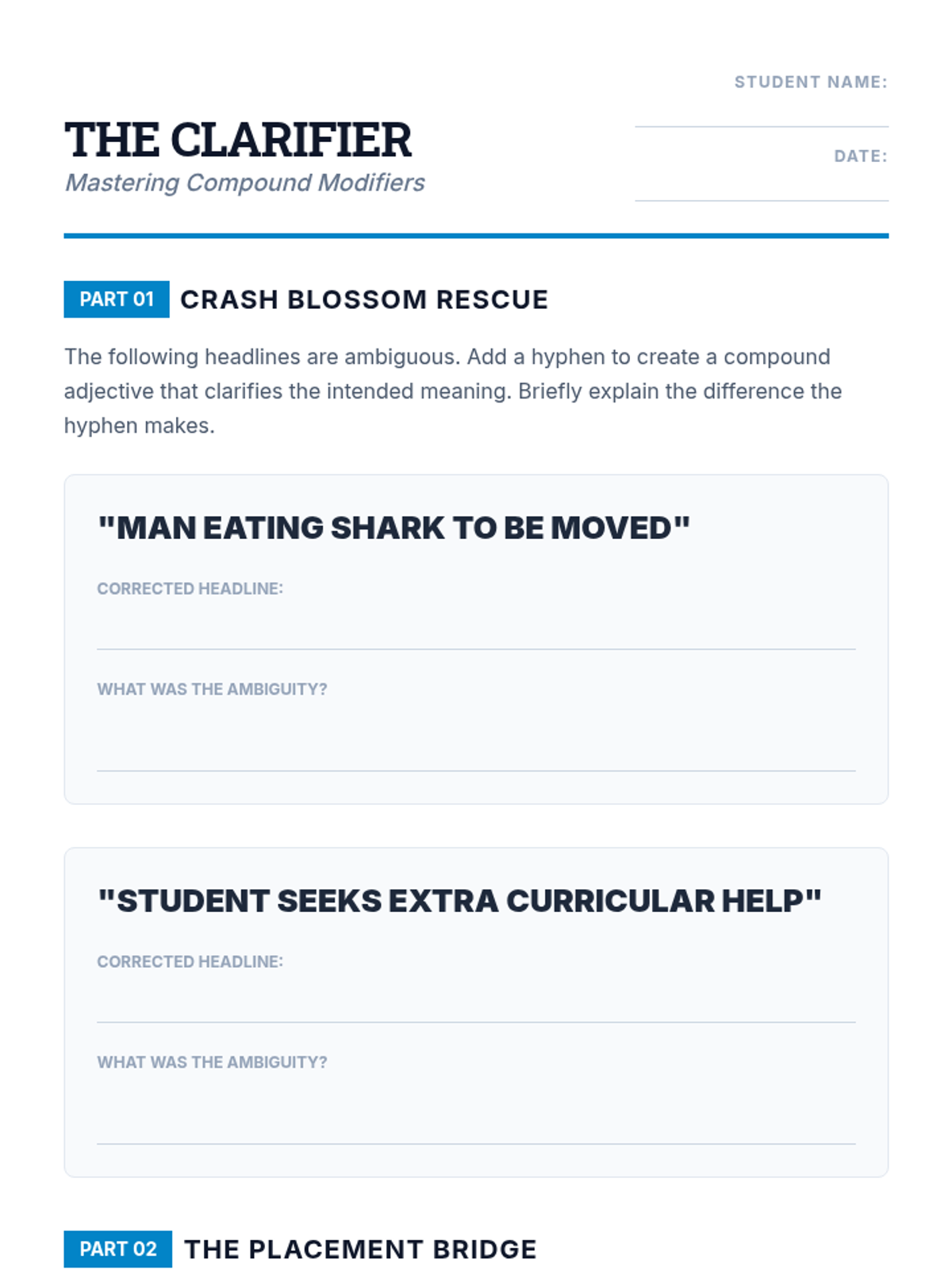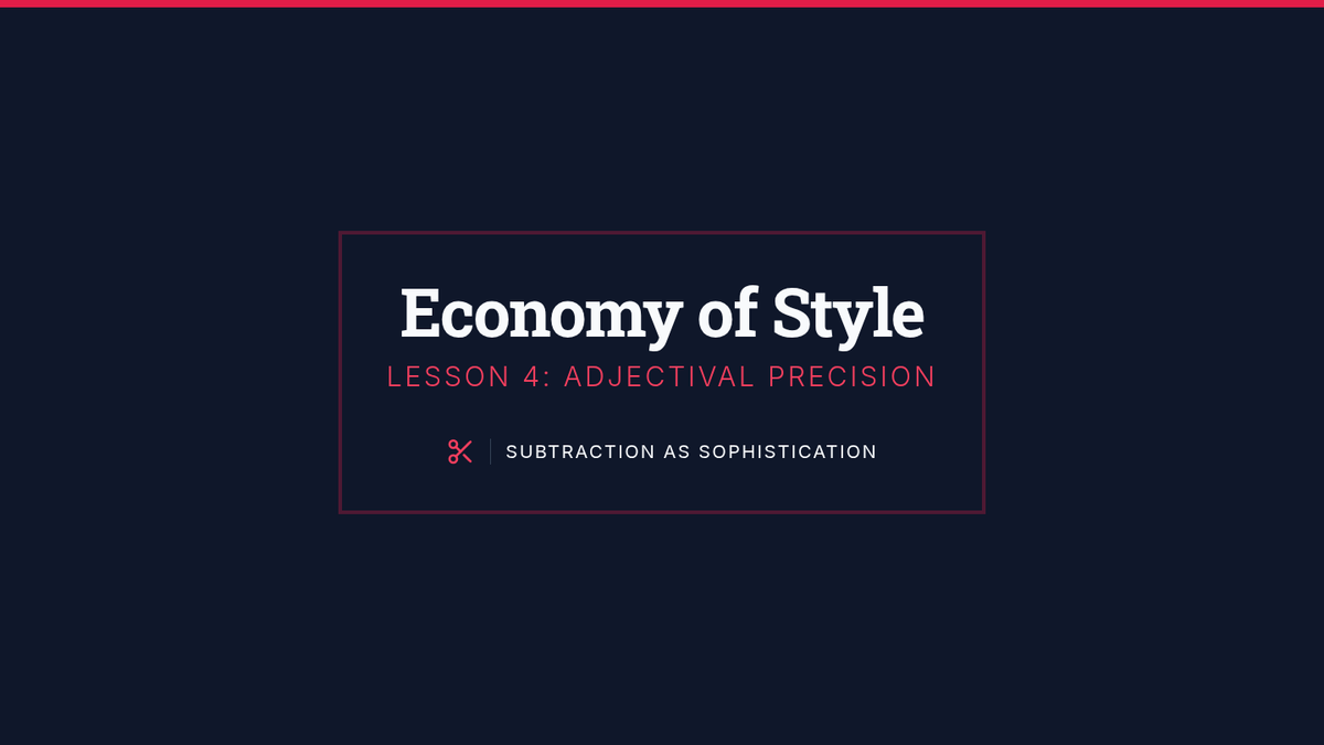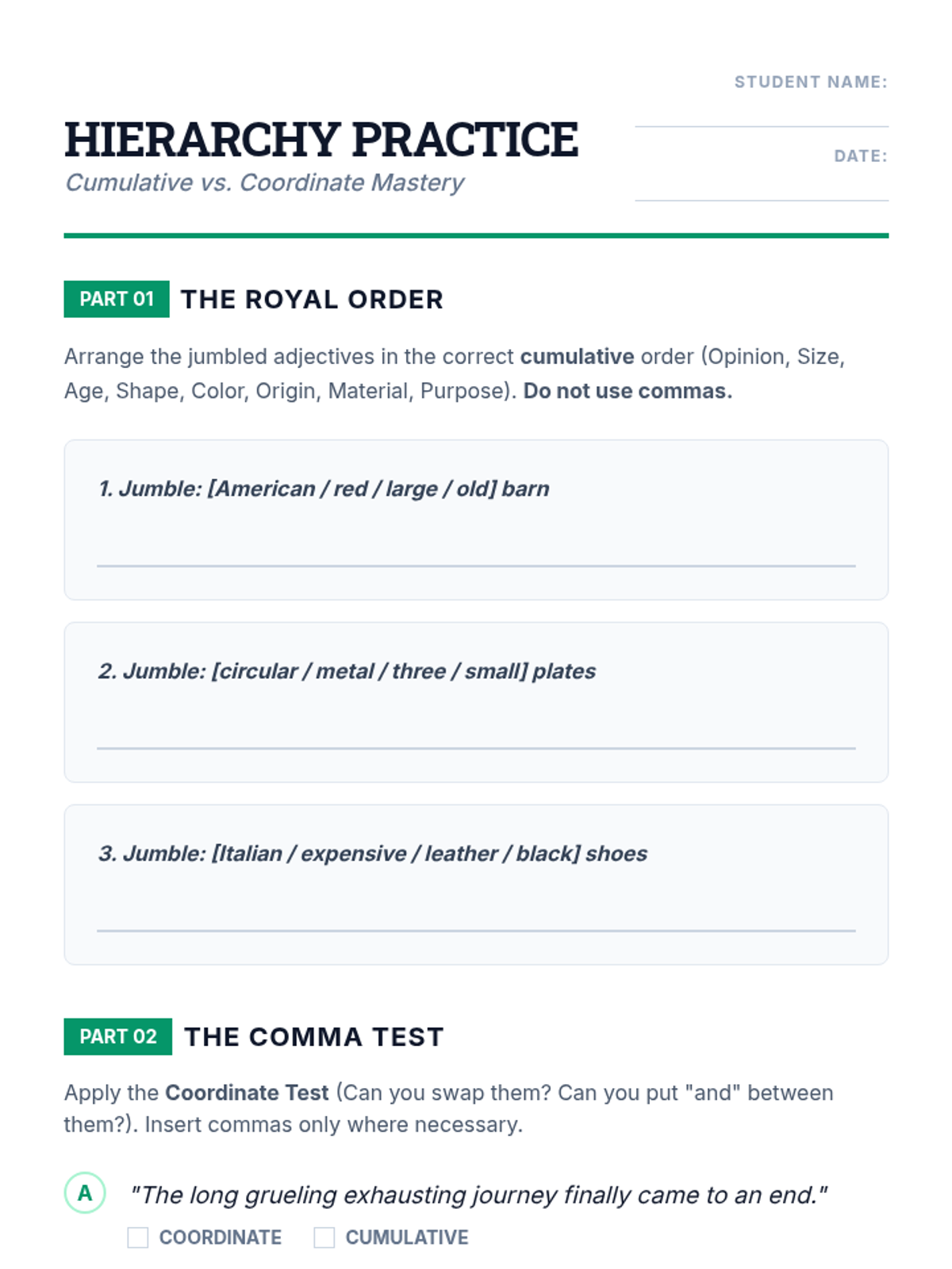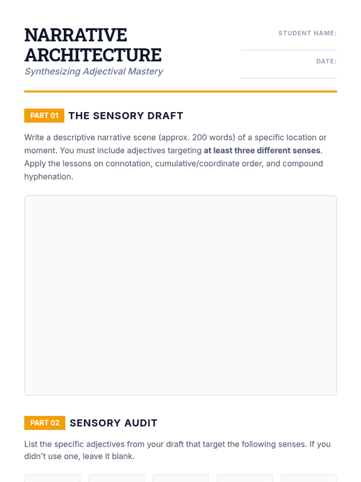 An advanced ELA sequence for 12th graders focused on the rhetorical and syntactic power of adjectives. Students progress from analyzing connotation and nuance to mastering complex structures like cumulative, coordinate, and compound adjectives, ultimately refining their own prose for economy and sensory precision in college-level writing.