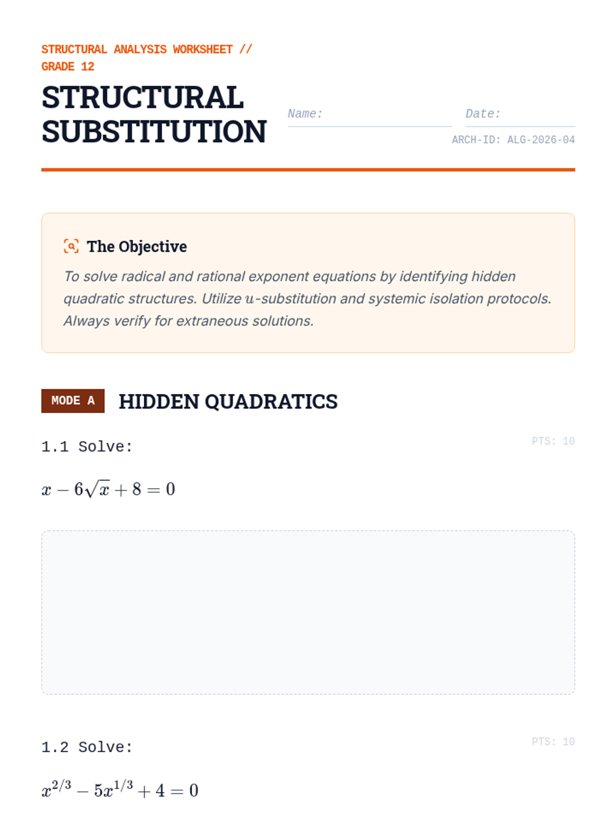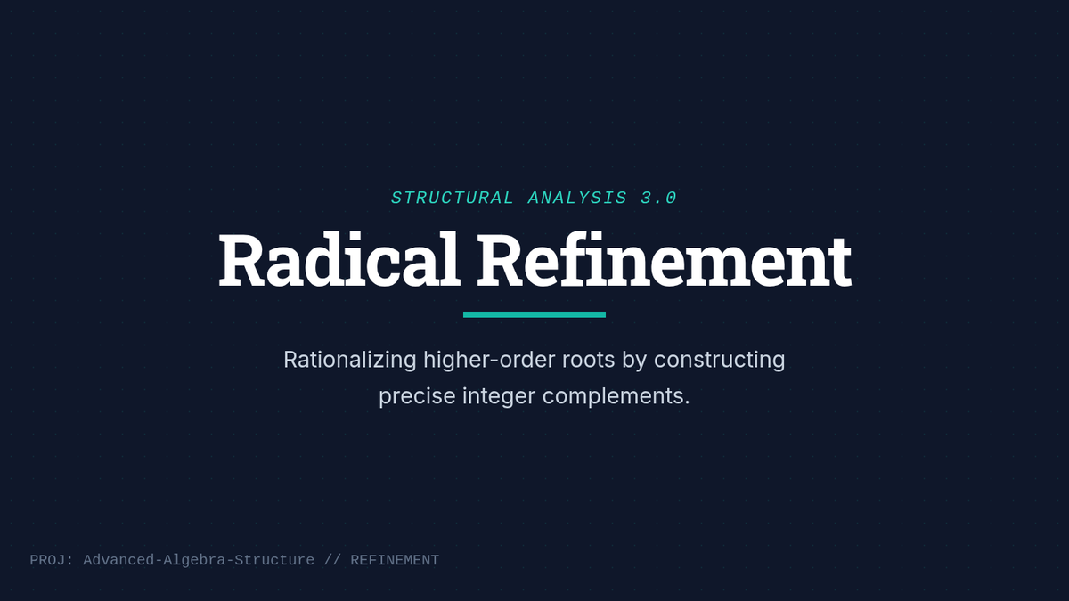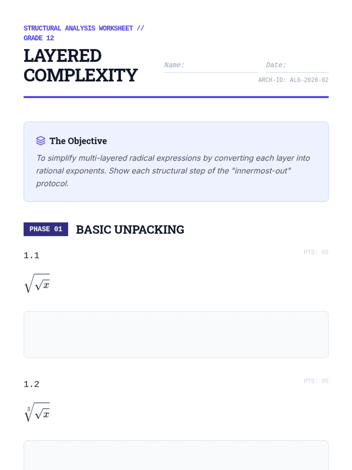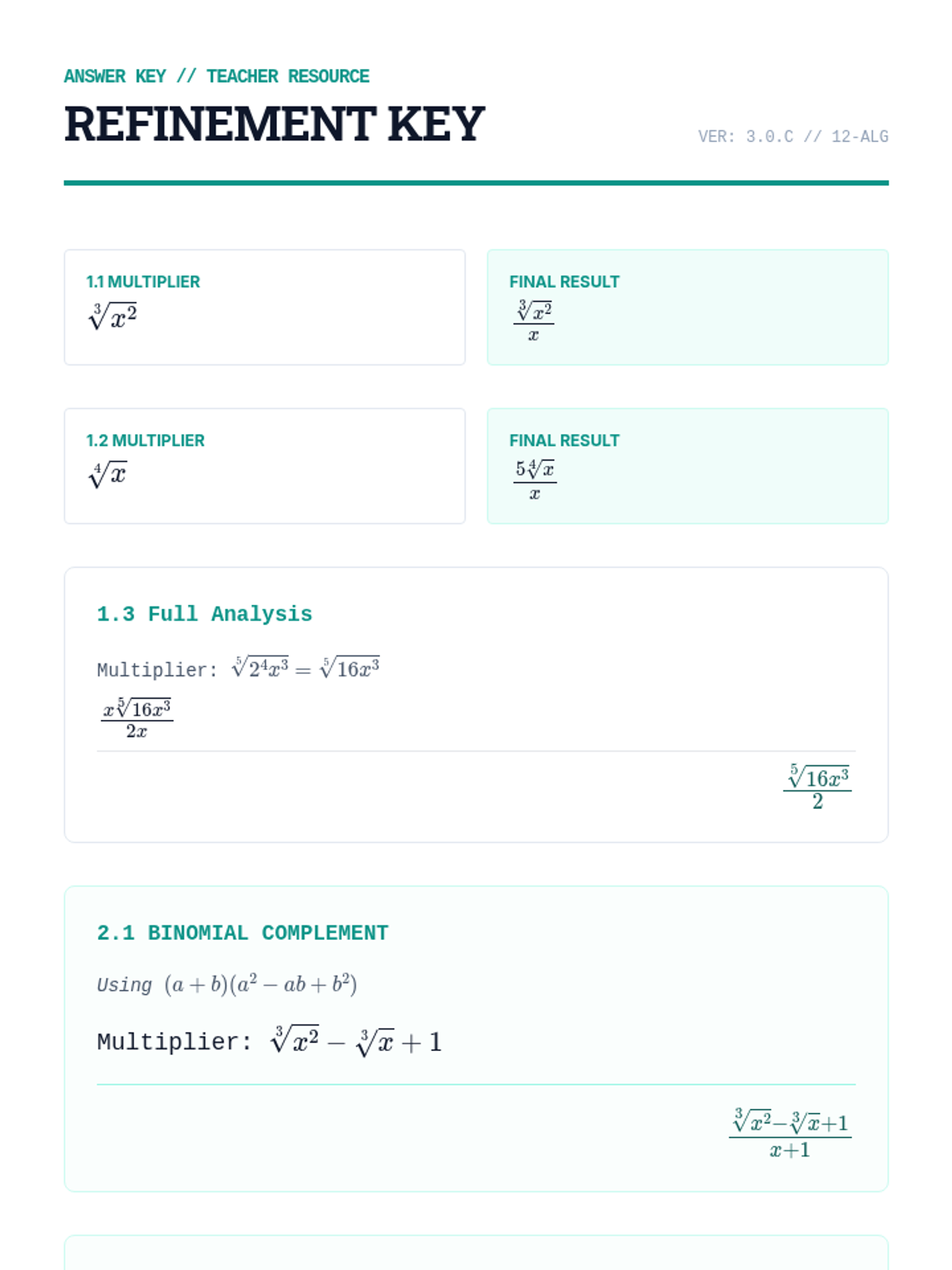 An advanced, rigorous exploration of rational exponents and radical manipulation for 12th-grade students. This sequence focuses on the technical facility required for calculus, including factoring fractional exponents, handling nested radicals, rationalizing higher-order roots, and solving equations reducible to quadratic forms.
