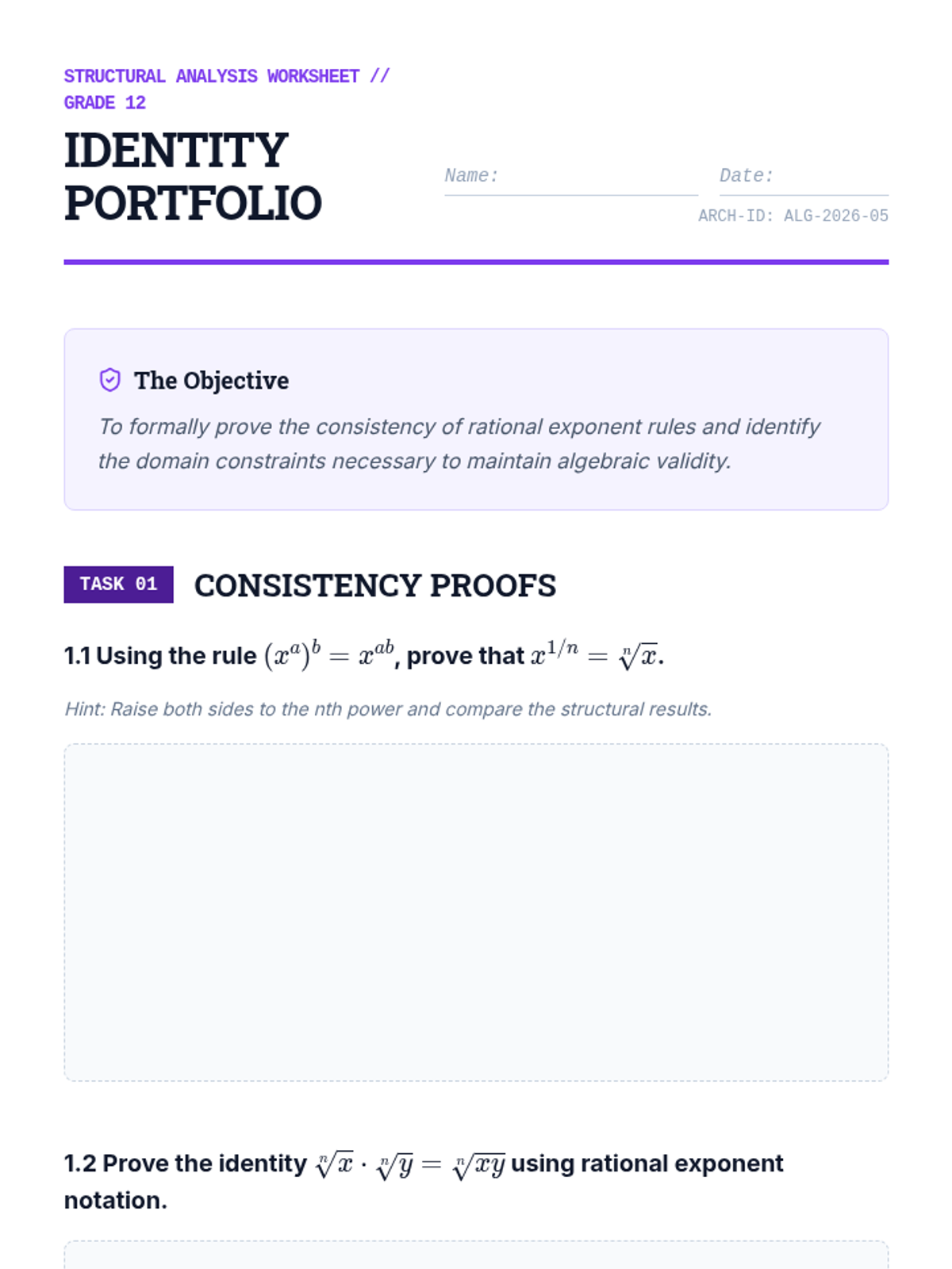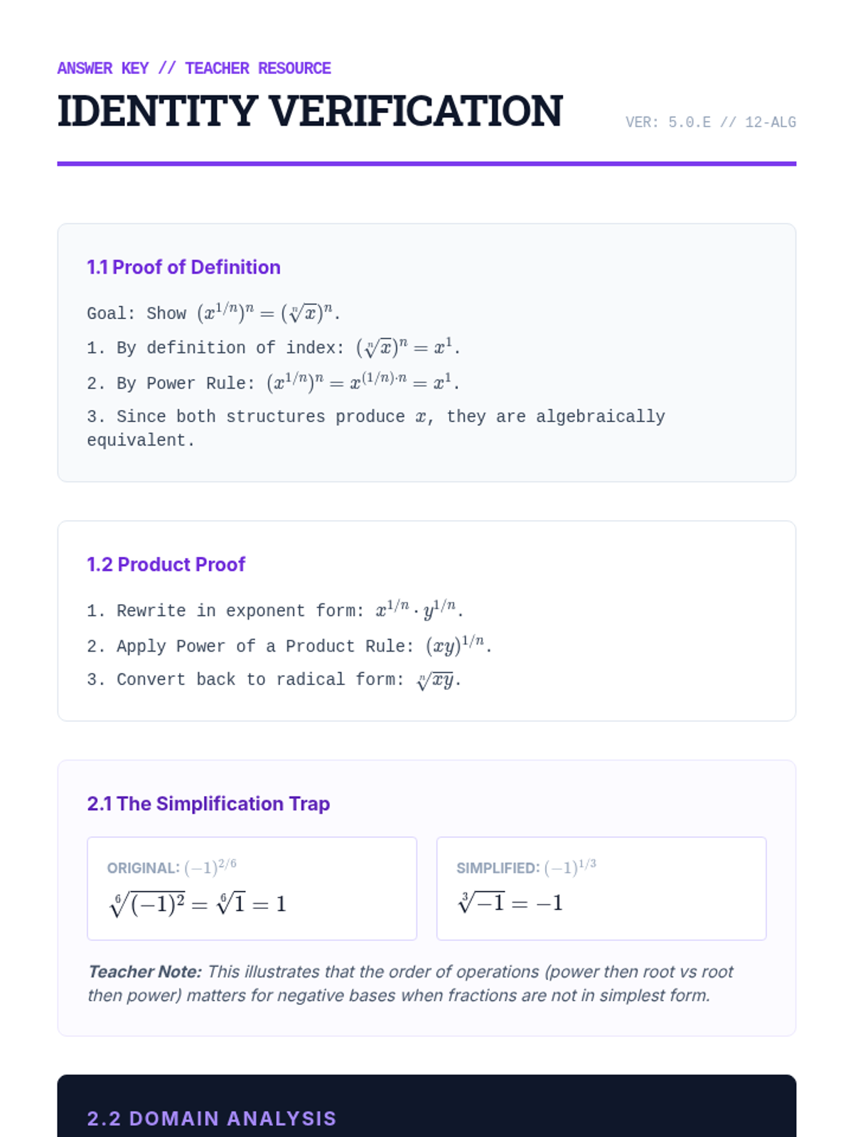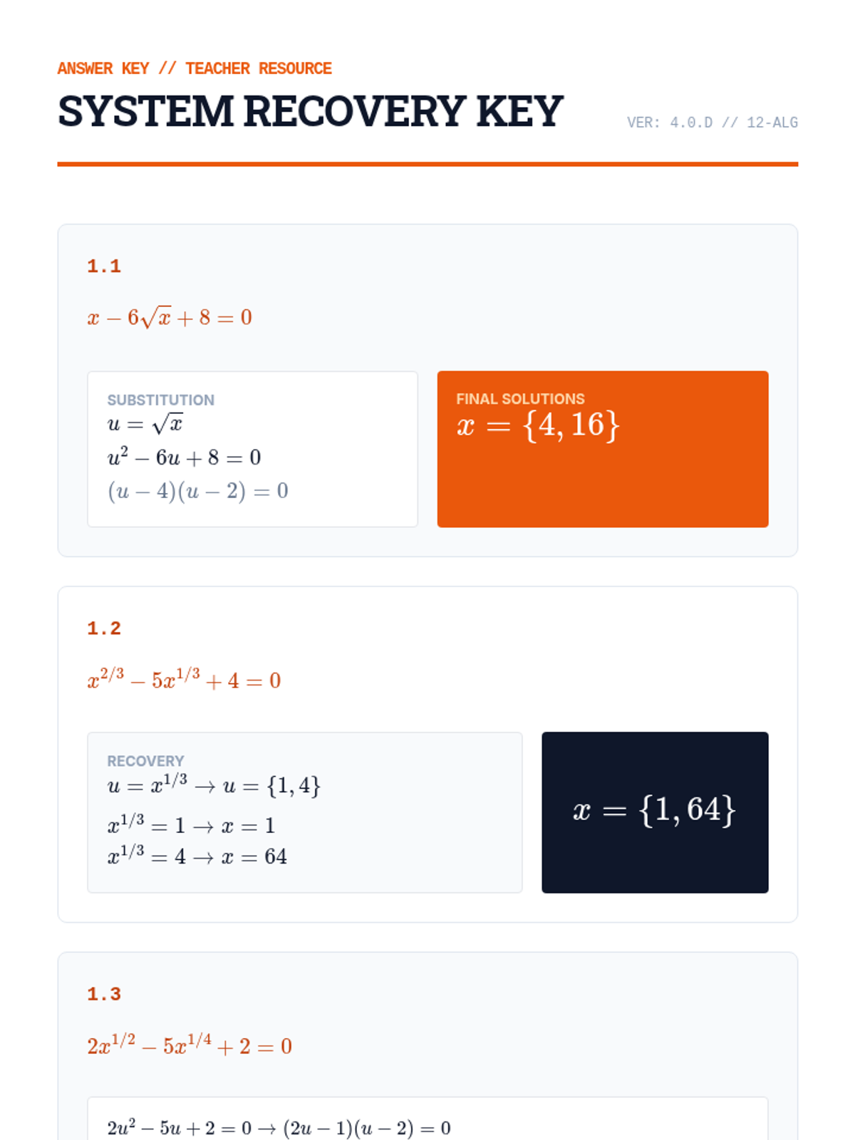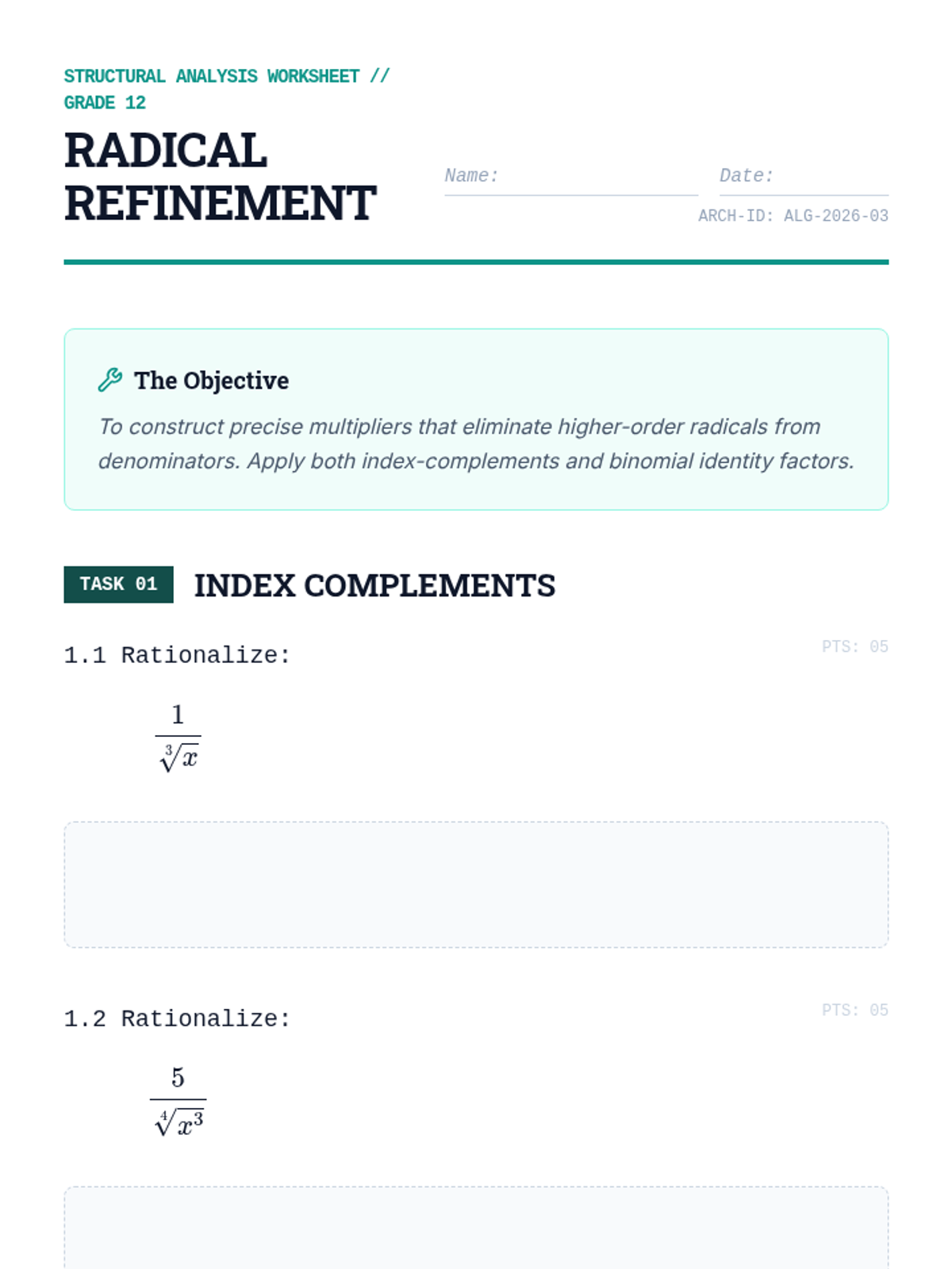 An advanced, rigorous exploration of rational exponents and radical manipulation for 12th-grade students. This sequence focuses on the technical facility required for calculus, including factoring fractional exponents, handling nested radicals, rationalizing higher-order roots, and solving equations reducible to quadratic forms.