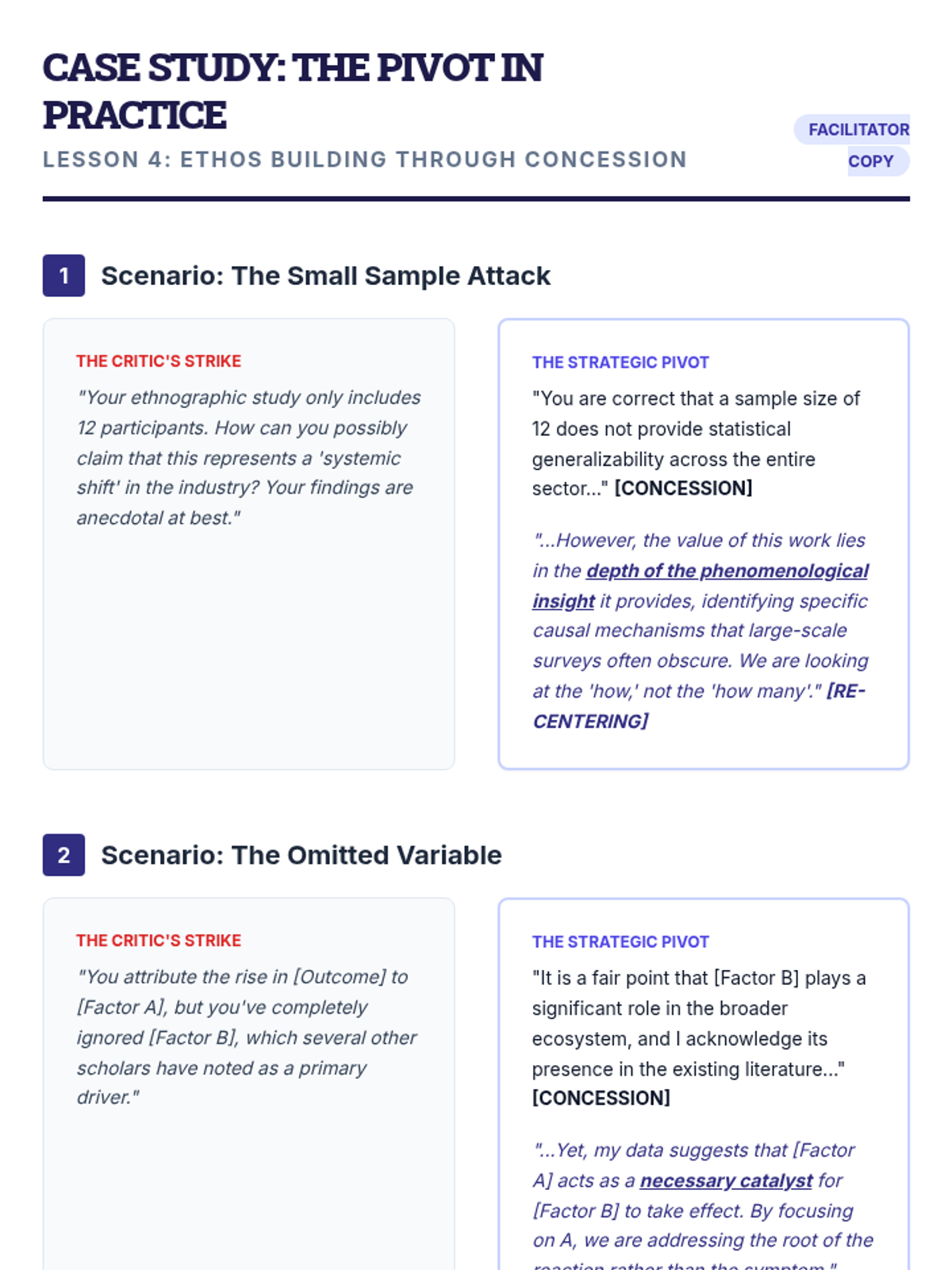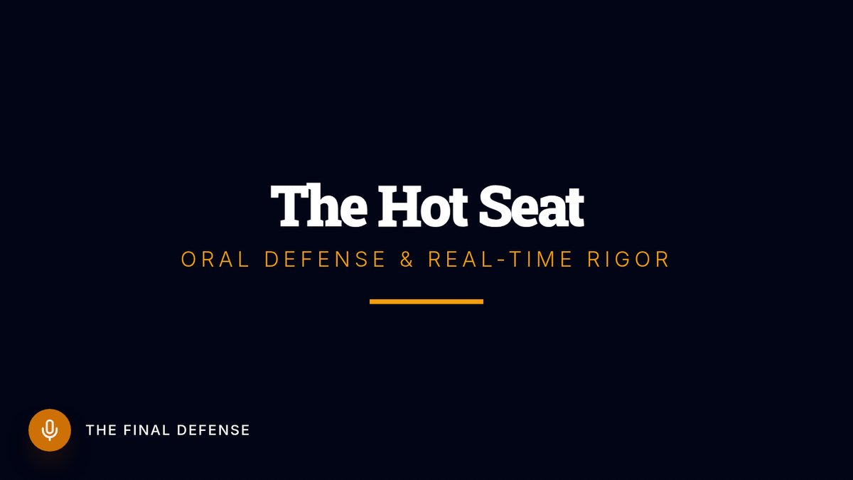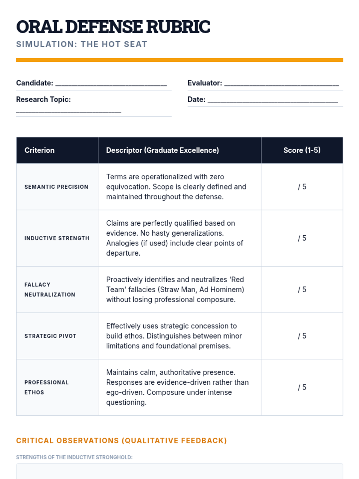 A graduate-level sequence focused on the construction of rigorous, fallacy-free arguments. Students move from thesis stress-testing to oral defense, learning to anticipate counter-attacks and use strategic concession to build unassailable academic positions.