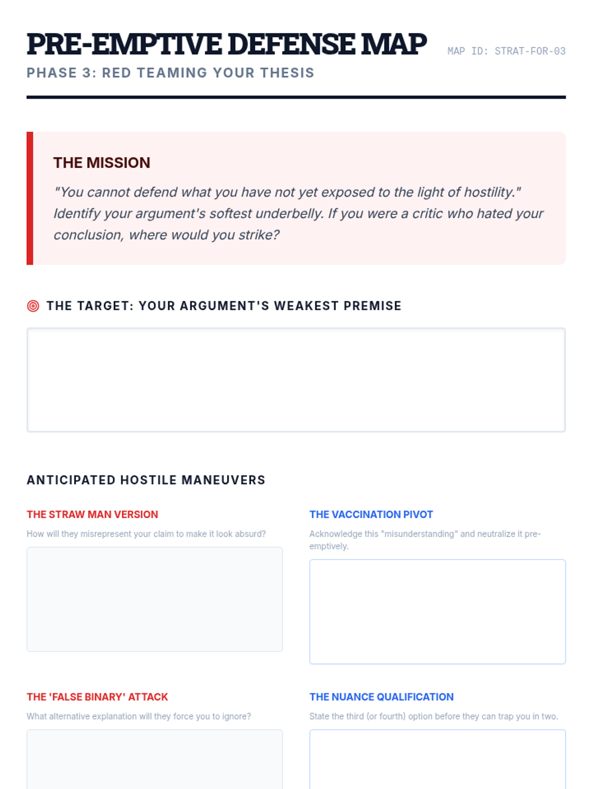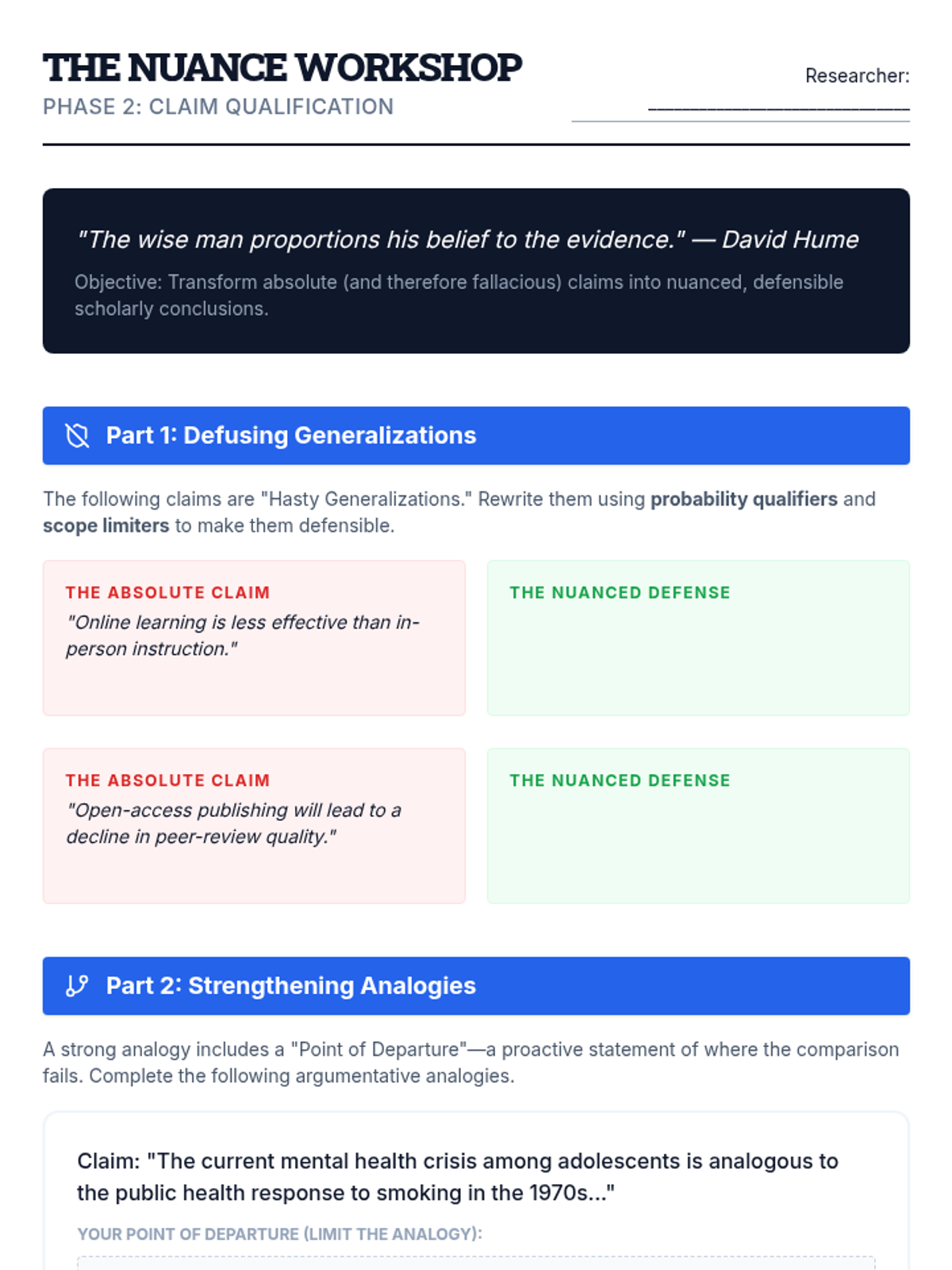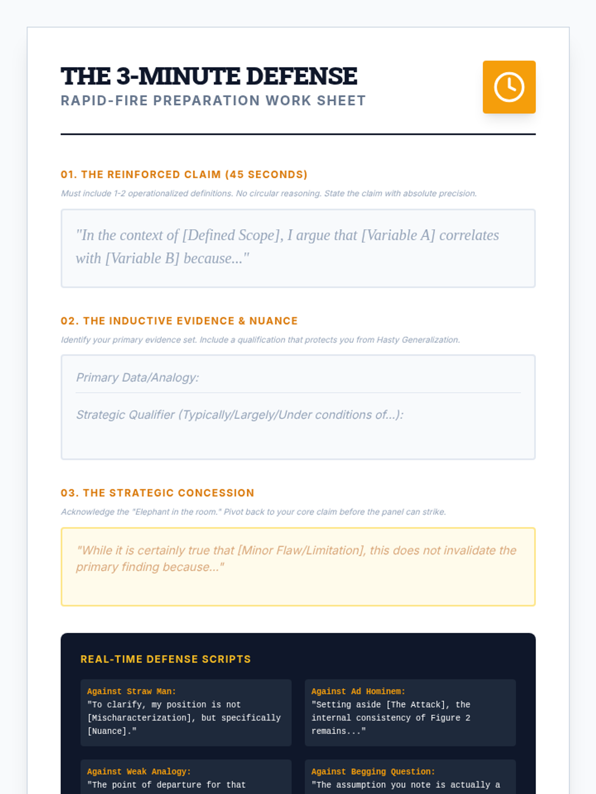 A graduate-level sequence focused on the construction of rigorous, fallacy-free arguments. Students move from thesis stress-testing to oral defense, learning to anticipate counter-attacks and use strategic concession to build unassailable academic positions.