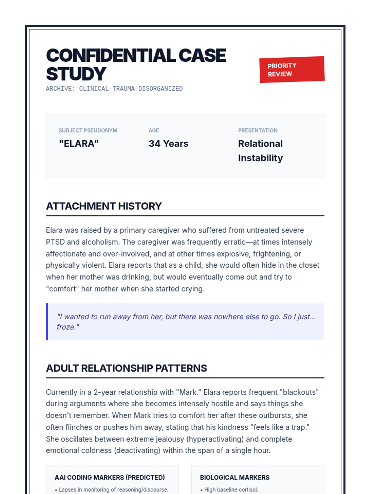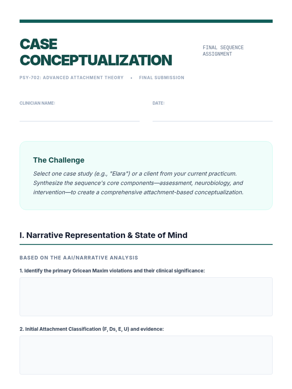 This graduate-level psychology sequence explores Attachment Theory from its developmental origins to clinical applications in adult psychotherapy. Students examine the neurobiological underpinnings of social bonding, assess adult attachment through narrative analysis, and learn evidence-based interventions for restructuring insecure bonds.